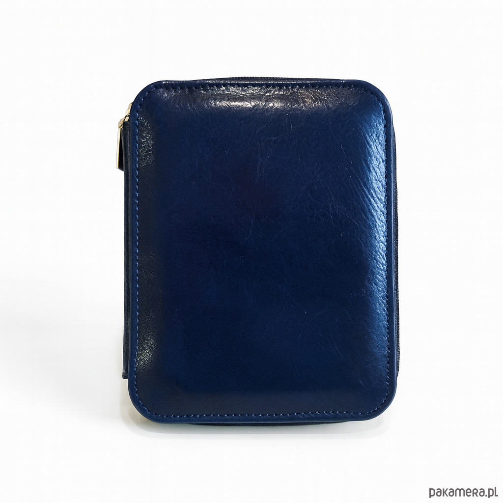 Etui wykonane z pięknej naturalnej skóry w pięknym kolorze granatowym o naturalnej fakturze. Skóra naturalna, wyprawiana roślinnie o najwyższej jakości. Piękne etui w bardzo eleganckim kształcie . Etui jest zamykane za zamek błyskawiczny, uchwyty na pióra wykonane są z elastycznej gumki co daje możliwość umieszczenia piór o różnej grubości. Etui w środku wykonane jest z miękkiego materiału w kolorze czarnym, ma welurową kurtynę aby pióra były zabezpieczone. i dodatkową kieszonkę na wizytówki. Etui robione ręcznie przy użyciu tradycyjnych metod kaletniczych, zgodnych ze starą sztuką rzemieślniczą. Wymiary 13,5cmx16cmx3cm