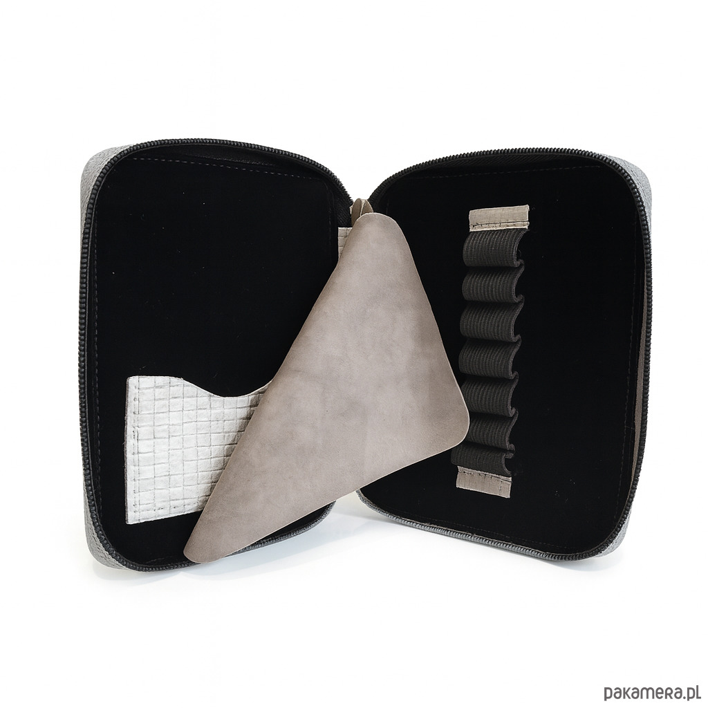 Etui wykonane z pięknej naturalnej skóry welurowej w kolorze popielatym o tłoczonej fakturze ładnej kratki. Skóra naturalna, najwyższej jakości. Piękne etui w bardzo eleganckim kształcie . Etui jest zamykane za zamek błyskawiczny, uchwyty na pióra wykonane są z elastycznej gumki co daje możliwość umieszczenia piór o różnej grubości. Etui w środku wykonane jest z miękkiego materiału w kolorze czarnym, ma welurową kurtynę aby pióra były zabezpieczone. i dodatkową kieszonkę na wizytówki. Etui robione ręcznie przy użyciu tradycyjnych metod kaletniczych, zgodnych ze starą sztuką rzemieślniczą. Wymiary 13,5cmx16cmx3cm