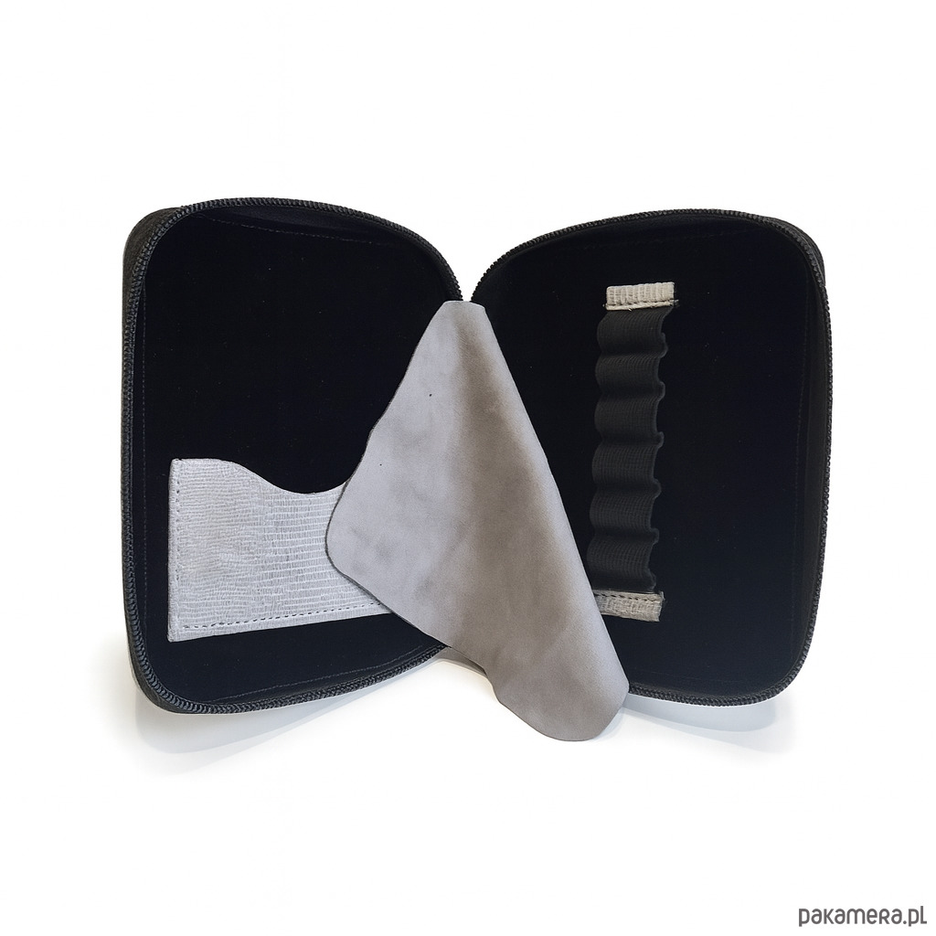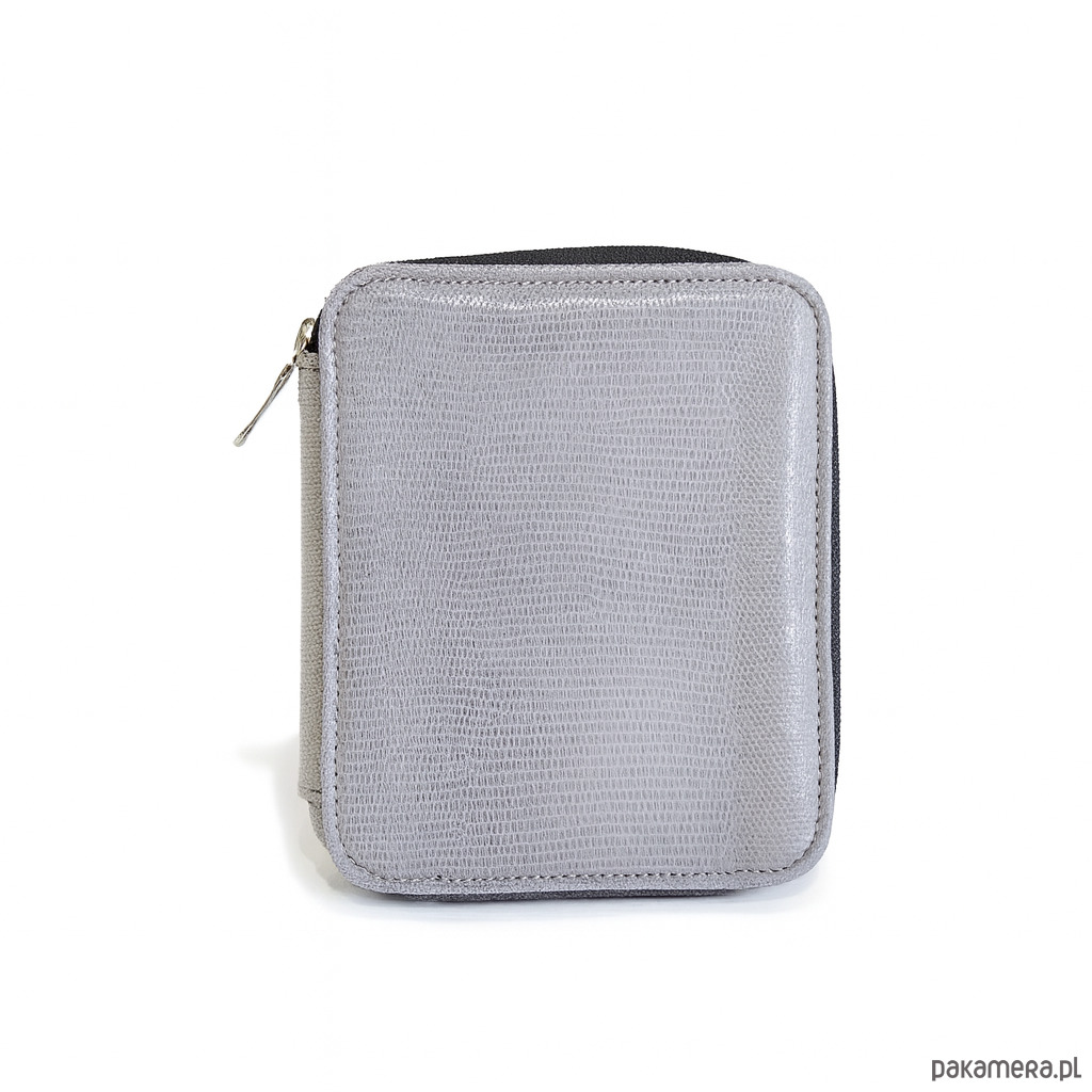 Etui wykonane z pięknej naturalnej skóry welurowej w kolorze popielatym o tłoczonej fakturze węża. Skóra naturalna, najwyższej jakości. Piękne etui w bardzo eleganckim kształcie . Etui jest zamykane za zamek błyskawiczny, uchwyty na pióra wykonane są z elastycznej gumki co daje możliwość umieszczenia piór o różnej grubości. Etui w środku wykonane jest z miękkiego materiału w kolorze czarnym, ma welurową kurtynę aby pióra były zabezpieczone. i dodatkową kieszonkę na wizytówki. Etui robione ręcznie przy użyciu tradycyjnych metod kaletniczych, zgodnych ze starą sztuką rzemieślniczą. Wymiary 13,5cmx16cmx3cm