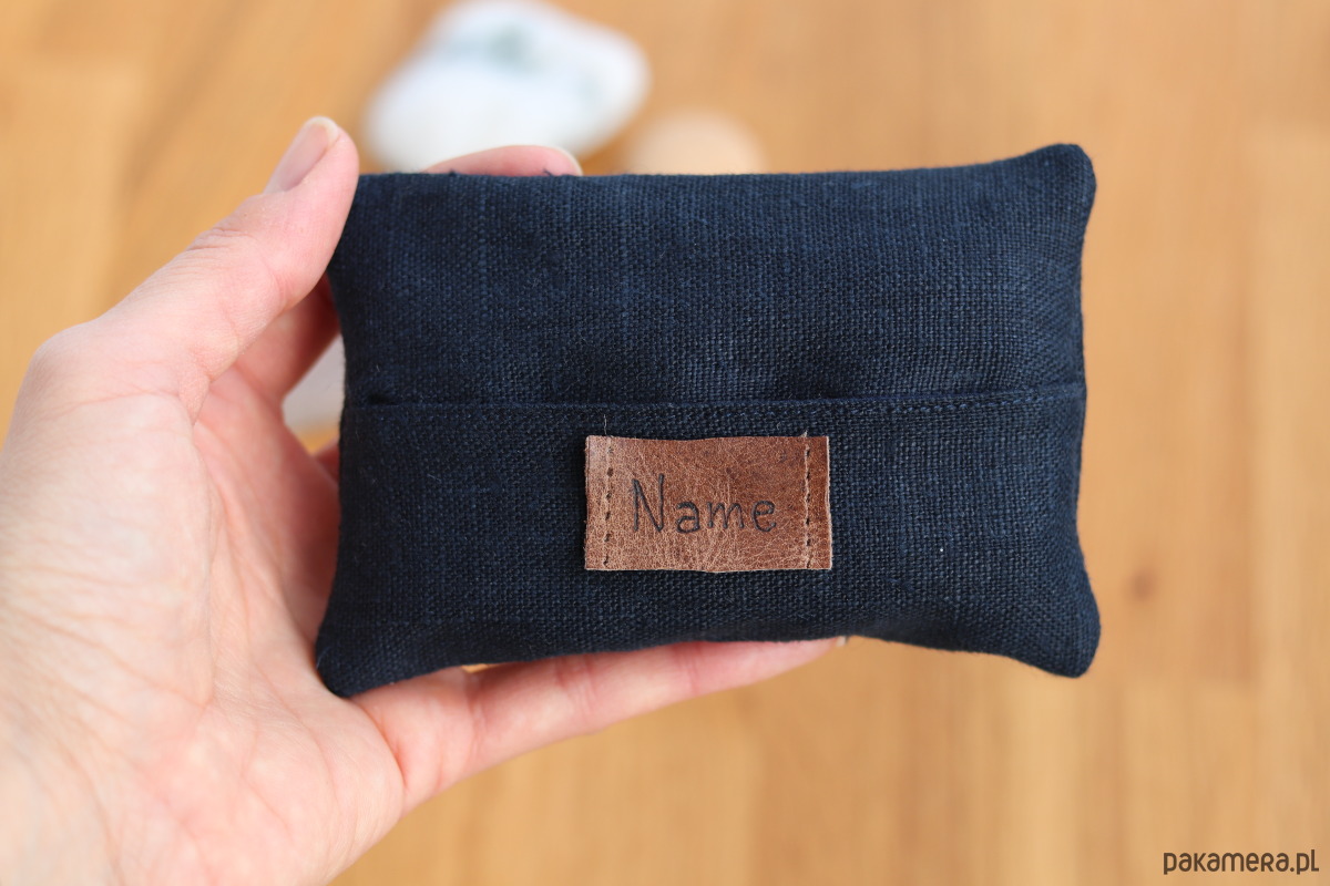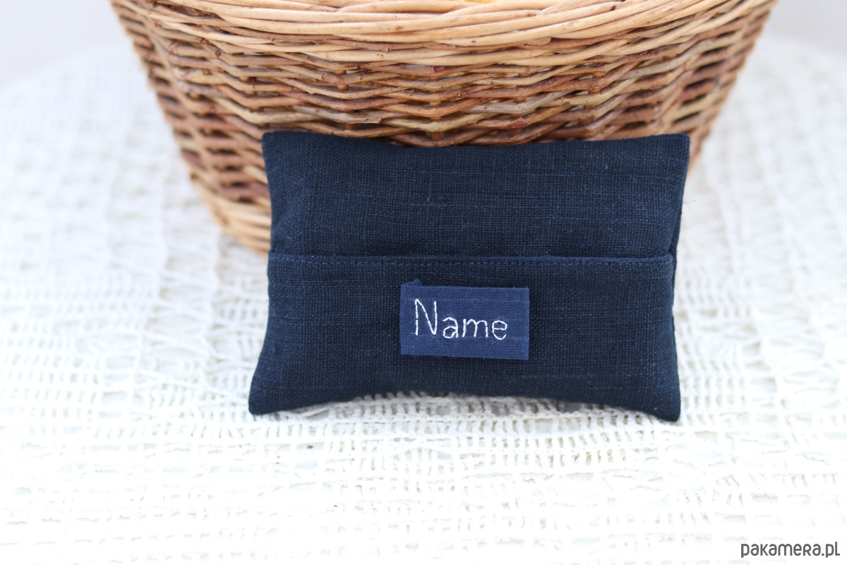 Szczegóły: Etui wykonane z granatowego lnu z granatową bawełnianą podszewką.
