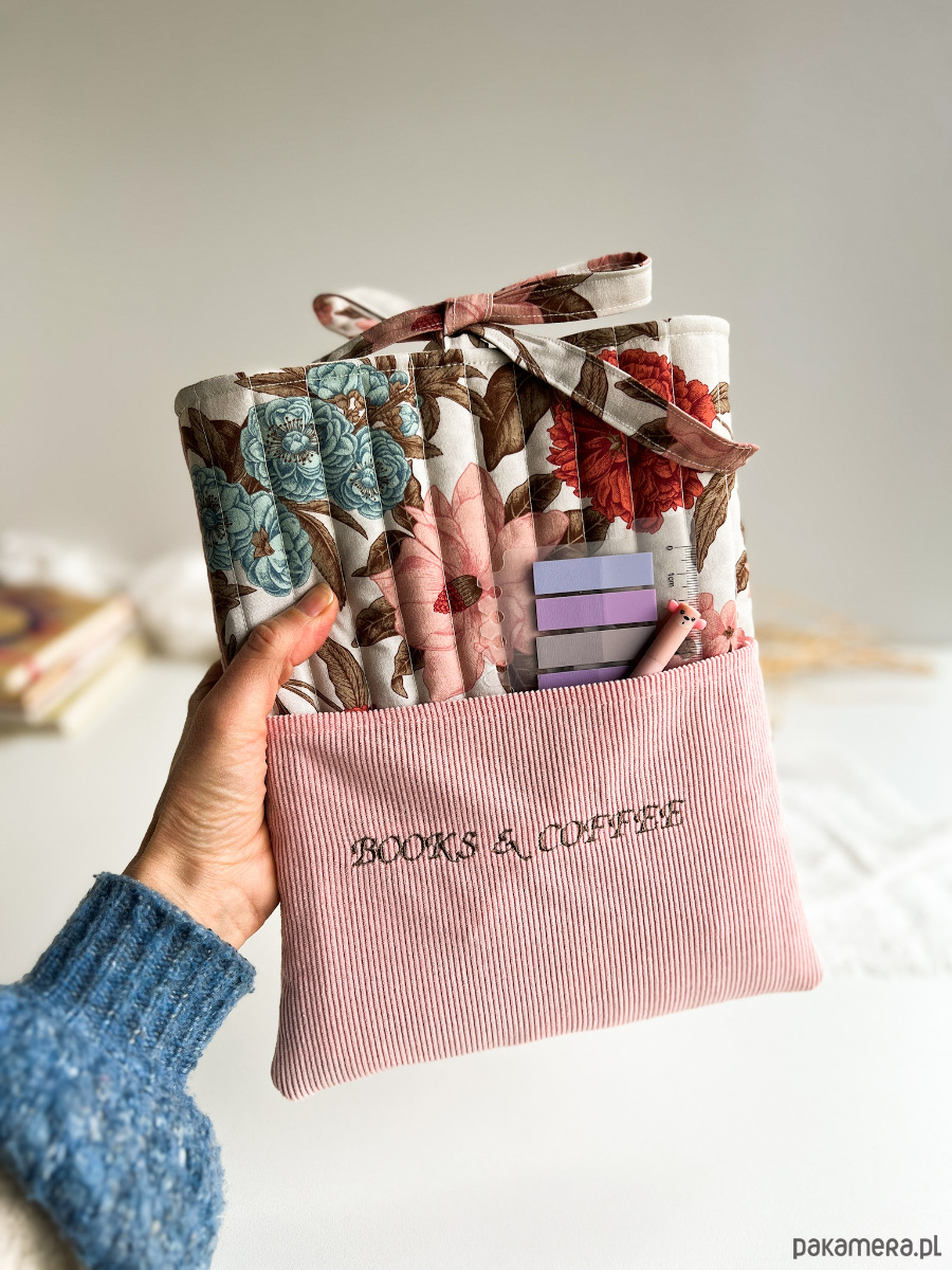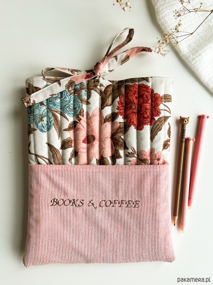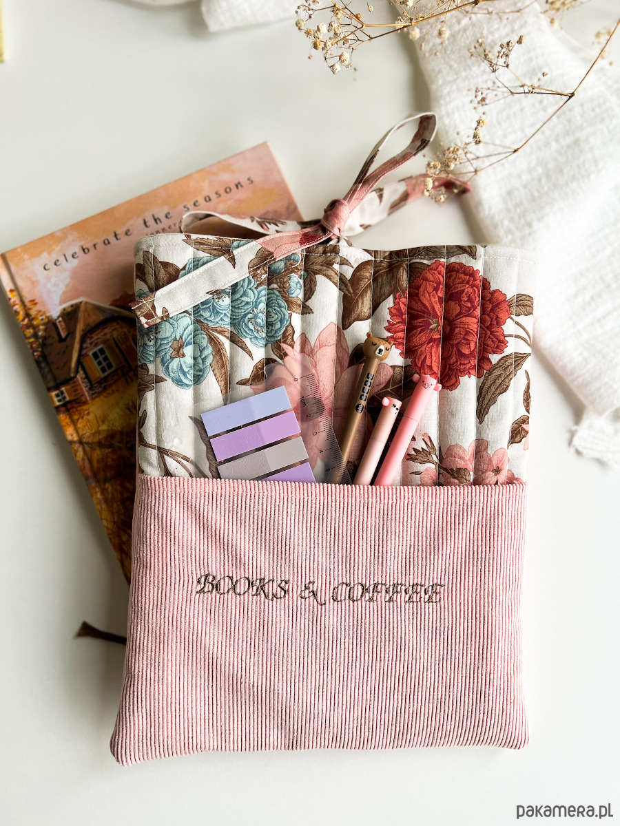 W środku znajdziesz miękką, otulającą warstwę, która zabezpiecza książkę, a na zewnątrz – kobiecy, kwiatowy wzór oraz subtelny haft „Books & coffee”, idealny dla tych, którzy kochają spokojne chwile z lekturą i kubkiem ulubionego napoju.