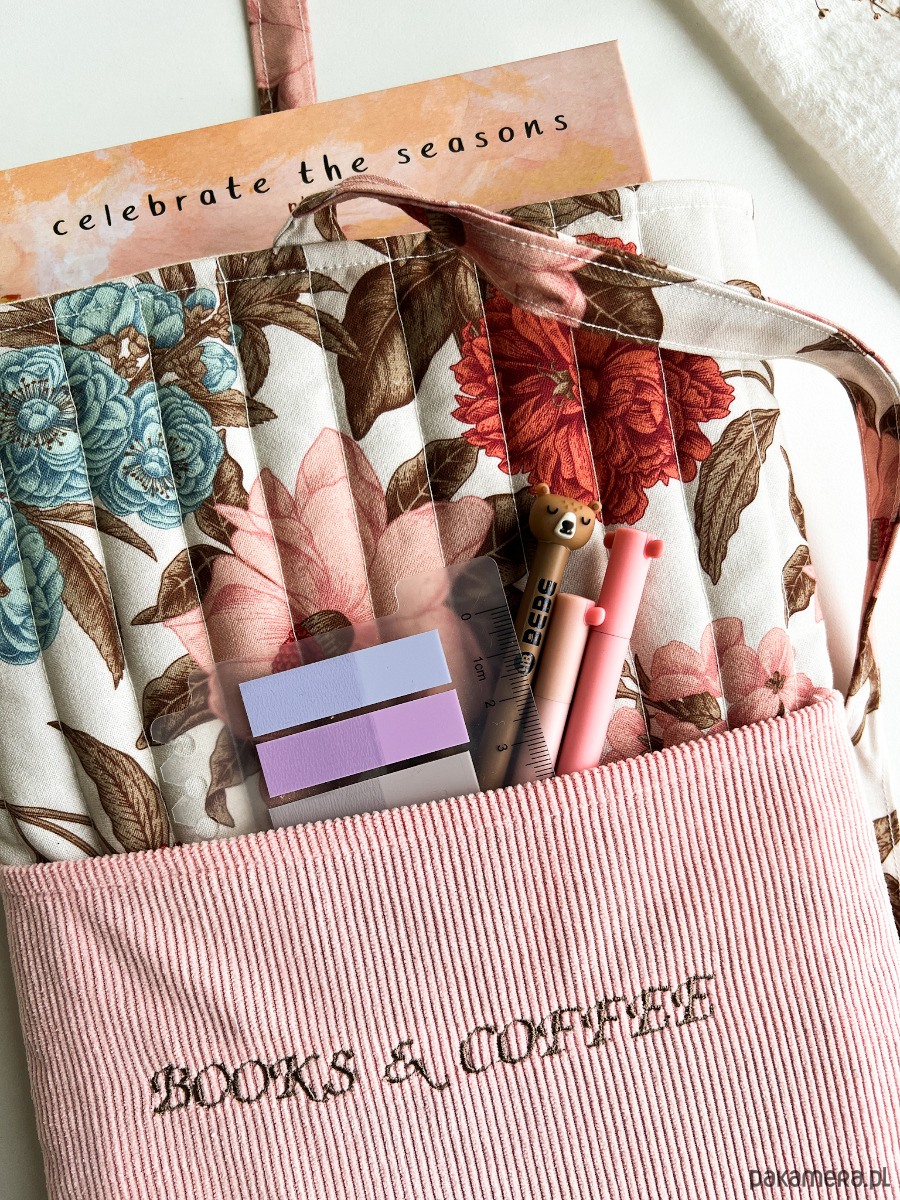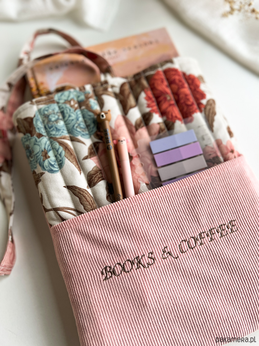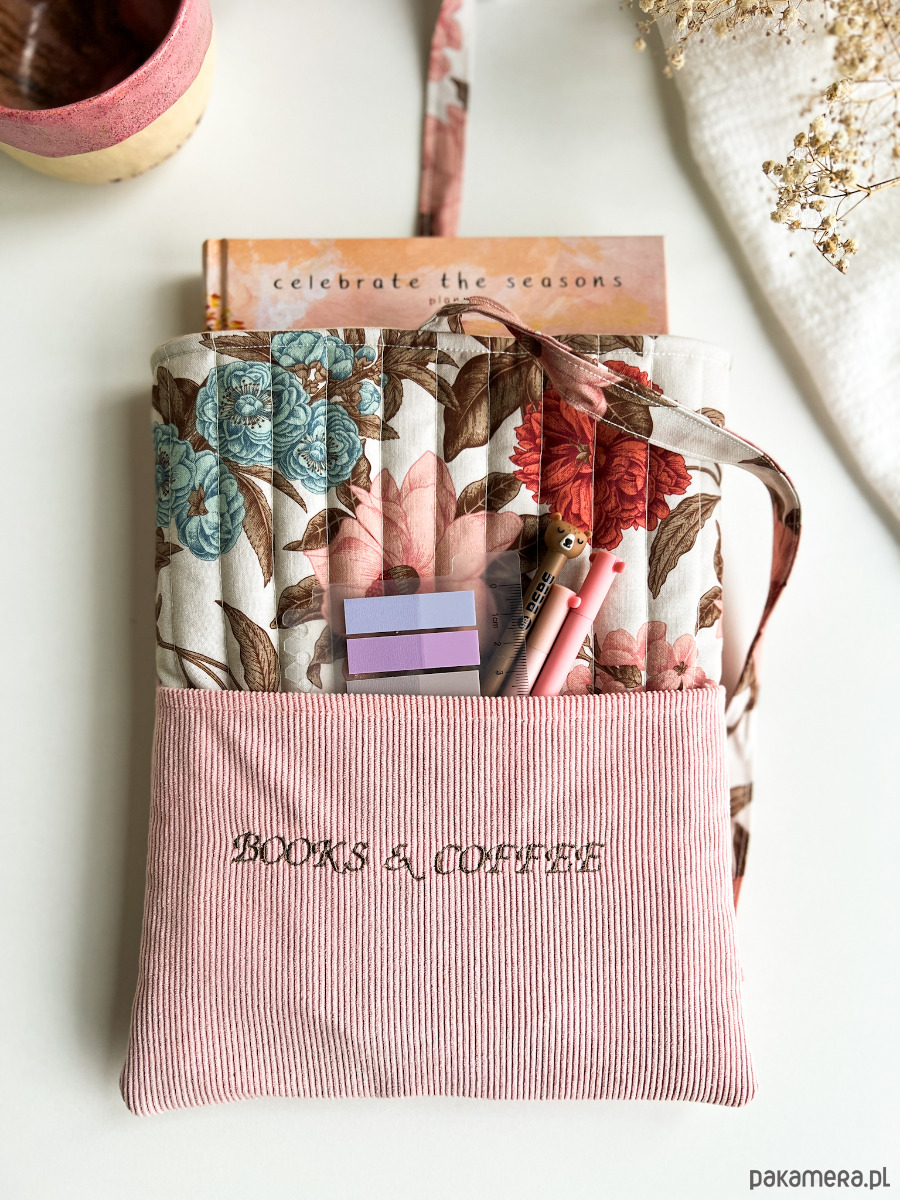 W środku znajdziesz miękką, otulającą warstwę, która zabezpiecza książkę, a na zewnątrz – kobiecy, kwiatowy wzór oraz subtelny haft „Books & coffee”, idealny dla tych, którzy kochają spokojne chwile z lekturą i kubkiem ulubionego napoju.