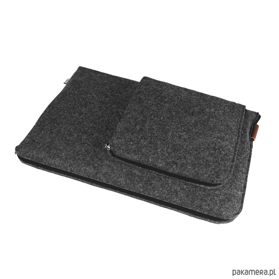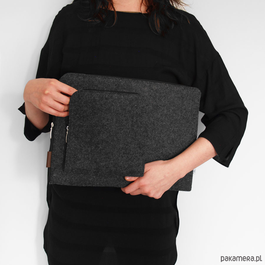 Pokrowiec z grafitowego filcu na laptopa z naszytą dodatkową kieszonką na zasilacz.