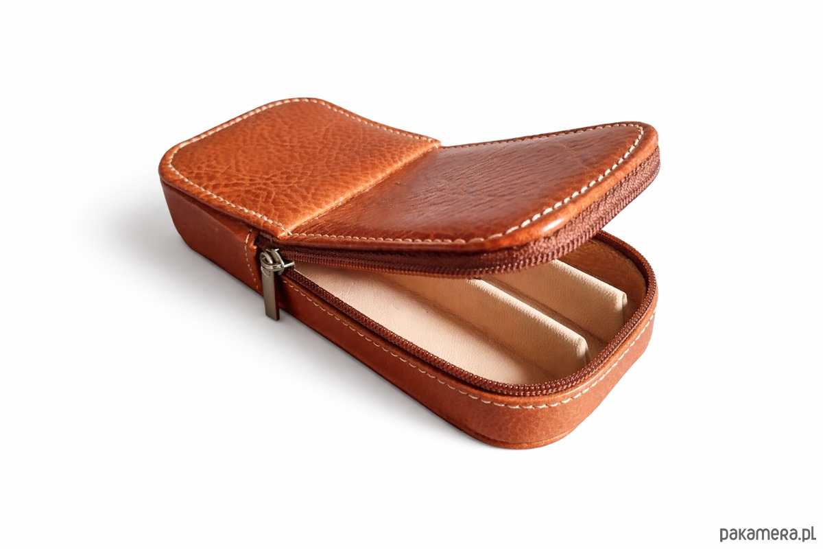 Etui wykonane z wysokiej jakości naturalnej skóry w kolorze jasnego - miodowego brązu z naturalną fakturą. Etui w środku praktycznie podzielone na trzy osobne przegródki , wyścielone miękką zabezpieczającą skórą w jasnym kolorze brązowym . Etui robione ręcznie przy użyciu tradycyjnych metod kaletniczych, zgodnych ze starą sztuką rzemieślniczą. Etui bardzo wysokiej jakości. Wymiary 16cmx 7cmx2,5cm , ZAPRASZAMY