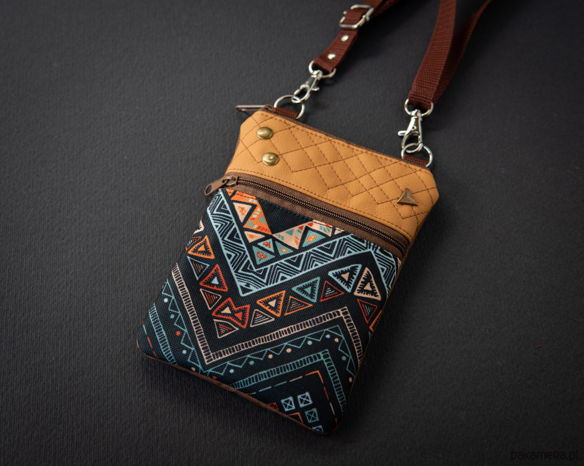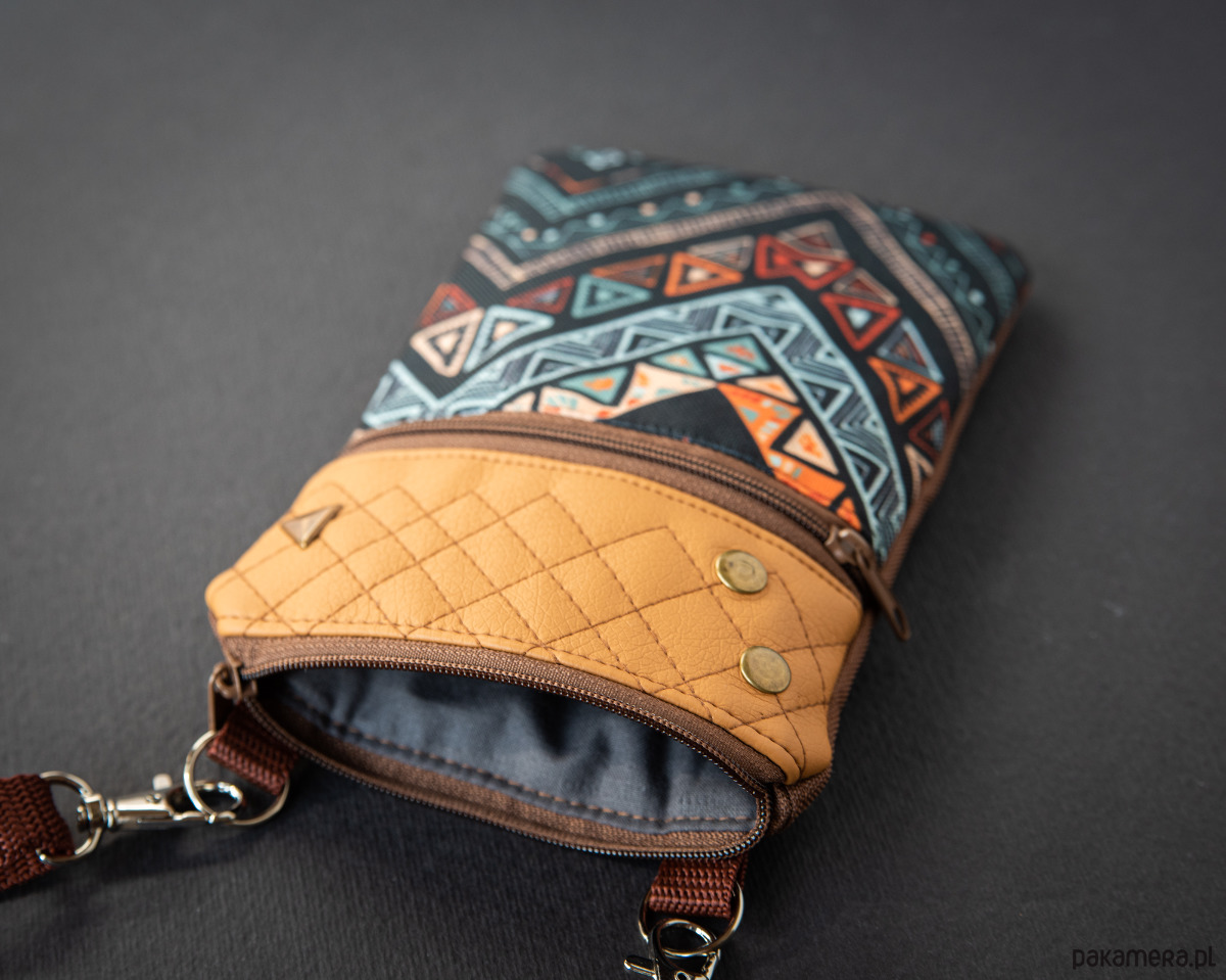 Ręczne uszyty etui na telefon zamykane na zamek. Z przodu kieszeń na karty i pieniędzy. Regulowany pasek na ramię. Metalowe wykończenie w kolorze srebrnym.
