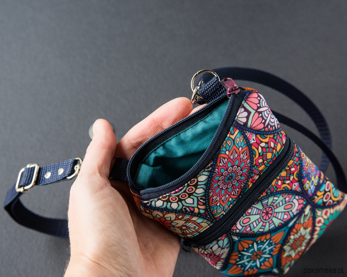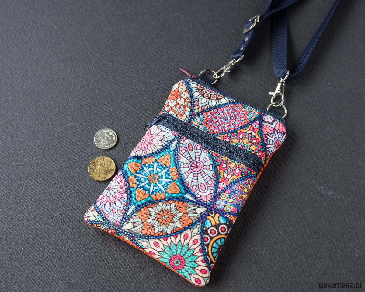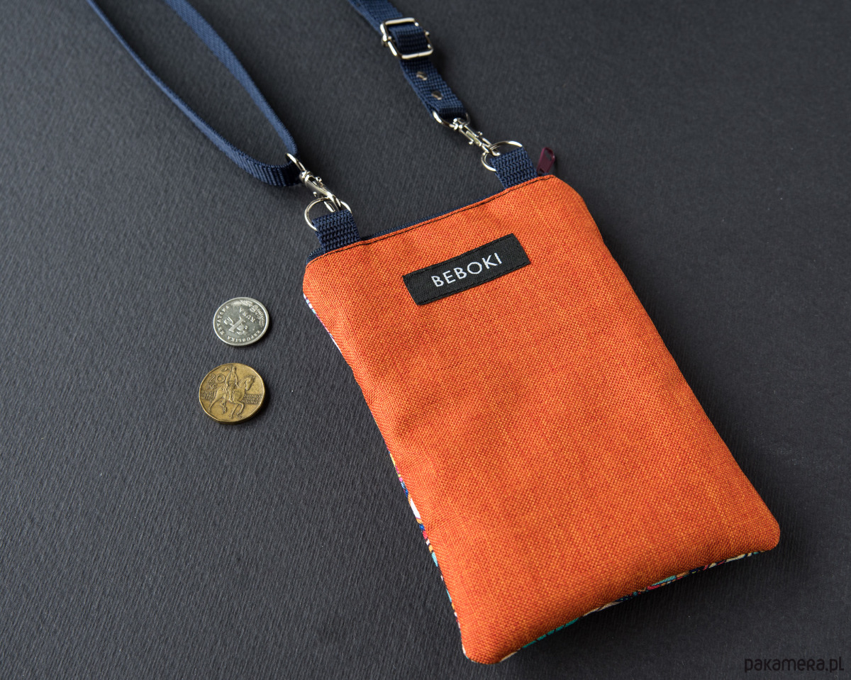Ręczne uszyty etui na telefon zamykane na zamek. Z przodu kieszeń na karty i pieniędzy. Regulowany pasek na ramię. Metalowe wykończenie w kolorze srebrnym.