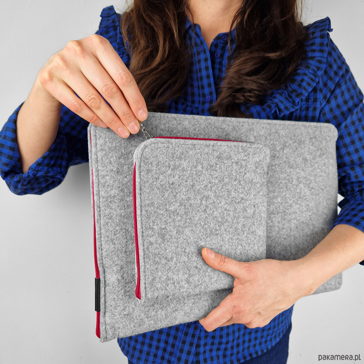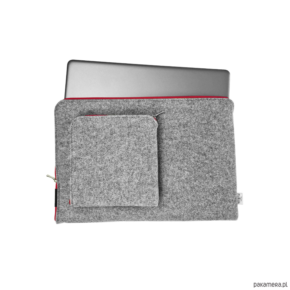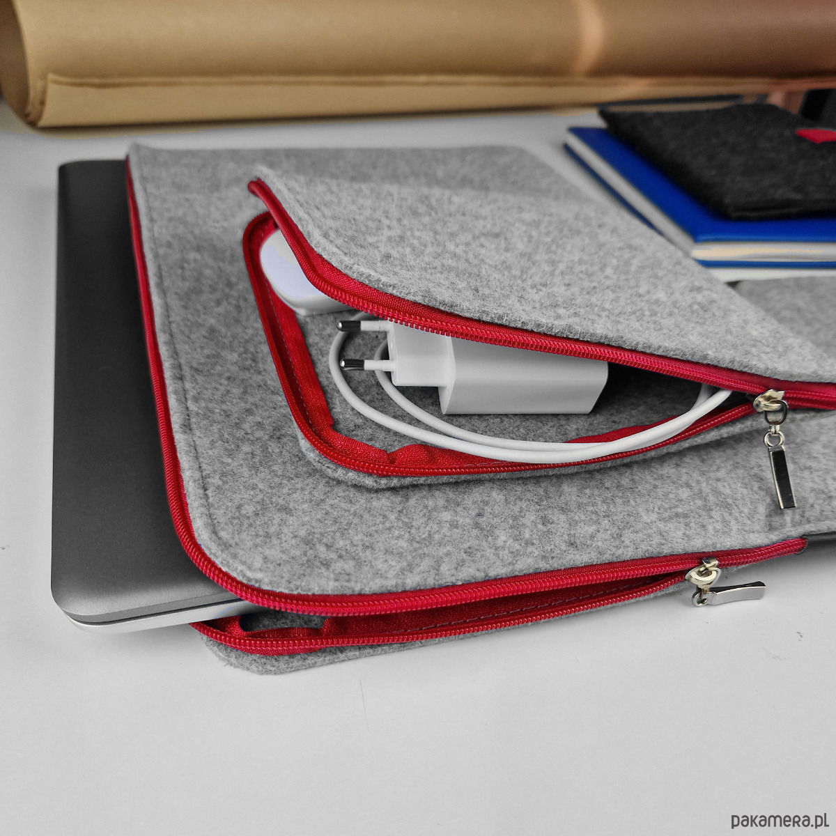 Pokrowiec z jasnoszarego filcu na laptopa z naszytą dodatkową kieszonką na zasilacz.