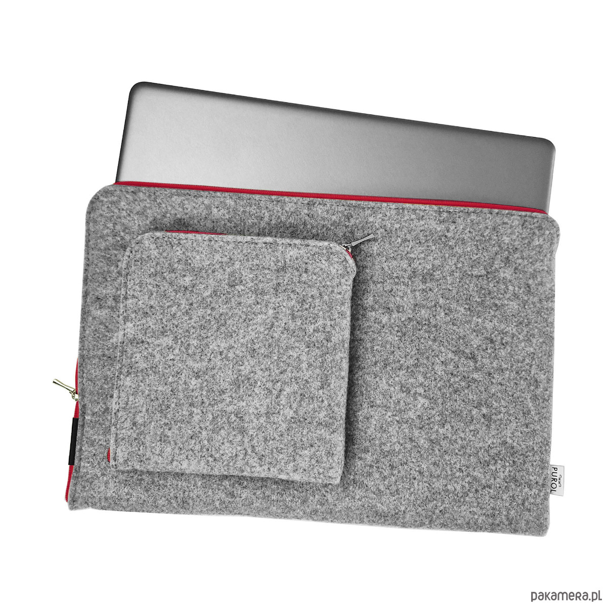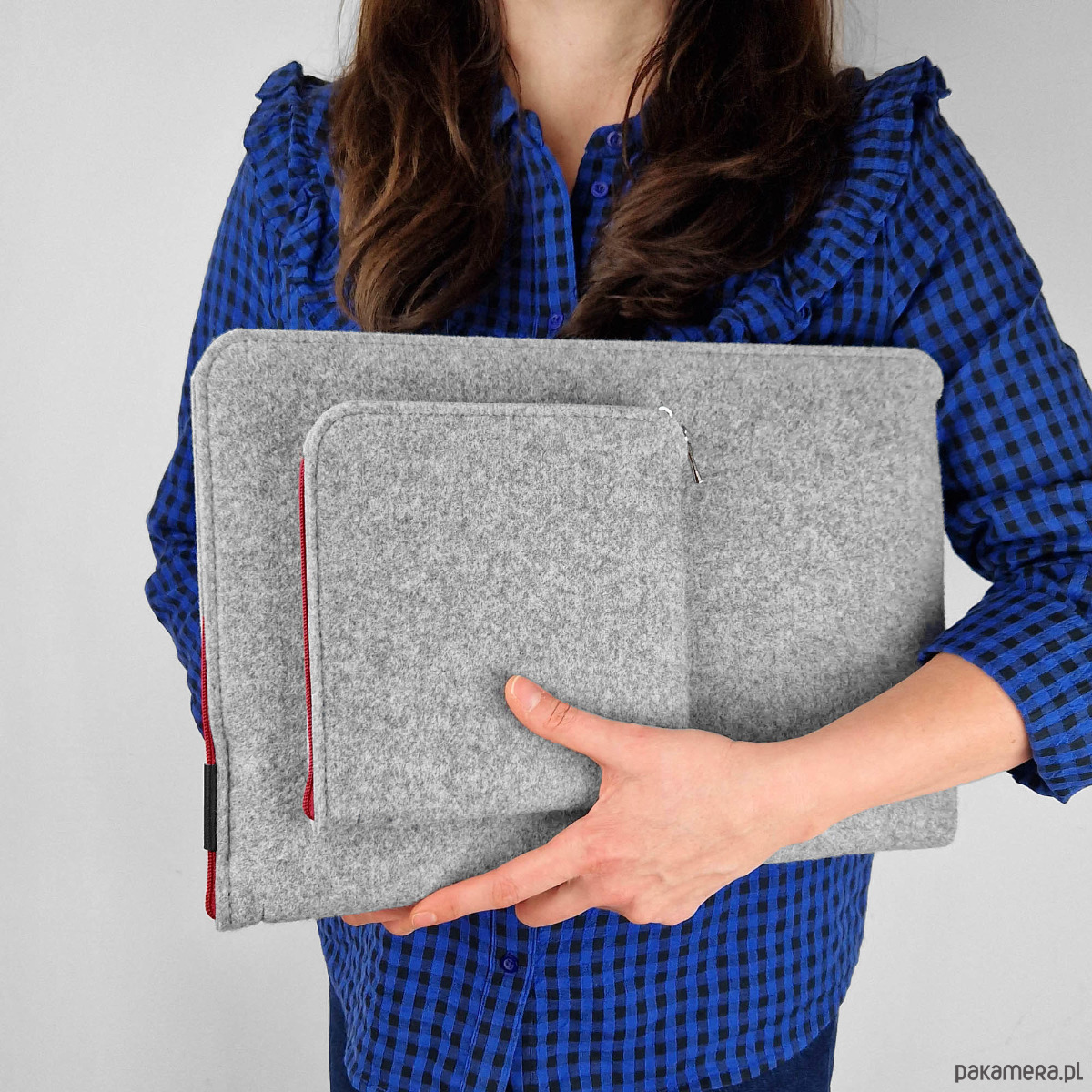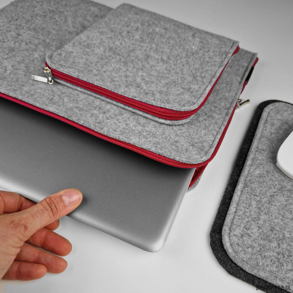 Pokrowiec z jasnoszarego filcu na laptopa z naszytą dodatkową kieszonką na zasilacz.