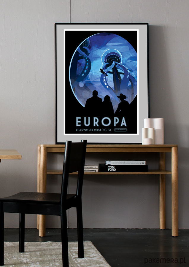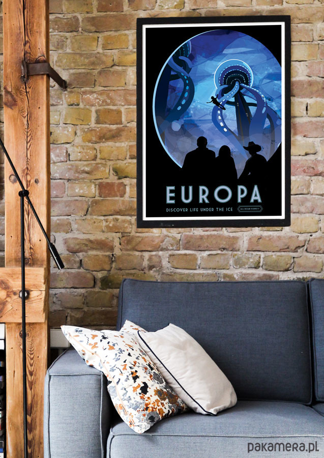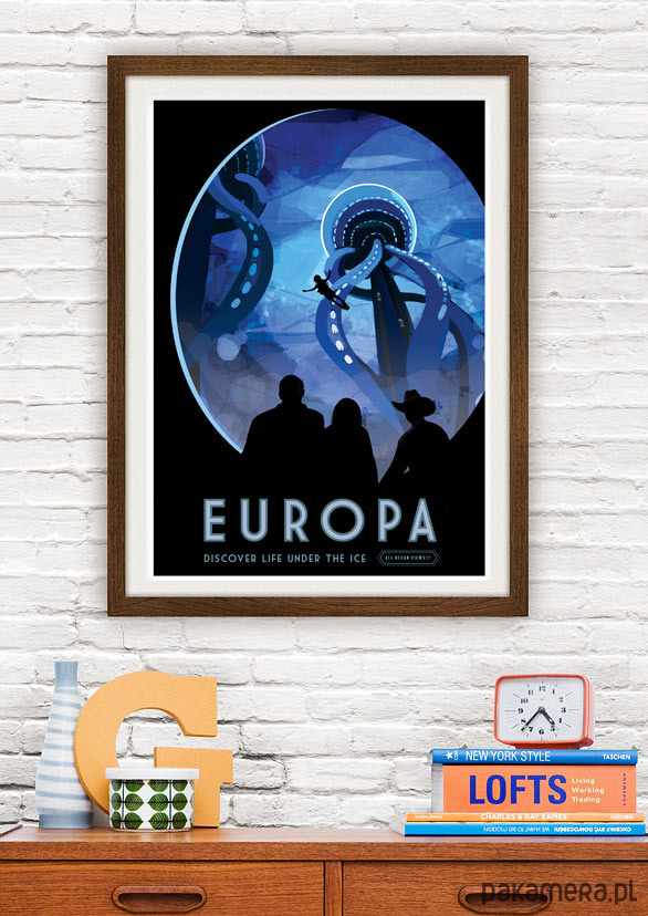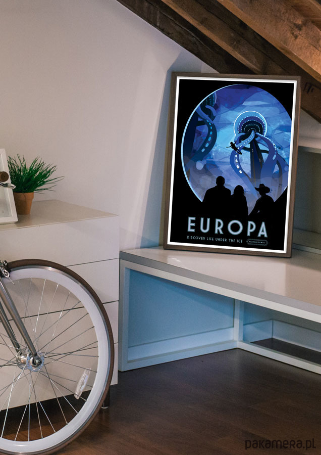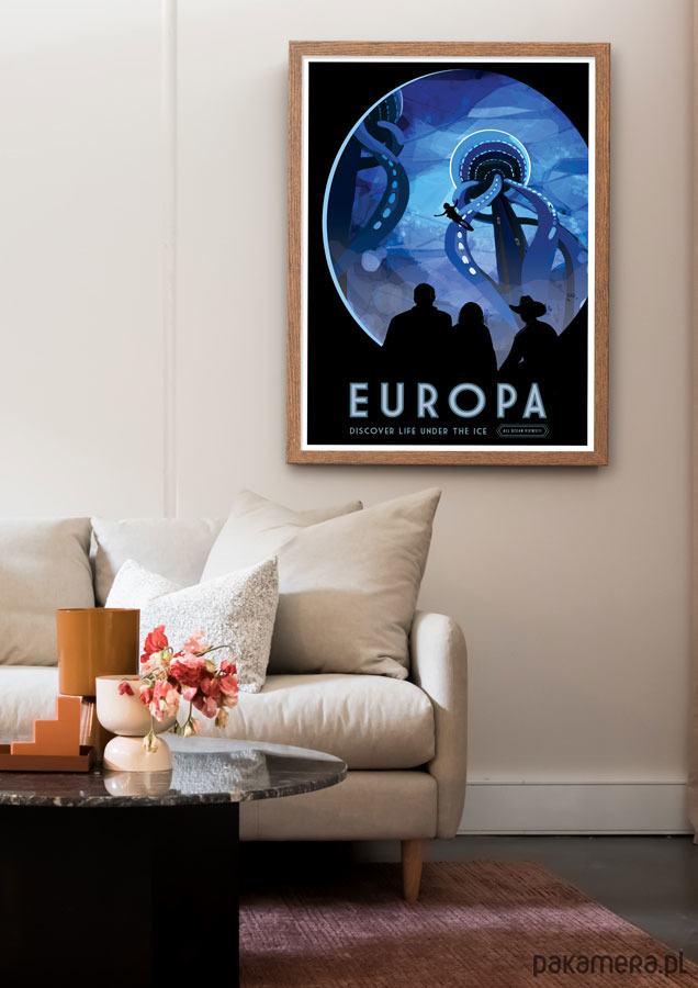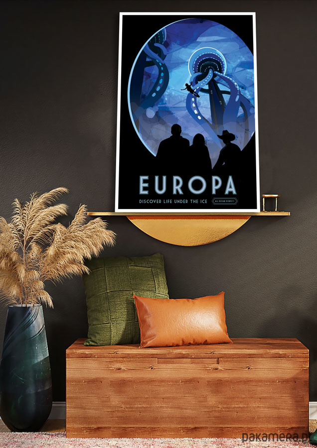 Plakat w stylu vintage przedstawiający Europę - jeden z księżyców Jowisza. Znajdujący się na plakacie slogan reklamowy zachęca "Odkryj życie pod lodem". Zdumiewająca geologia i tajemnica skrywana pod lodem. Czy to możliwe, że pod księżycową powierzchnią Europy faluje ocean dwukrotnie przewyższający swym rozmiarem ziemskie zbiorniki? Fascynujące sekrety czekają na przyszłych odkrywców tego galileuszowego księżyca Jowisza.