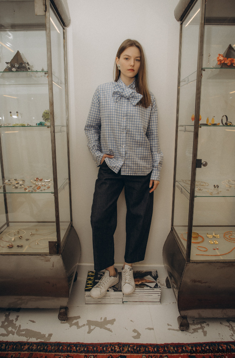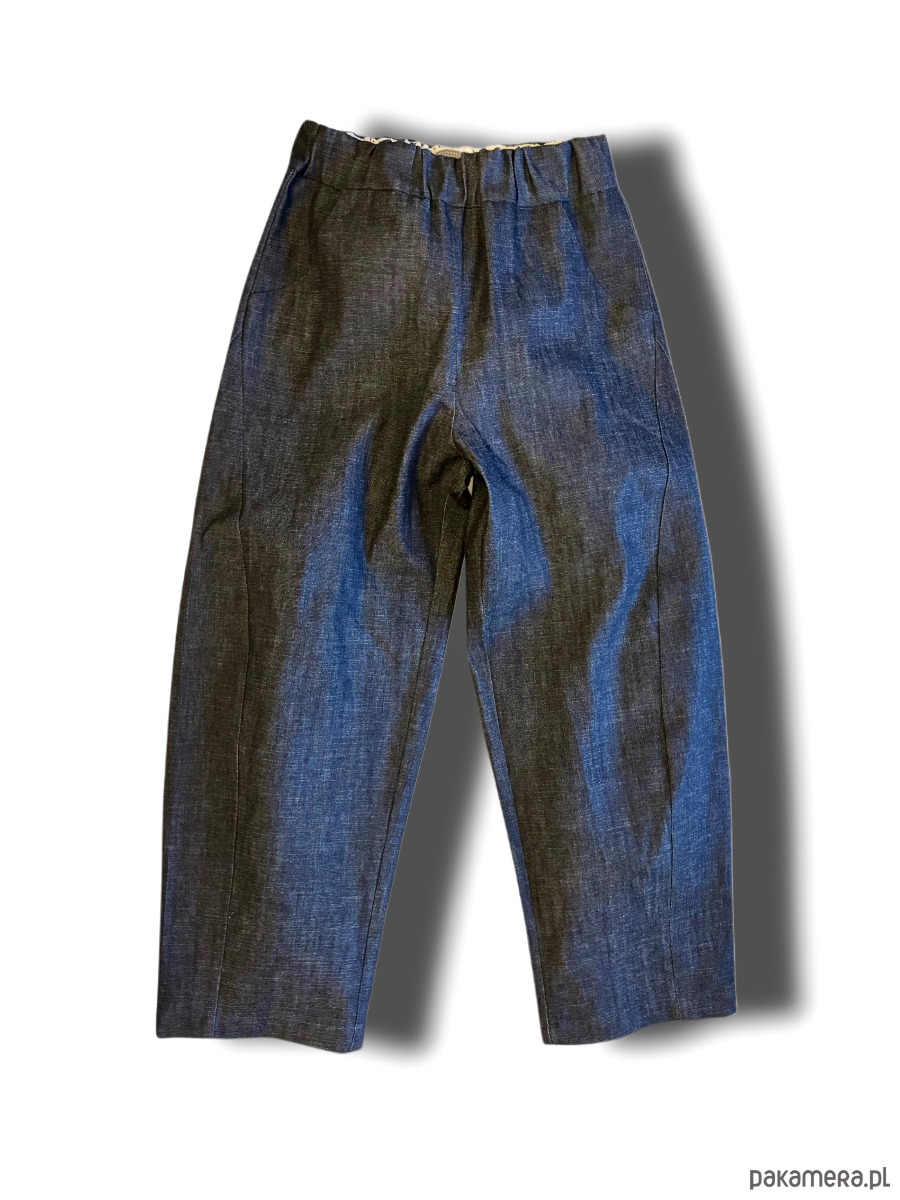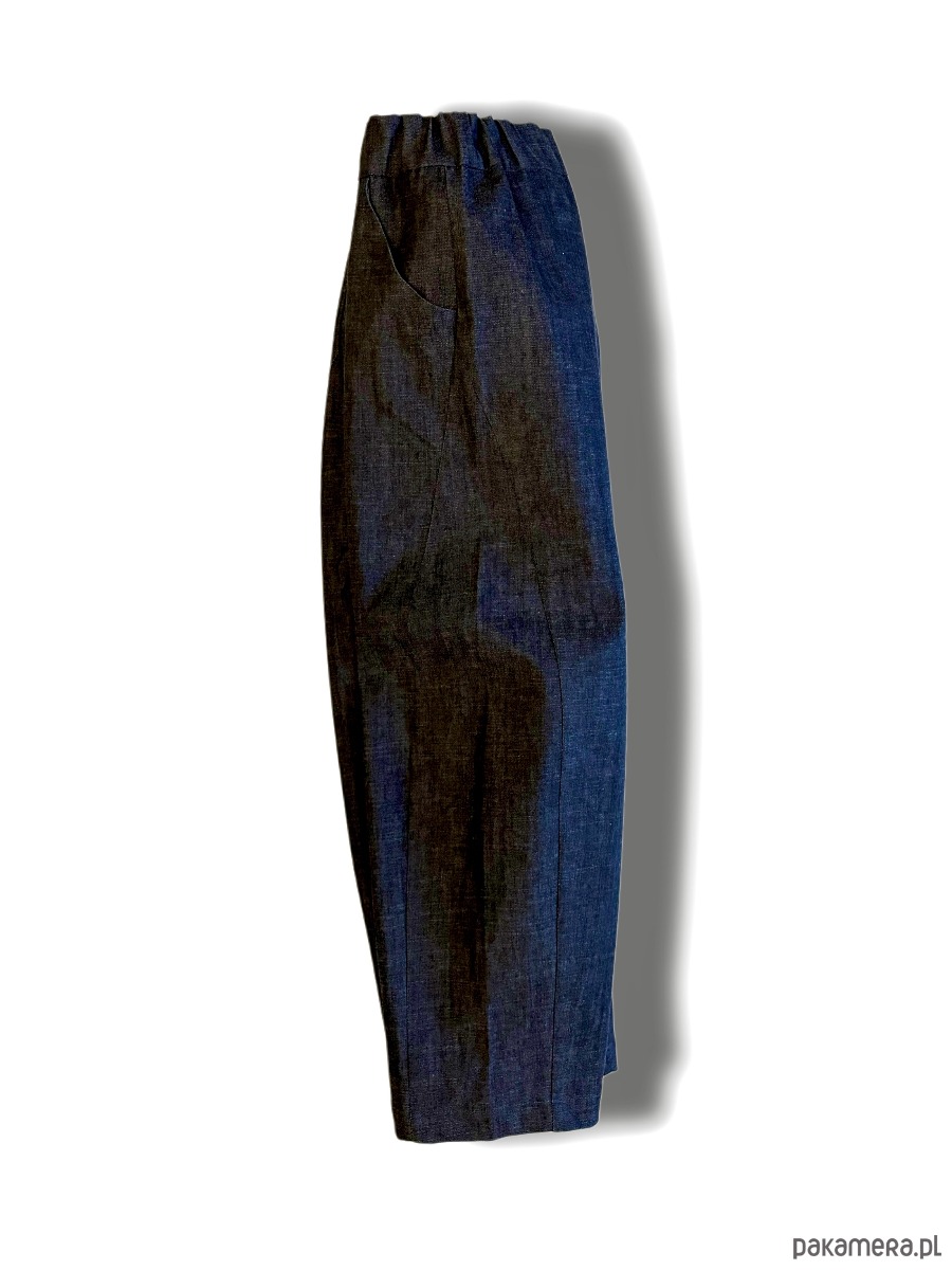 Spodnie Eva -w odcieniu indygo, z ciemnogranatowego, surowego brytyjskiego denimu. Spodnie maja formę lekko zaokrąglonej nogawki tzw. ‘barrell leg’, są wygodne, wytrzymałe i pieknie wysmuklają sylwetkę.
