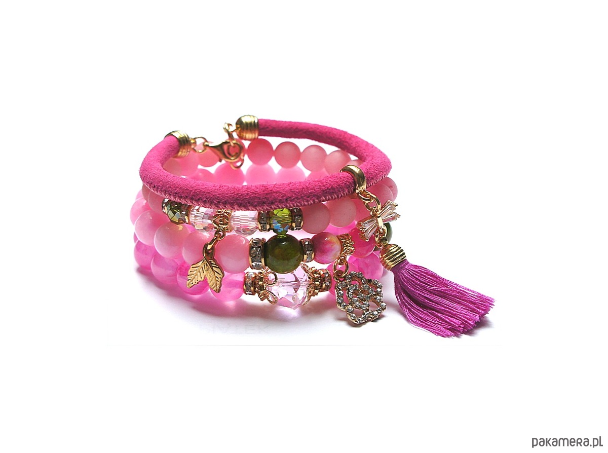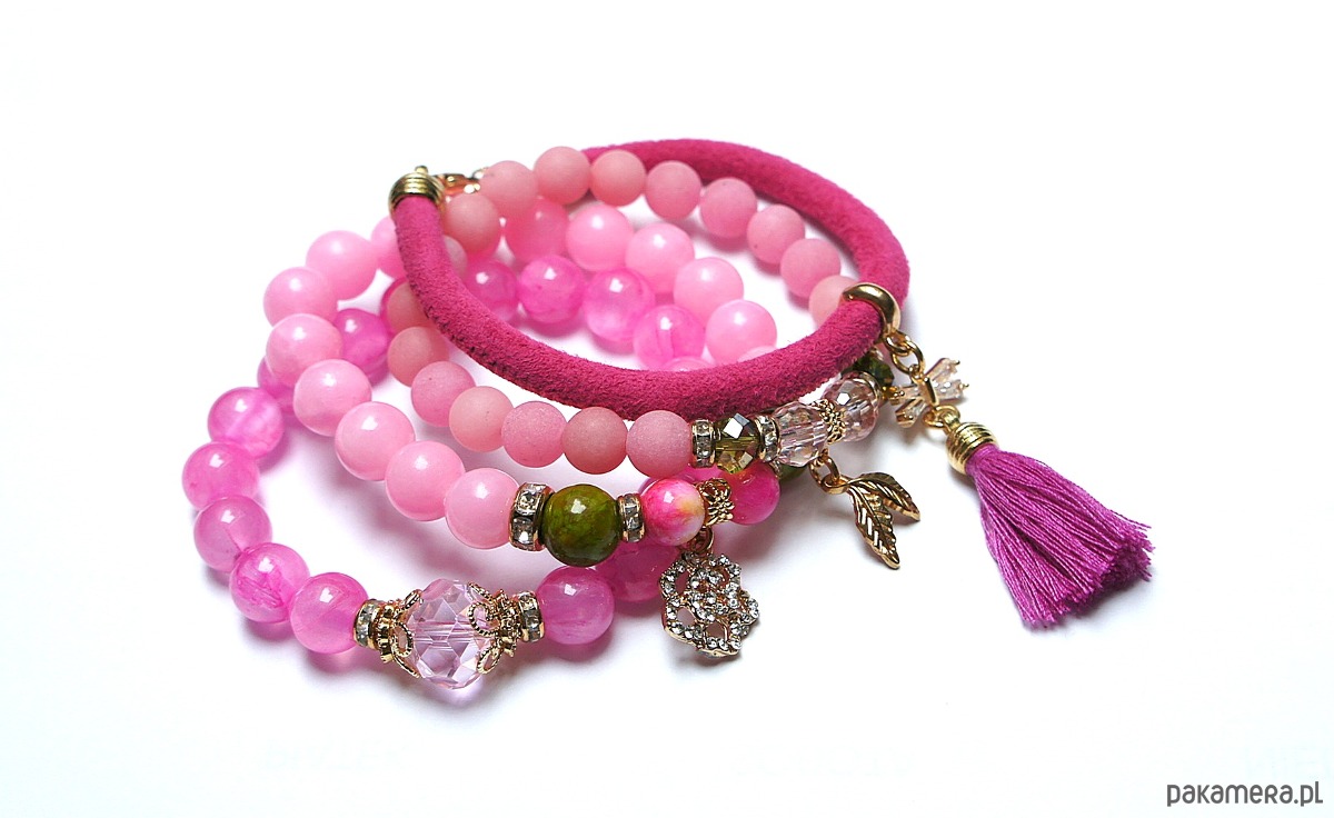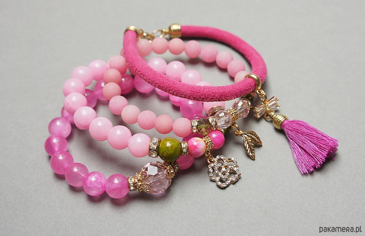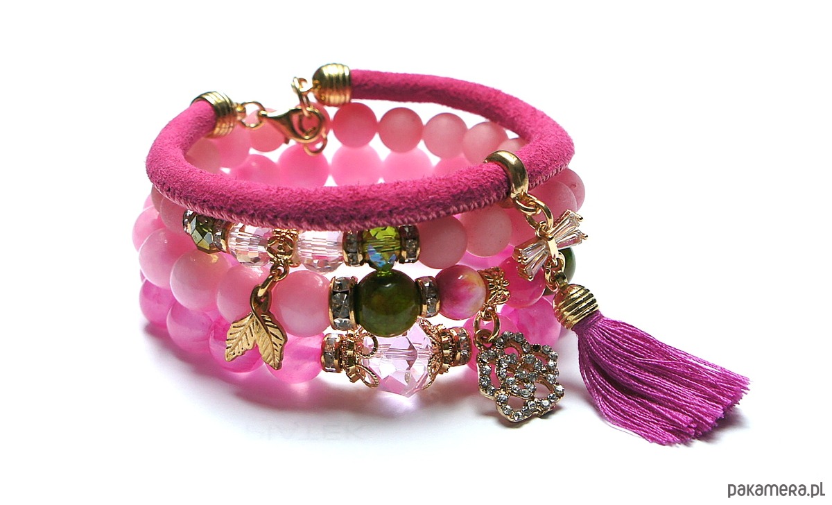Komplet czterech bransoletek wykonanych z naturalnych kamieni: jadeity matowe [8mm], jadeity [10mm], marmur [8mm i 10mm], kryształki [8mm i 12mm], łącznika wysadzanego cyrkoniami, zawieszki wysadzanej cyrkoniami, rzemienia ze skórki naturalnej, chwostu oraz elementów metalowych w kolorze złotym.