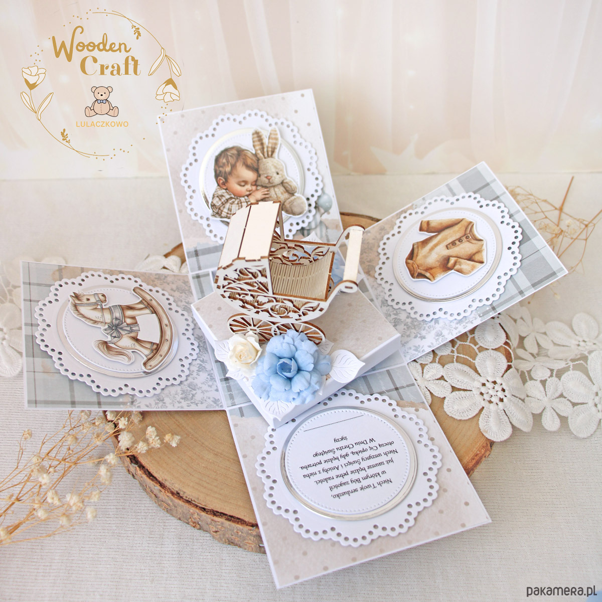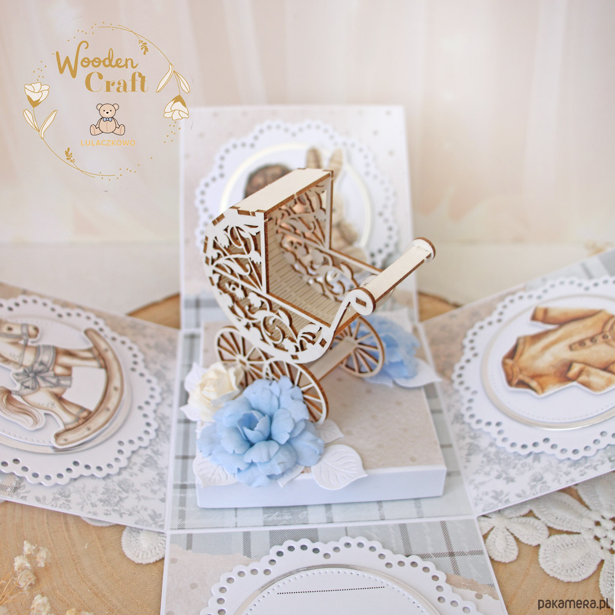 W środku boxa znajduje prześliczna tekturka 3D - ażurowy wózeczek, ozdobiony ręcznie robionymi kwiatami. Na ściankach boxa umieszczone zostały słodkie grafiki przedstawiające małego, uroczego chłopczyka z przytulanką, konika na biegunach, oraz chłopięce ubranko, a także życzenia. Pod tekturką 3D znajduje się mini pudełeczko, do którego można włożyć prezent pieniężny.