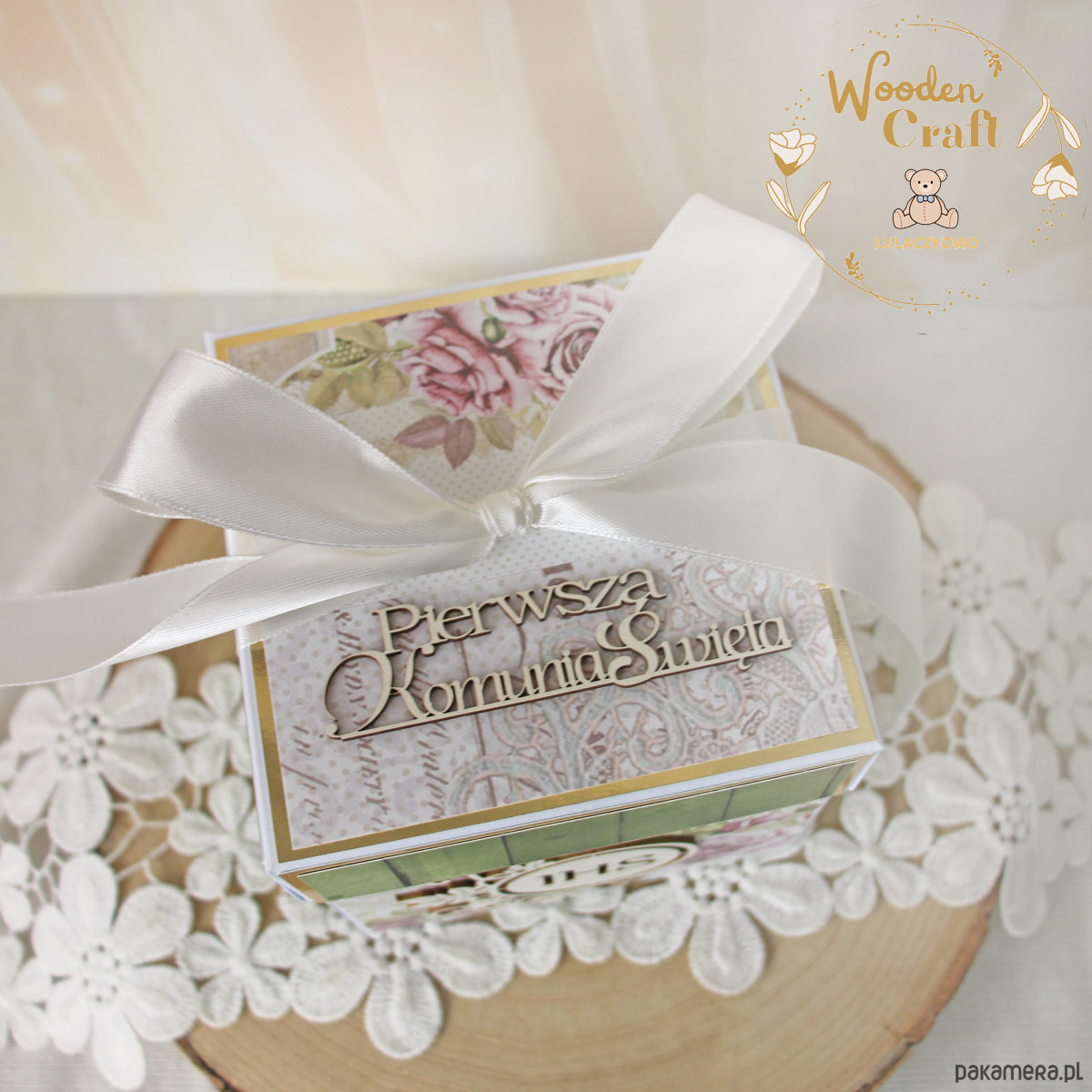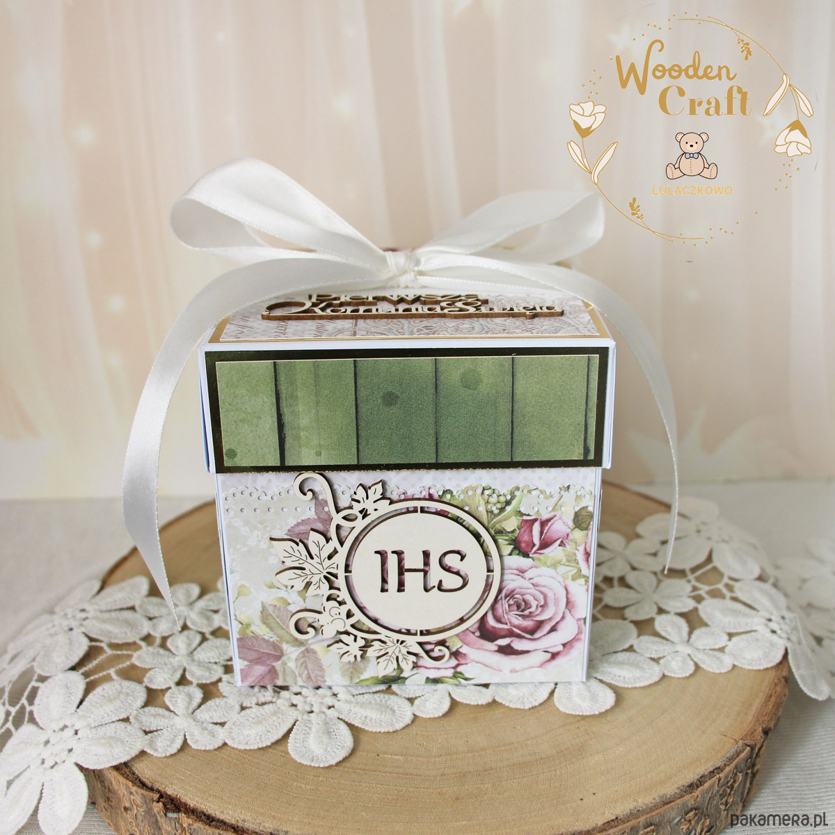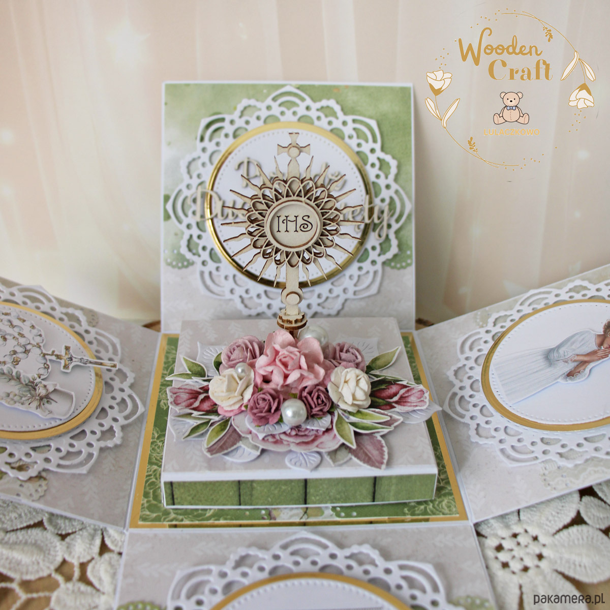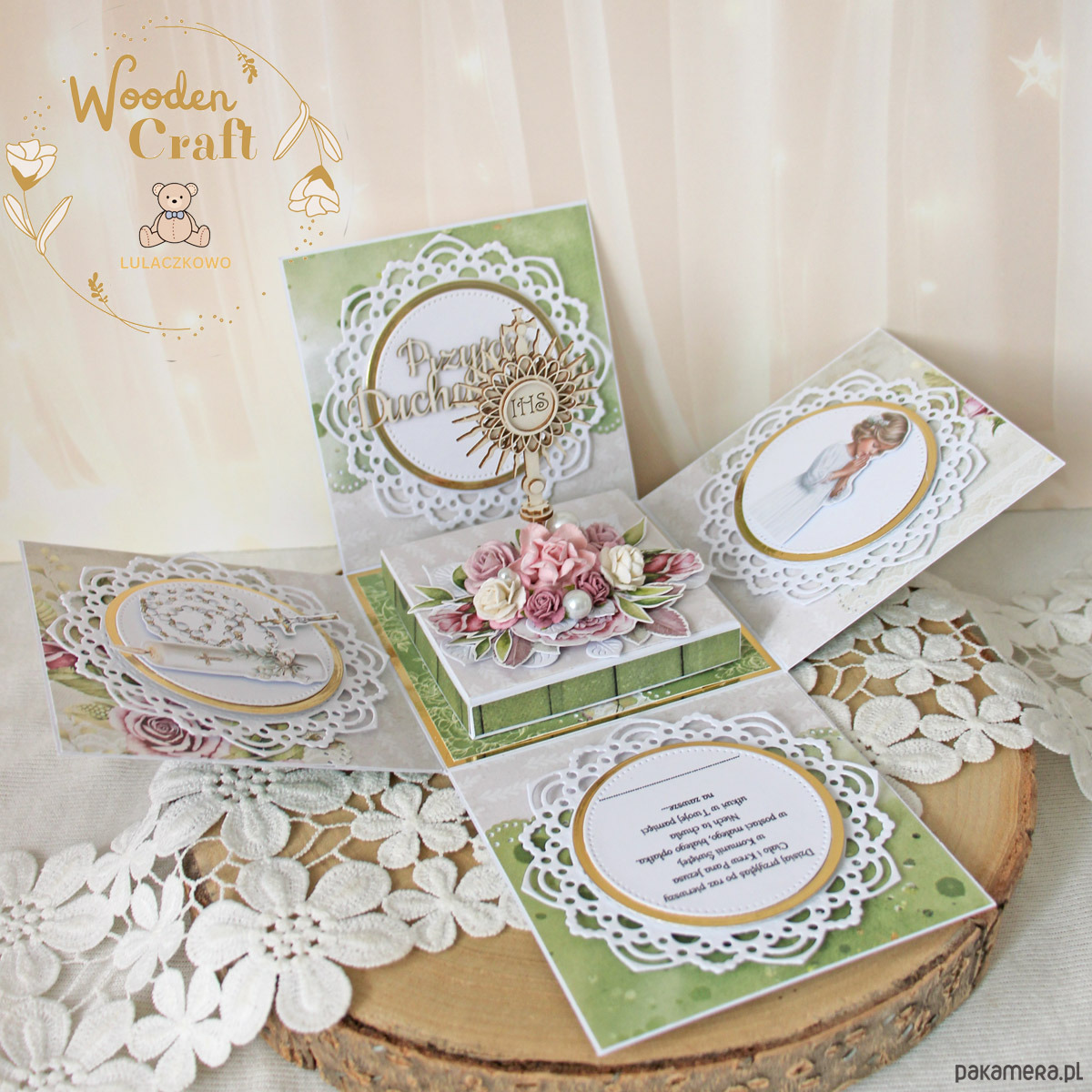 Piękna, elegancka pamiątka Pierwszej Komunii Świętej w postaci exploding boxu, wykonana ręcznie z najwyższą starannością, z cudownej kolekcji papierów "Violet Roses", utrzymana w odcieniach fioletu, zieleni i bieli, z dodatkiem złotych, błyszczących akcentów. Na środku boxa umieszona została tekturka 3D monstrancja z hostią świętą, ozdobiony papierowymi. Na ściankach boxa znalazły się tekturki: cytat "Przyjdź Duchu Święty", oraz grafiki modlącej się dziewczynki komunijnej, różańca i świecy, a także życzenia. Pod tekturką 3D umieszczone zostało mini pudełeczko, do którego można włożyć prezent pieniężny.