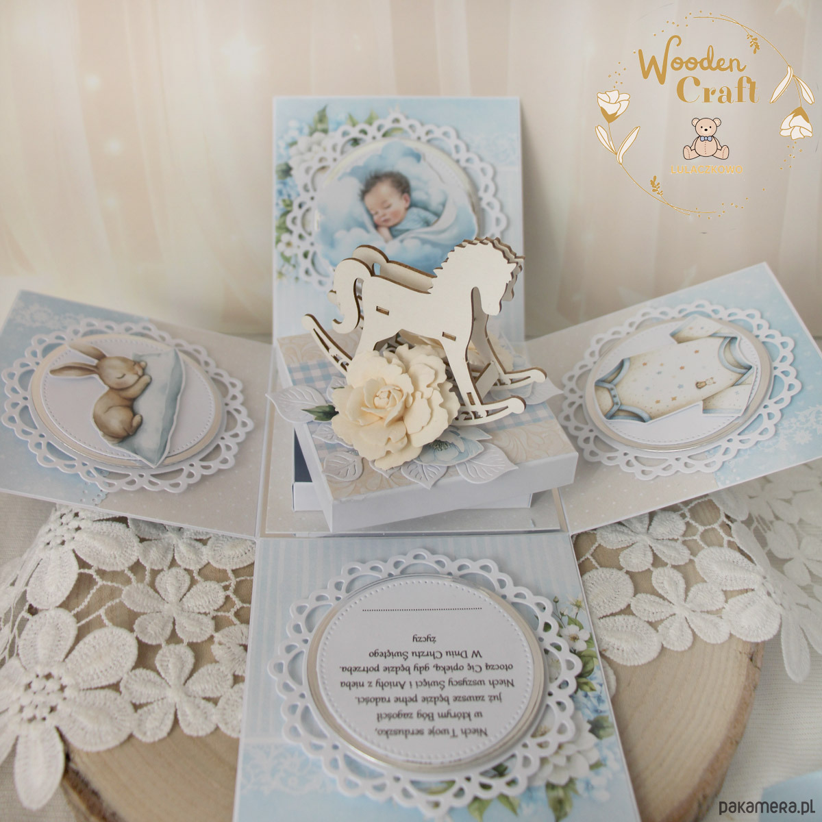 W środku boxa znajduje prześliczna tekturka 3D - konik na biegunach, ozdobiony ręcznie robionymi różami. Na ściankach boxa umieszczone zostały prześliczne grafiki przedstawiające maleńkiego, śpiącego chłopczyka, dziecięce ubranko oraz pluszowego króliczka, a także życzenia. Pod tekturką 3D znajduje się mini pudełeczko, do którego można włożyć prezent pieniężny lub inny niewielki upominek.