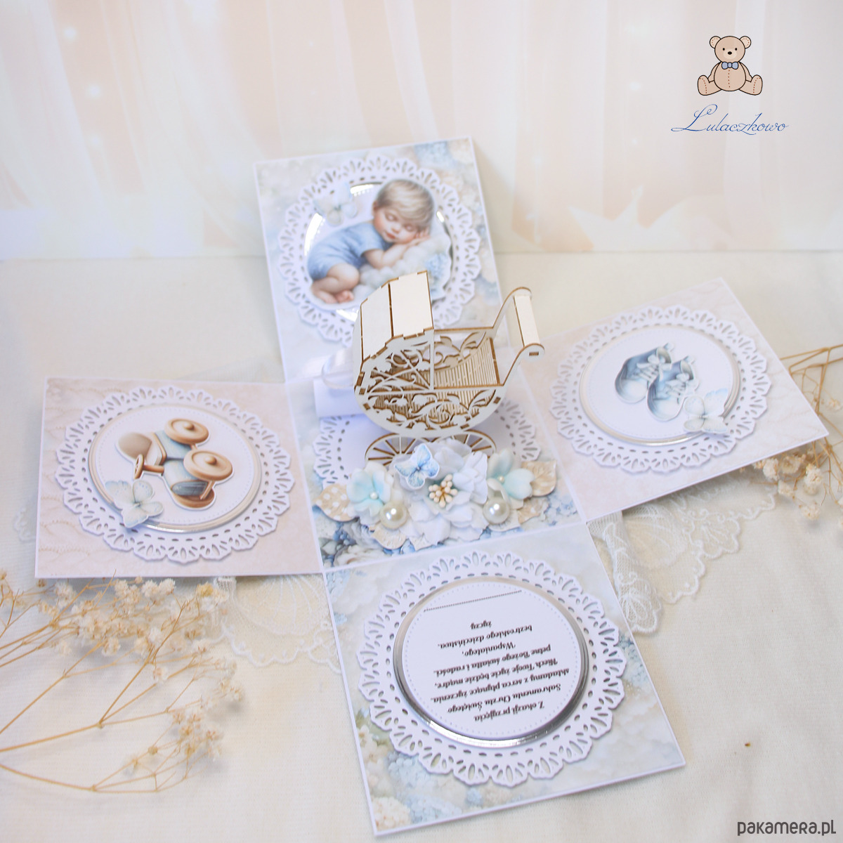 Przepiękna pamiątka chrztu świętego, roczku bądź narodzin, w formie exploding boxu utrzymanego w pięknych odcieniach błękitu i bieli z dodatkiem srebrnych, błyszczących akcentów. Pudełeczko wykonane z cudownej, dziecięcej kolekcji papierów "Cotton Candy". Wieczko ozdobione błękitną kokardą w jodełkę oraz tagiem z imieniem dziecka i datą chrztu/narodzin/roczku - w zależności od okazji.