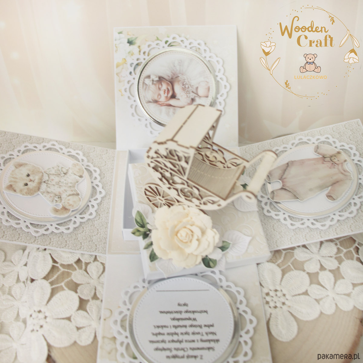W środku boxa znajduje prześliczna tekturka 3D - ażurowy wózeczek, ozdobiony ręcznie robionymi różami. Na ściankach boxa umieszczone zostały prześliczne grafiki przedstawiające maleńką, śpiącą dziewczynkę, dziecięce ubranko oraz pluszowego kotka, a także życzenia. Pod tekturką 3D znajduje się mini pudełeczko, do którego można włożyć prezent pieniężny lub inny niewielki upominek.