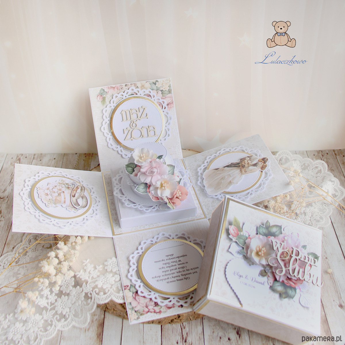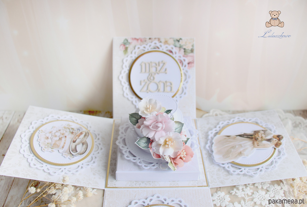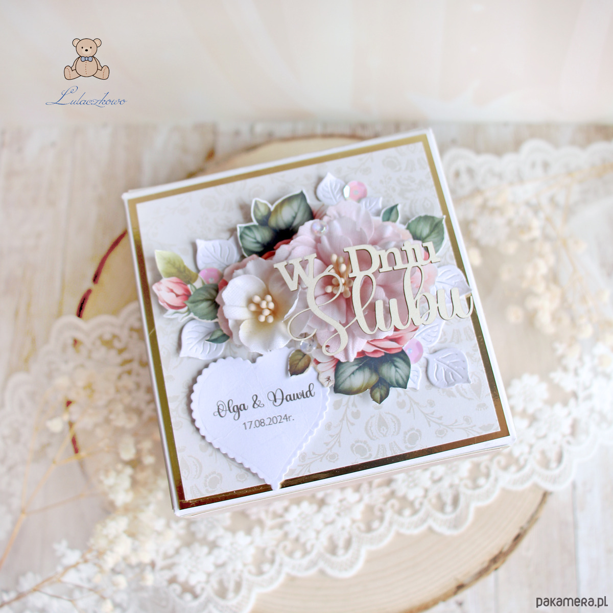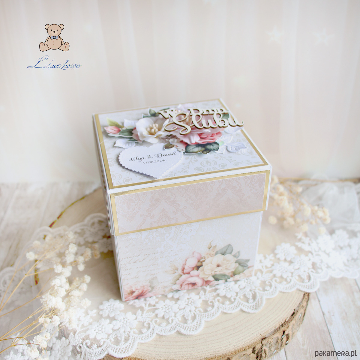 Przepiękny, bogato zdobiony exploding box ślubny, utrzymany w odcieniach beżu, zgaszonej zieleni, różu i bieli z dodatkiem złotych błyszczących akcentów. Box wykonany z dbałością o każdy detal, z przepięknej kolekcji papierów "Dear Diary Roses". Wieczko ozdobione kompozycją kwiatową, oraz tekturką napisem "W Dniu Ślubu". W środku znajduje się prześliczny ręcznie wykonany tort 3D ozdobiony ręcznie robionymi kwiatami, a pod tortem umieszczone zostało mini pudełeczko do którego można włożyć prezent pieniężny. Na ściankach boxa znalazły się grafiki obrączek ślubnych, Pary Młodej, tekturka napis "Mąż&Żona", a także życzenia.
