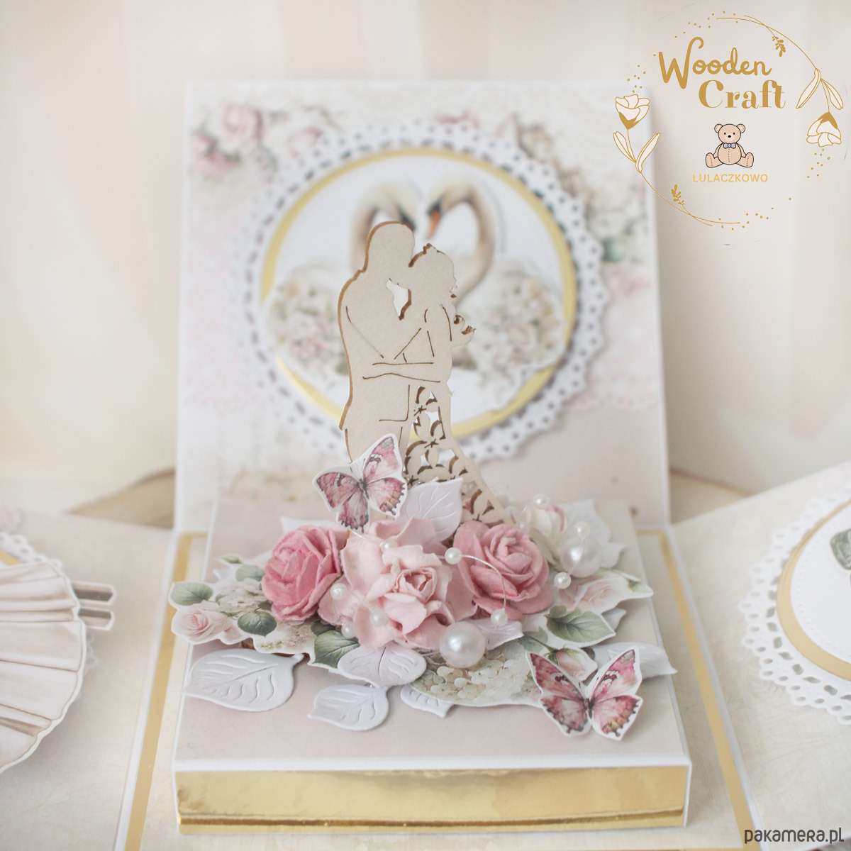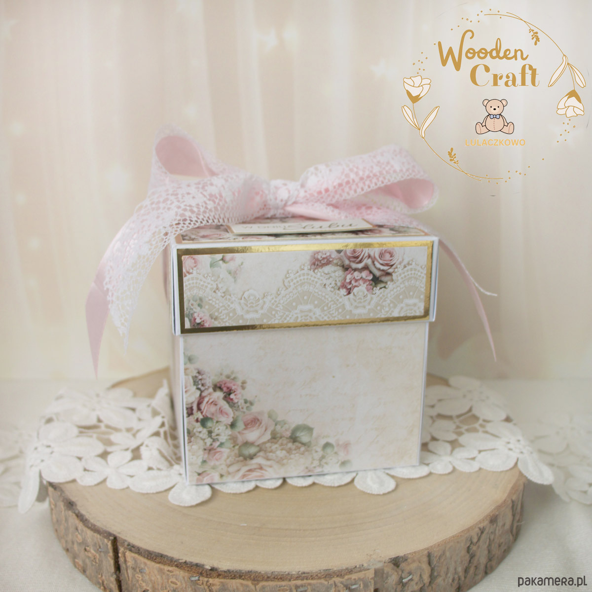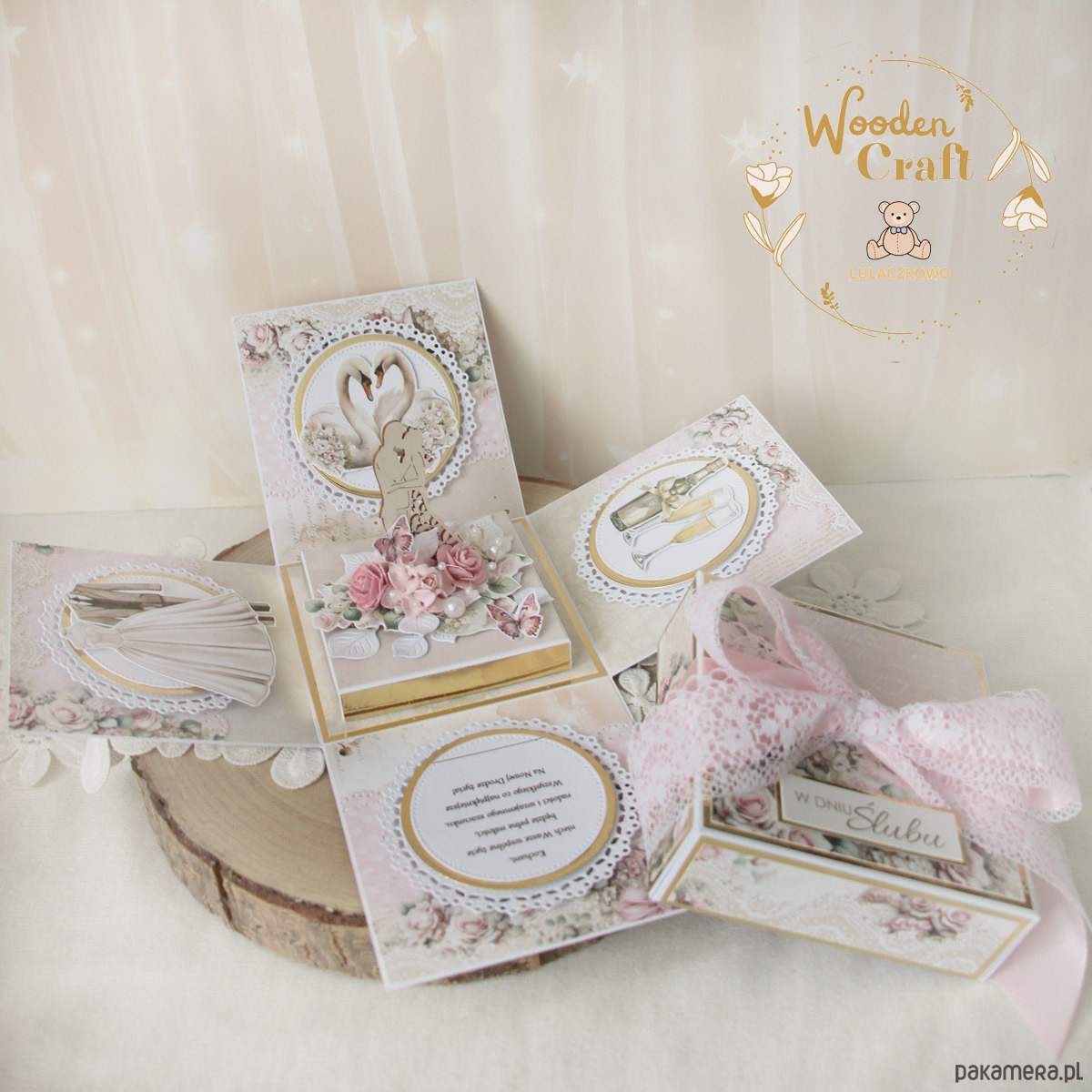 Przepiękny, romantyczny exploding box ślubny, utrzymany w odcieniach beżu, delikatnego różu i bieli z dodatkiem złotych błyszczących akcentów. Box wykonany z dbałością o każdy detal, z przepięknej kolekcji papierów "Today". Wieczko ozdobione koronkową kokardą oraz napisem "W Dniu Ślubu". W środku znajduje się prześliczna tekturka 3D Para Młoda ozdobiona kompozycją z papierowych kwiatów, a pod nią umieszczone zostało mini pudełeczko do którego można włożyć prezent pieniężny. Na ściankach boxa znalazły się grafiki pary łabędzi, sukni ślubnej i garnituru, a także kieliszków i szampana oraz życzenia.