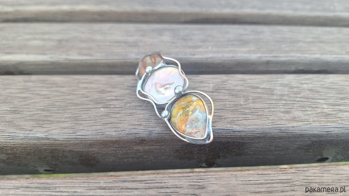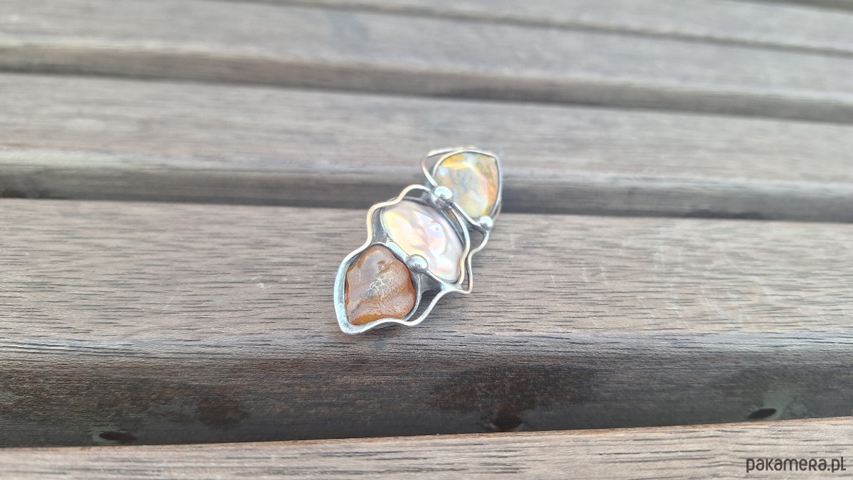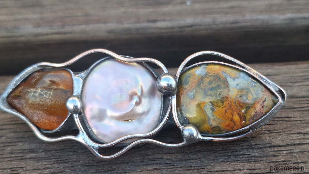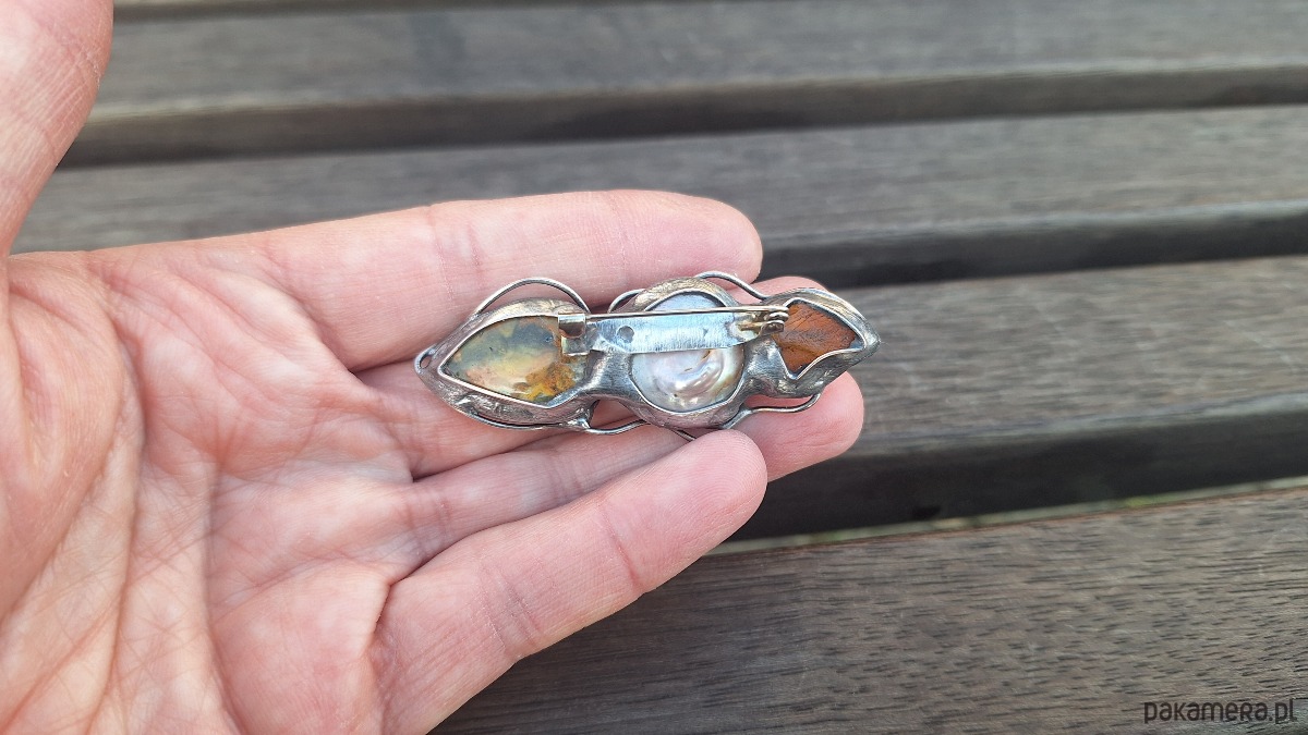 Broszka wykonana z miedzi, cyny,perły, bursztynu i jaspisu. Wymiary ok. 6 na 2 cm. Zapięcie metalowe.