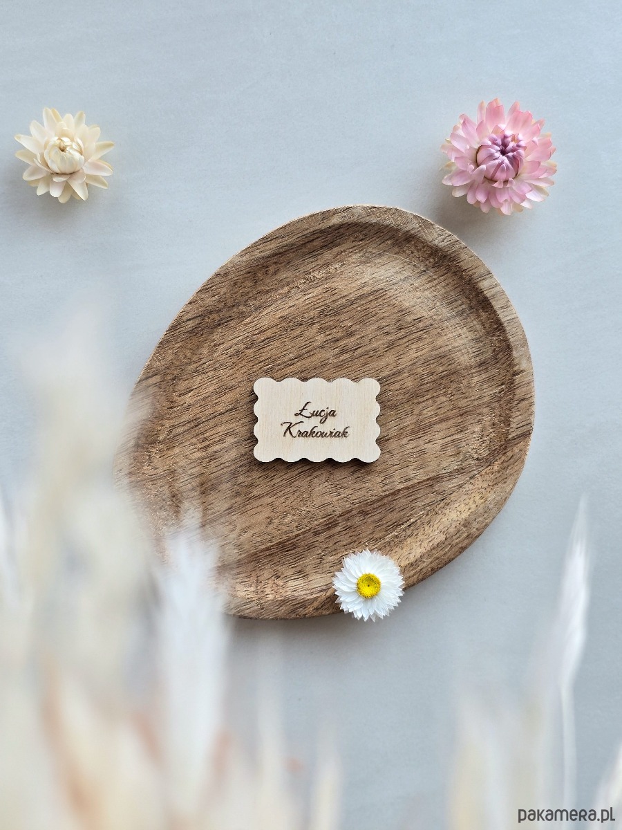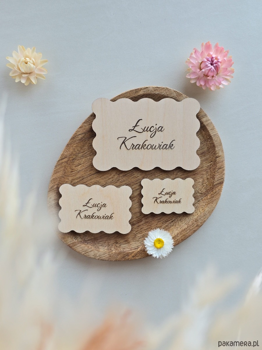 Drewniane winietki z grawerem to elegancki dodatek do dekoracji stołu na wesele, przyjęcie komunijne lub inną uroczystość. Pomagają w organizacji miejsc, a jednocześnie pięknie dopełniają aranżację stołu. Każda winietka posiada grawerowany napis według przesłanej listy gości (np. imię, imię i nazwisko, pseudonim, forma grzecznościowa).