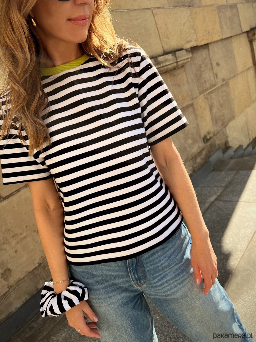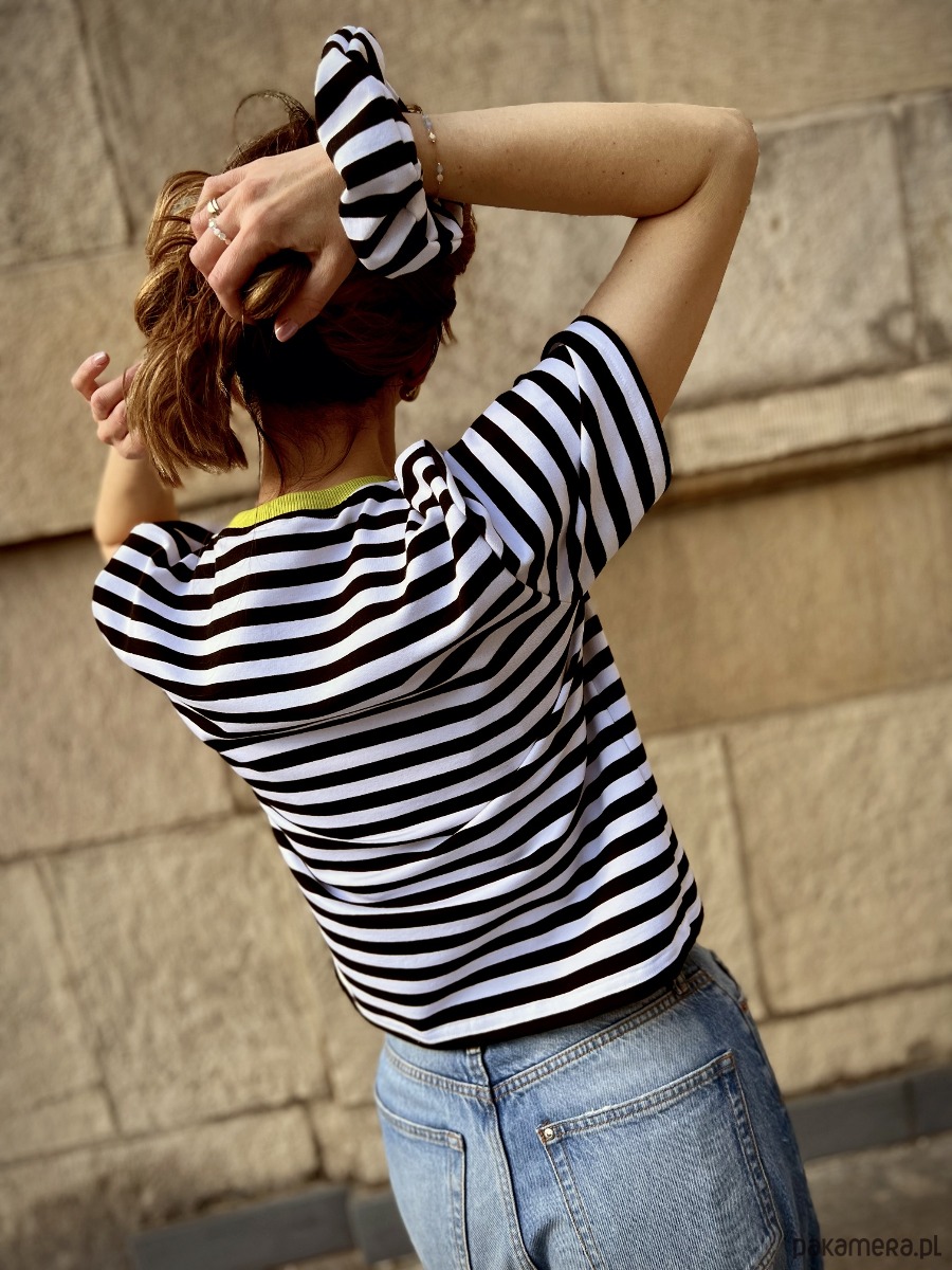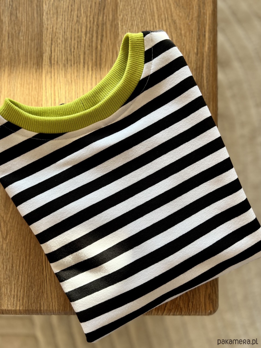 Wyróżniają go; fantazyjne połączenie kolorów black & white z limonkowym ściągaczem, najwyższa jakość polskiej produkcji bawełny, mięsisty i gruby splot - 240g/m2, a także absolutnie komfortowa, pudełkowa forma koszulki. Bawełna została poddana farbowaniu reaktywnemu, co gwarantuje trwałość i najwyższą odporność kolorów.