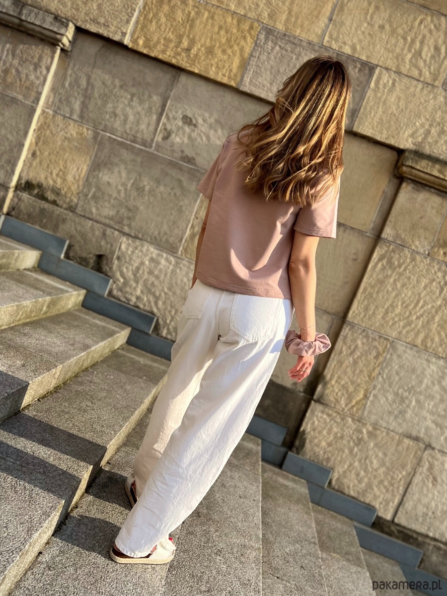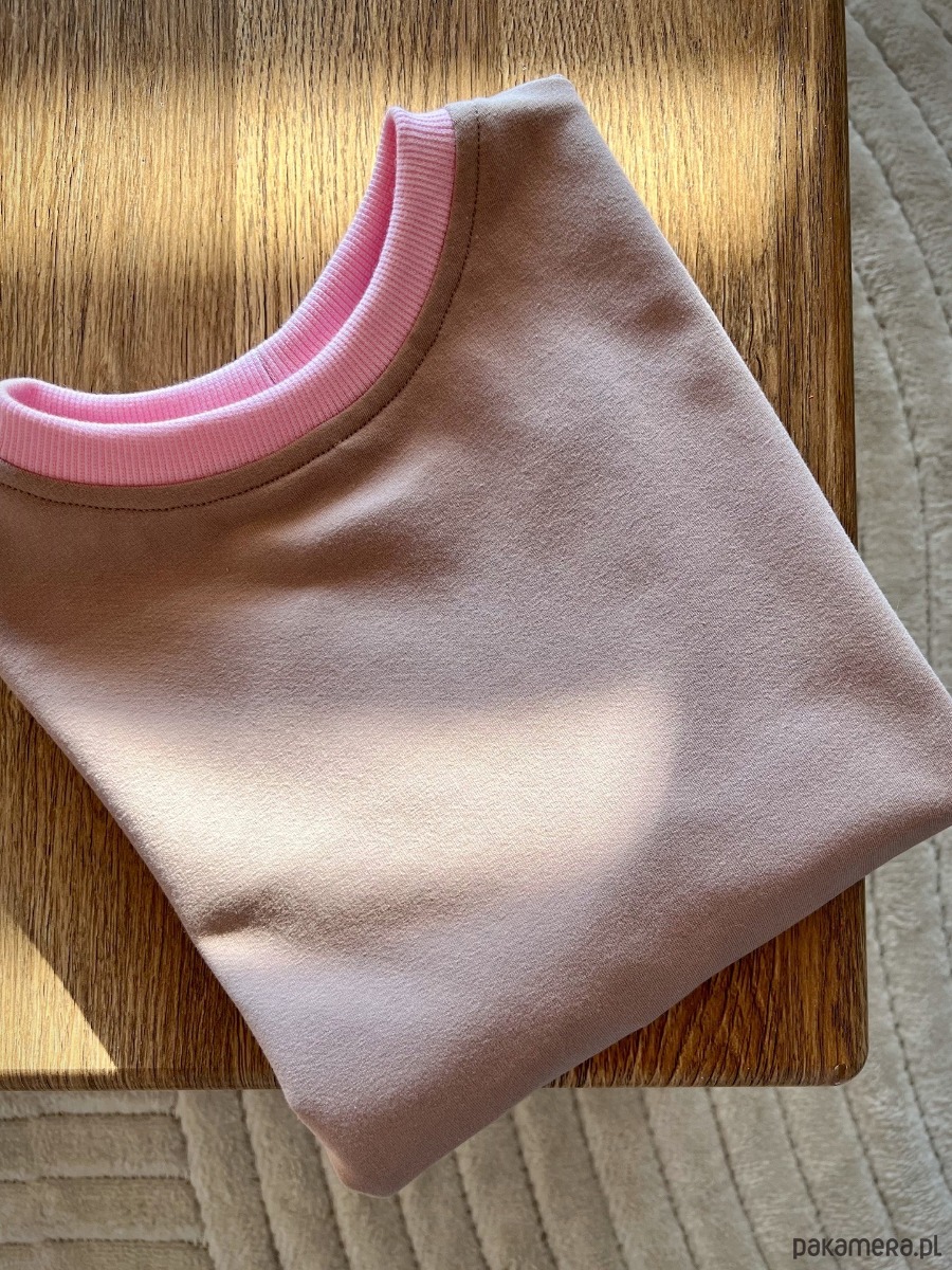 Wyróżniają go; fantazyjne połączenie koloru bazowego nude ze ściągaczem w pastelowym różu, najwyższa jakość polskiej produkcji bawełny, mięsisty i gruby splot - 260g/m2, a także absolutnie komfortowa, pudełkowa forma koszulki. Bawełna została poddana farbowaniu reaktywnemu, co gwarantuje trwałość i najwyższą odporność kolorów.