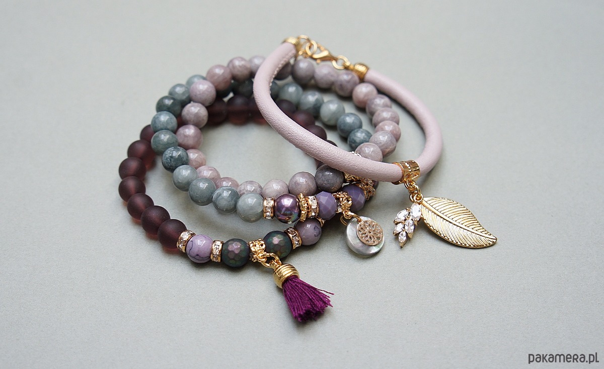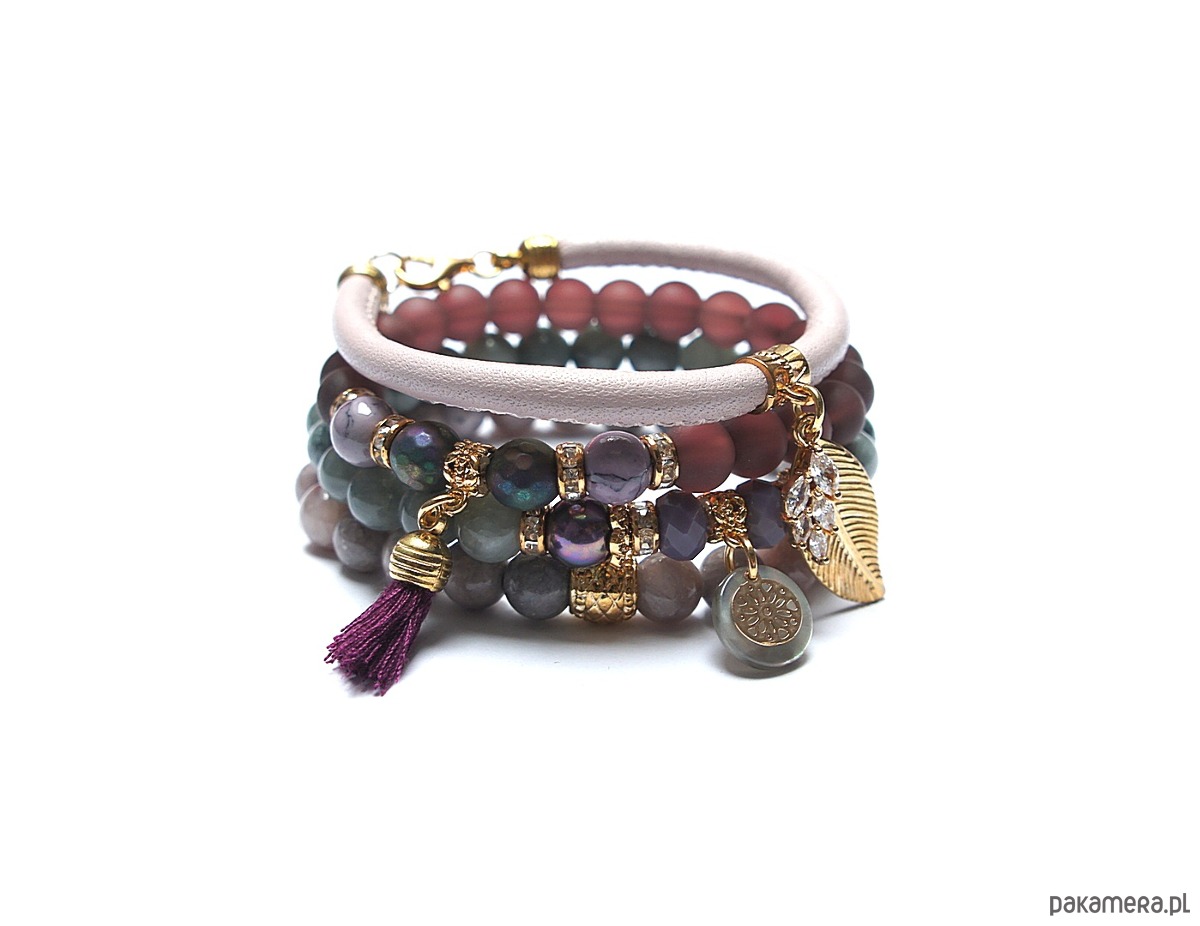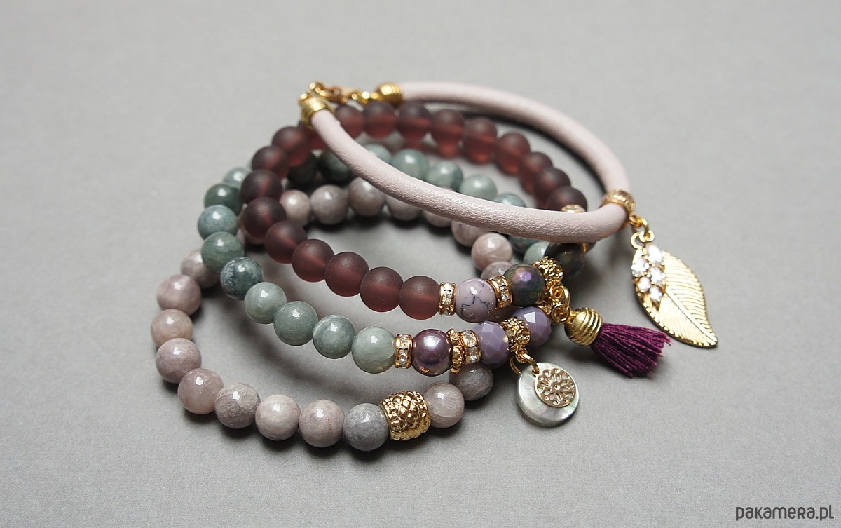 Komplet czterech bransoletek wykonanych z naturalnych kamieni - agat platerowany [8mm], jaspis [8mm], marmur [8mm], howlit [9mm], pereł majorka [8mm], matowego szkła [8mm], rzemienia z ekologicznej skóry, chwostu, zawieszki z żywicy, zawieszki wysadzanej cyrkoniami oraz elementów metalowych w kolorze złotym. Bransoletki pasują na nadgarstek 15,5-16,5cm.