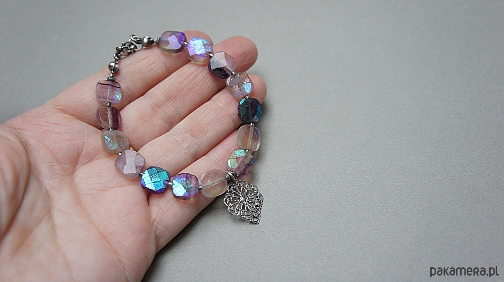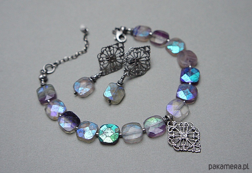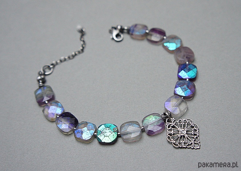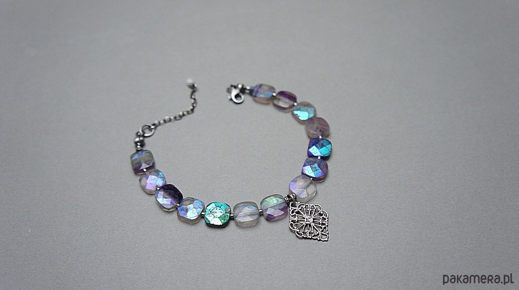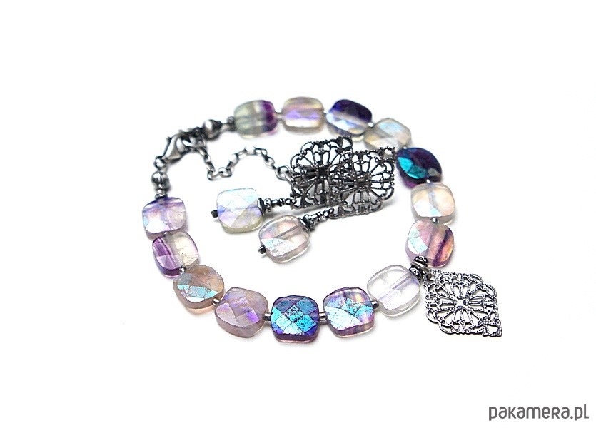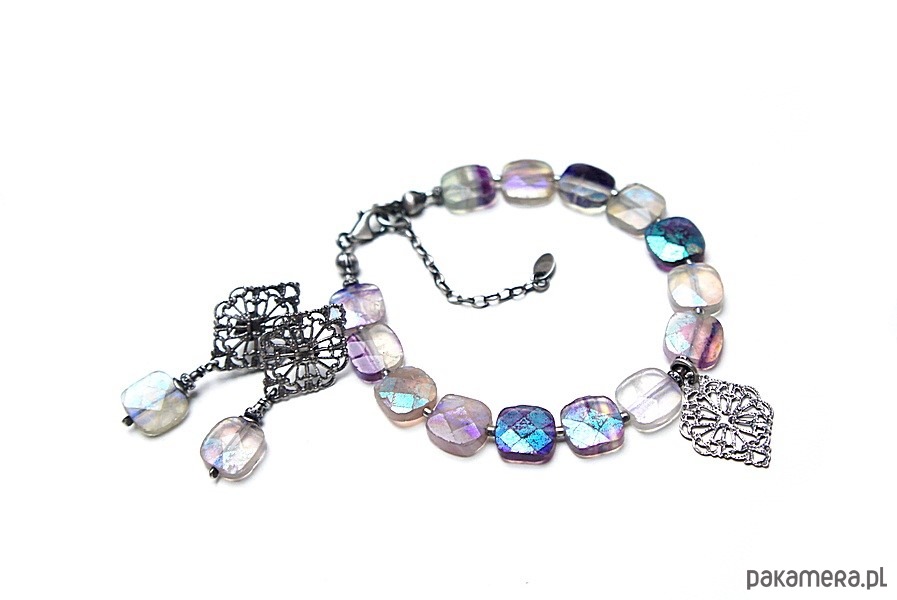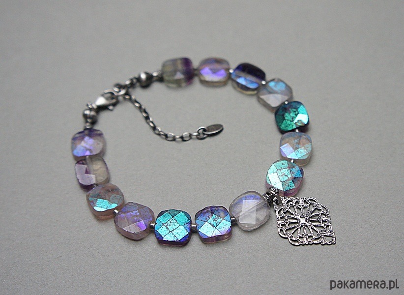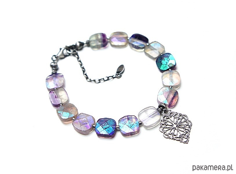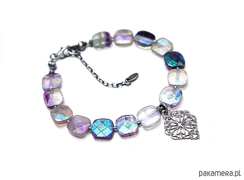 Bransoletka wykonana ze srebra [pr.925] w połączeniu z fasetowanymi poduszeczkami fluorytów pokrytymi powłoką mystic [10mm x 10mm - kamienie są bardzo surowe z licznymi niedoskonałościami, pięknie się iskrzą]. Całość oksydowana i przetarta. Całkowita długość bransoletki: 19cm plus ozdobna przedłużka. Biżuteria ozdobnie zapakowana.