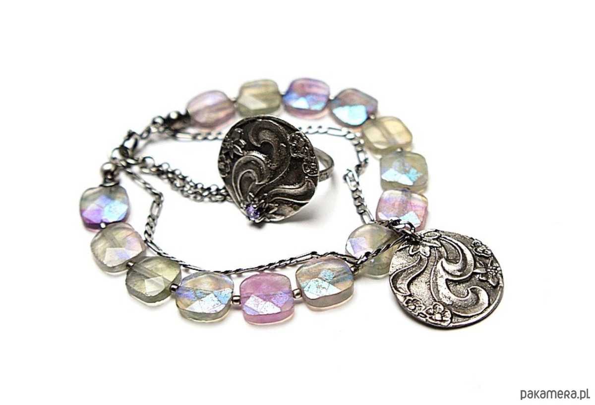 Bransoletka wykonana ze srebra [pr.925] w połączeniu z fasetowanymi poduszeczkami fluorytów pokrytych powłoką mystic [10mm x 10mm - kamienie są bardzo surowe z licznymi niedoskonałościami, pięknie się iskrzą] oraz własnoręcznie wykonaną zawieszką [21mm]. Całość oksydowana i przetarta. Całkowita długość bransoletki: 18,5cm plus ozdobna przedłużka. Biżuteria ozdobnie zapakowana.