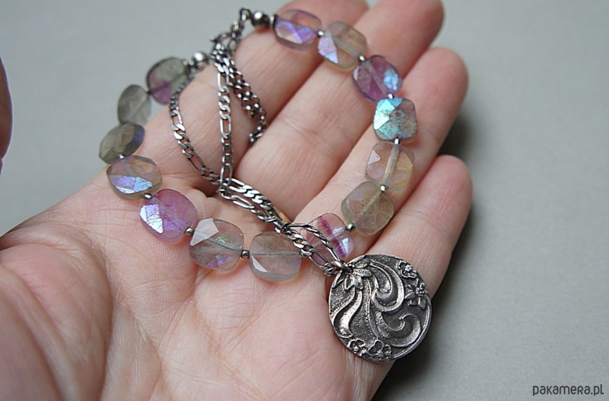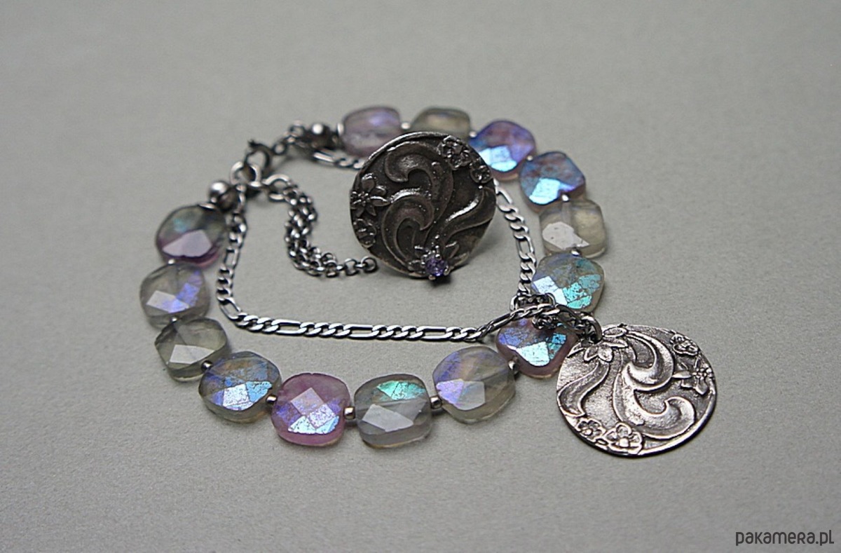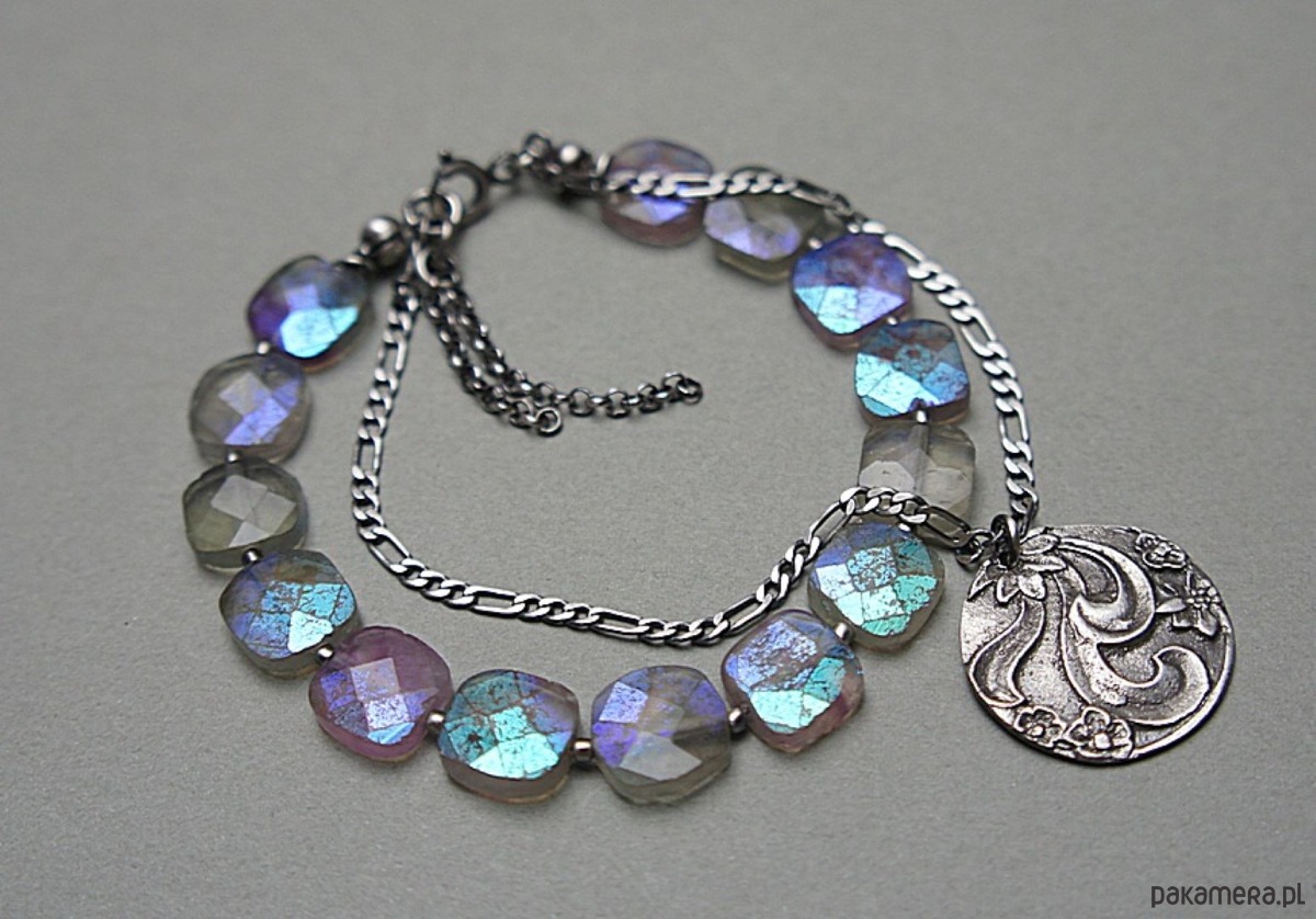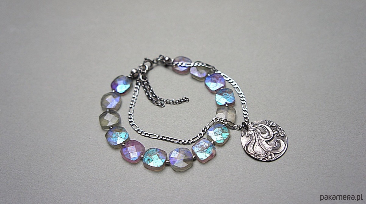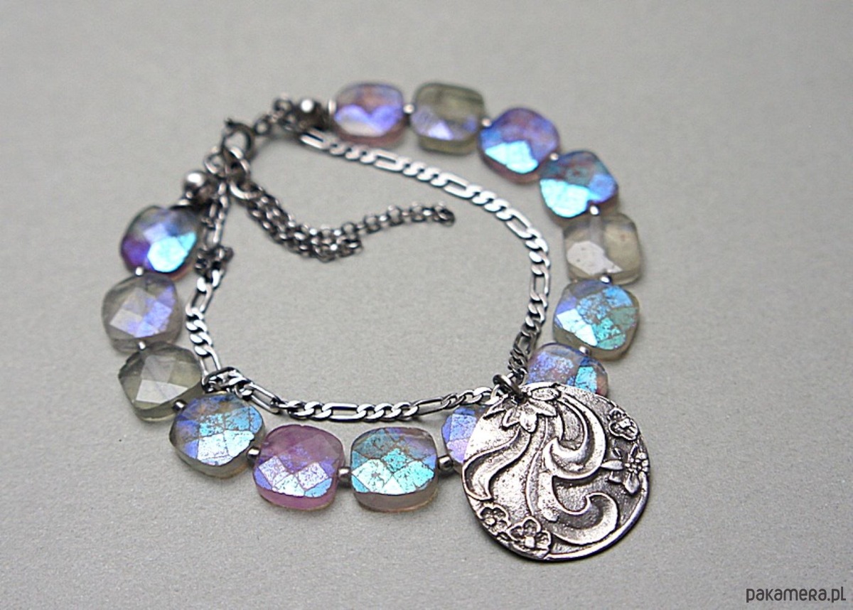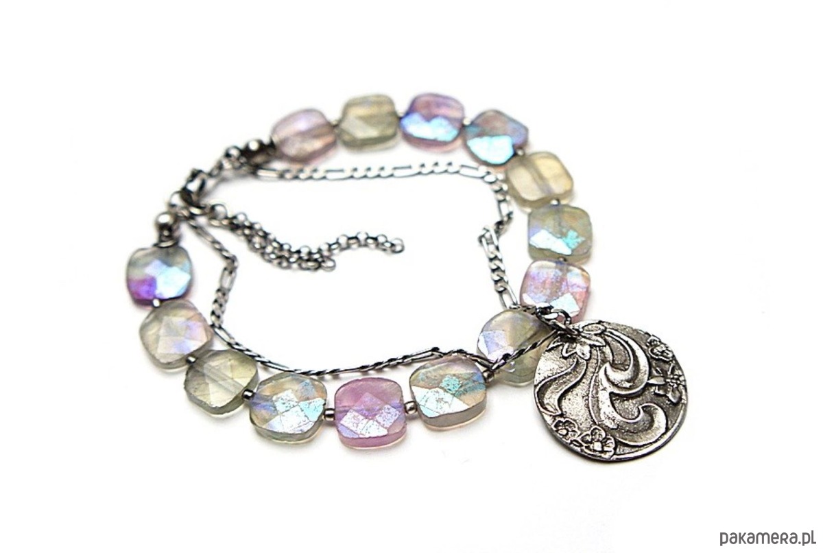 Bransoletka wykonana ze srebra [pr.925] w połączeniu z fasetowanymi poduszeczkami fluorytów pokrytych powłoką mystic [10mm x 10mm - kamienie są bardzo surowe z licznymi niedoskonałościami, pięknie się iskrzą] oraz własnoręcznie wykonaną zawieszką [21mm]. Całość oksydowana i przetarta. Całkowita długość bransoletki: 18,5cm plus ozdobna przedłużka. Biżuteria ozdobnie zapakowana.