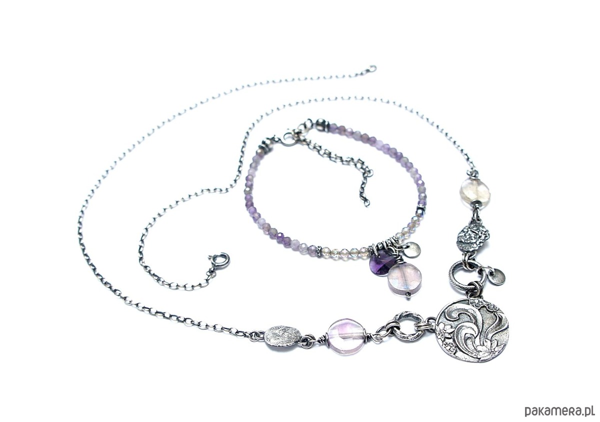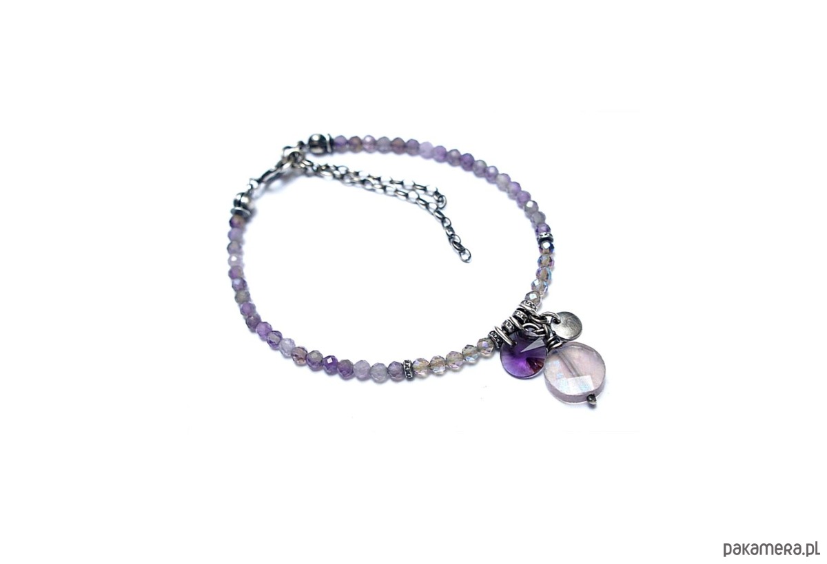 Bransoletka wykonana ze srebra pr. 925 w połączeniu z fasetowanych ametystów [3mm] ,fasetowanych kwarców dymnych z efektem mystic [3mm] oraz monetką fluorytu [kamień surowy,postarzany z efektem mystic 10mm] oraz kryształkiem rivoli [8mm] . Srebro oksydowane i przetarte. Całkowita długość bransoletki 18cm plus ozdobna przedłużka.