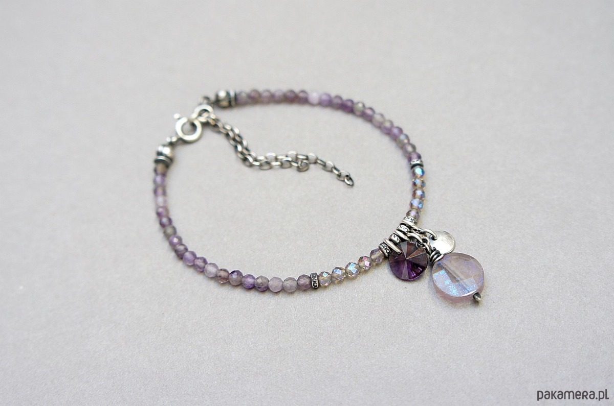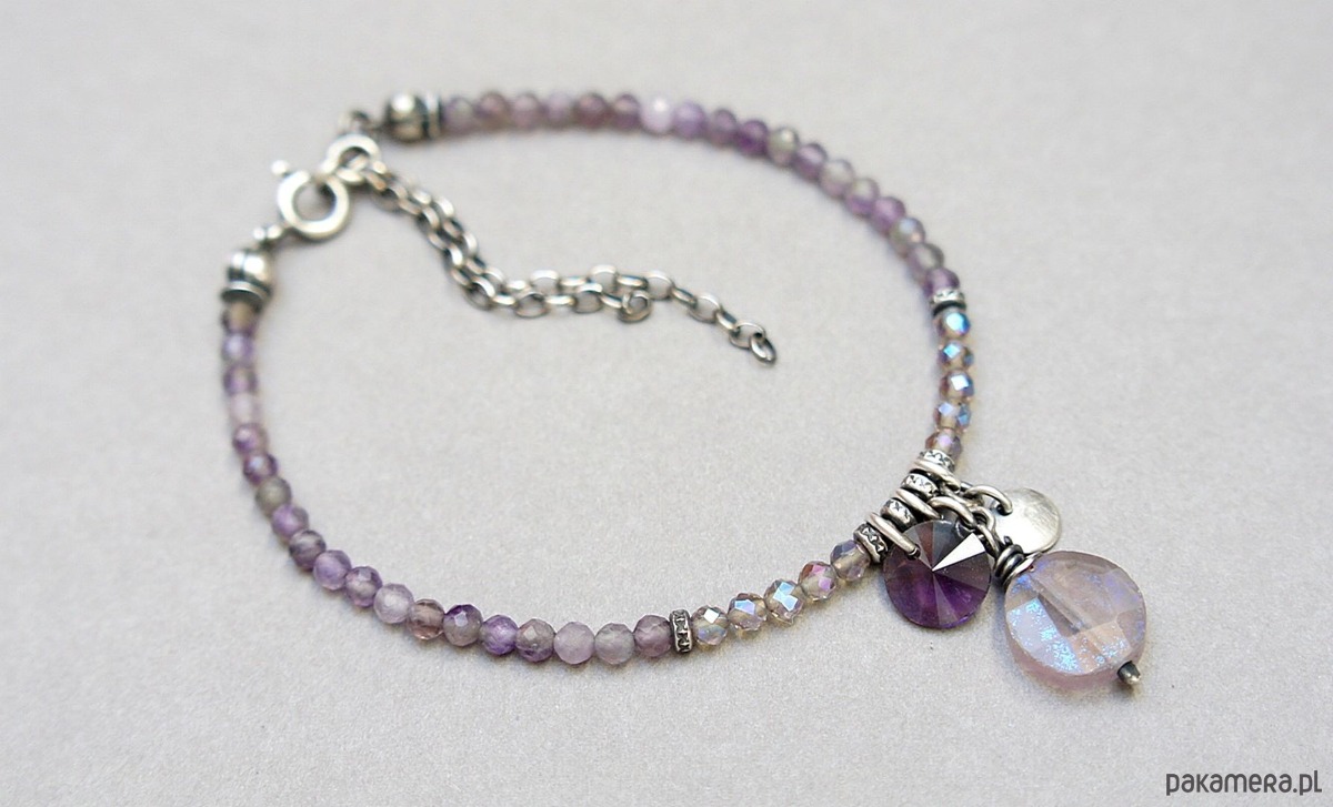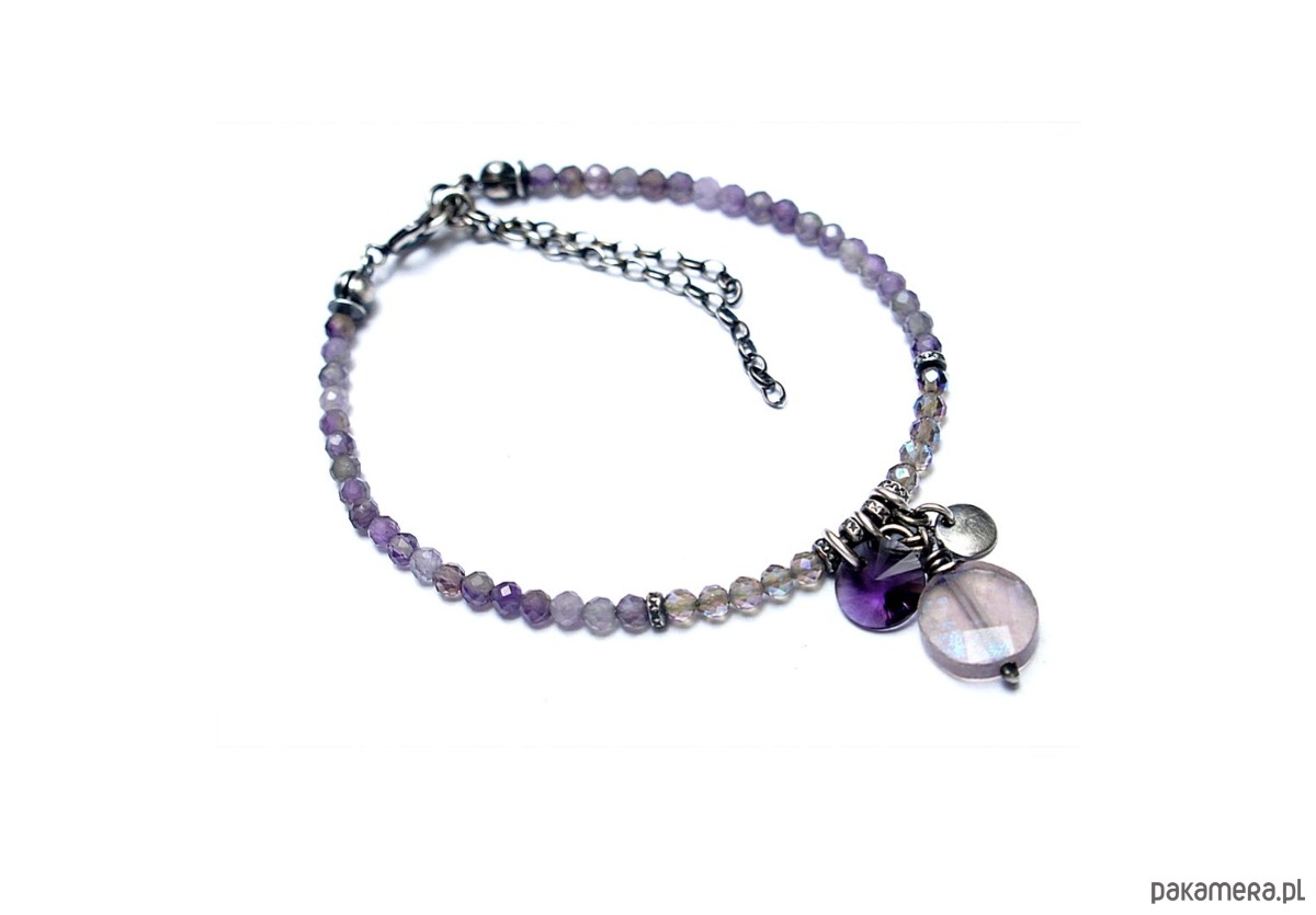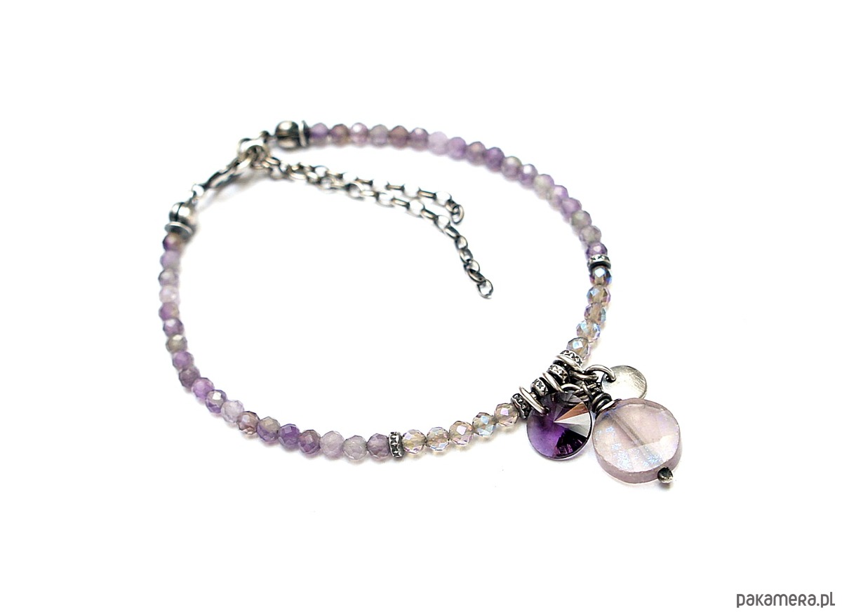 Bransoletka wykonana ze srebra pr. 925 w połączeniu z fasetowanych ametystów [3mm] ,fasetowanych kwarców dymnych z efektem mystic [3mm] oraz monetką fluorytu [kamień surowy,postarzany z efektem mystic 10mm] oraz kryształkiem rivoli [8mm] . Srebro oksydowane i przetarte. Całkowita długość bransoletki 18cm plus ozdobna przedłużka.