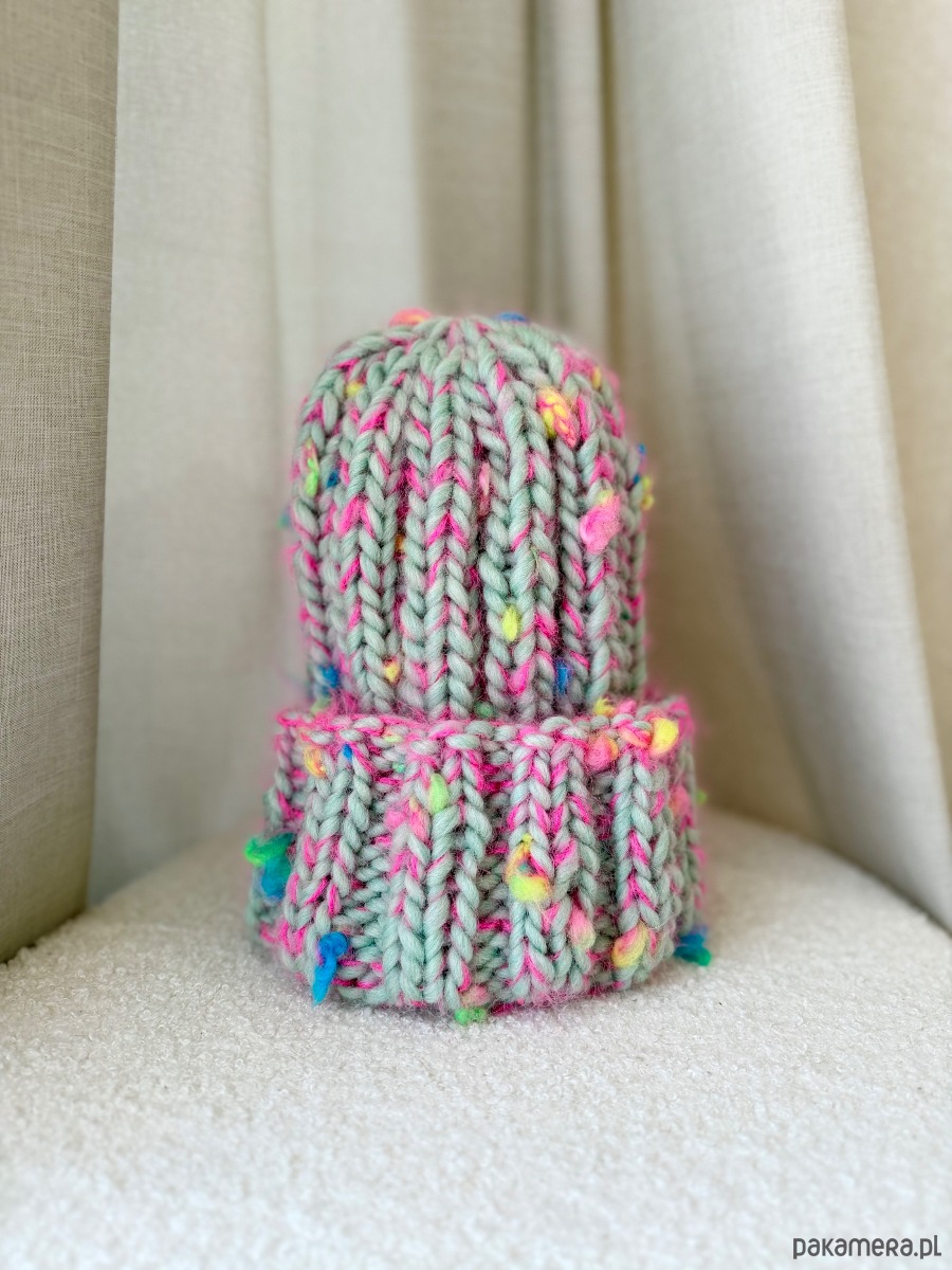 Czapka na bazie naturalnej włóczki 100% wełna z kolorowym dodatkiem w postaci nitki wykonanej z moheru, akrylu i wełny