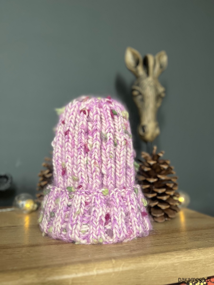 Czapka na bazie naturalnej włóczki 100% wełna z kolorowym dodatkiem w postaci nitki wykonanej z moheru, akrylu i wełny oraz cieniutkiej nitki z alpaki i jedwabiu