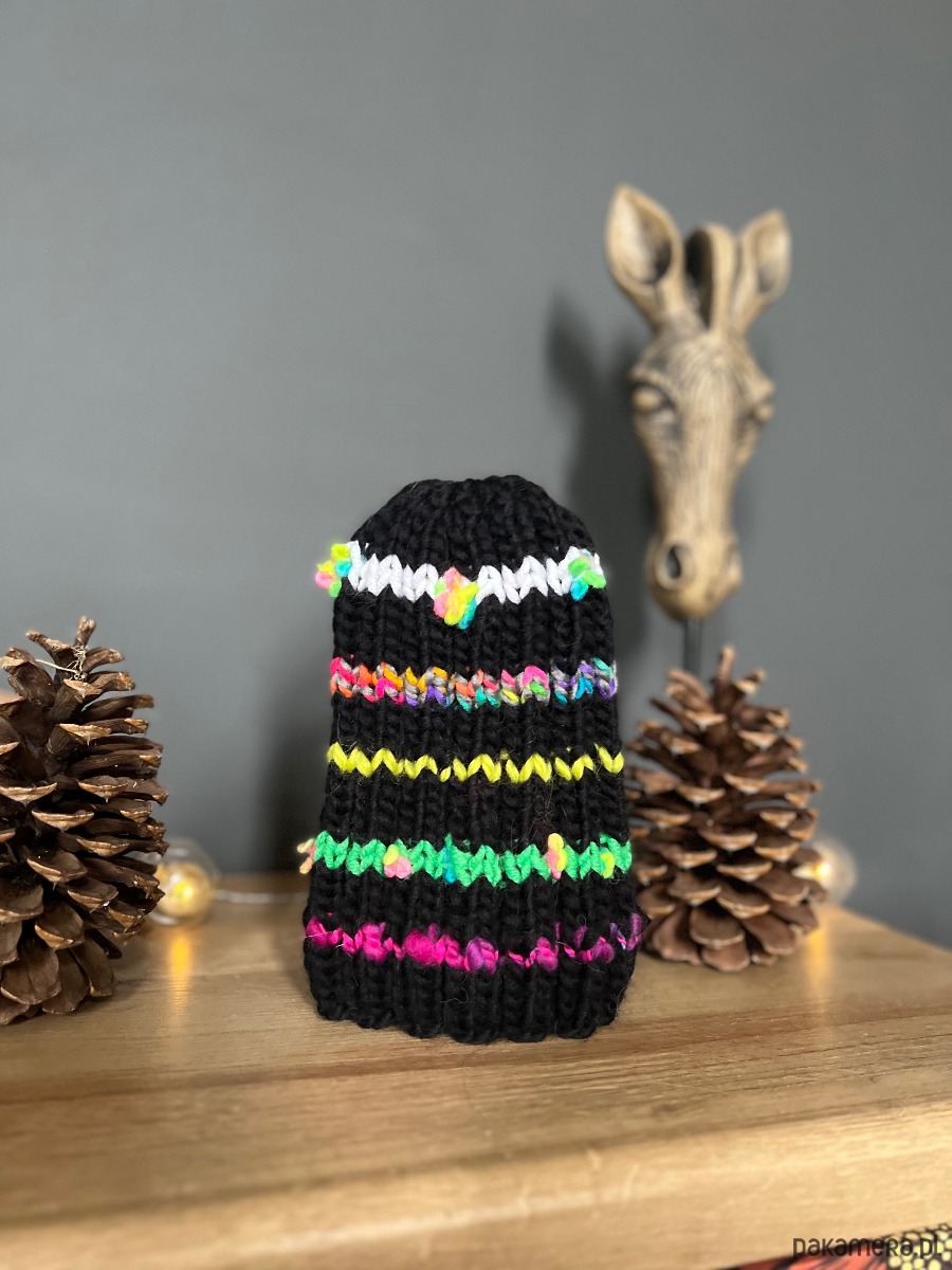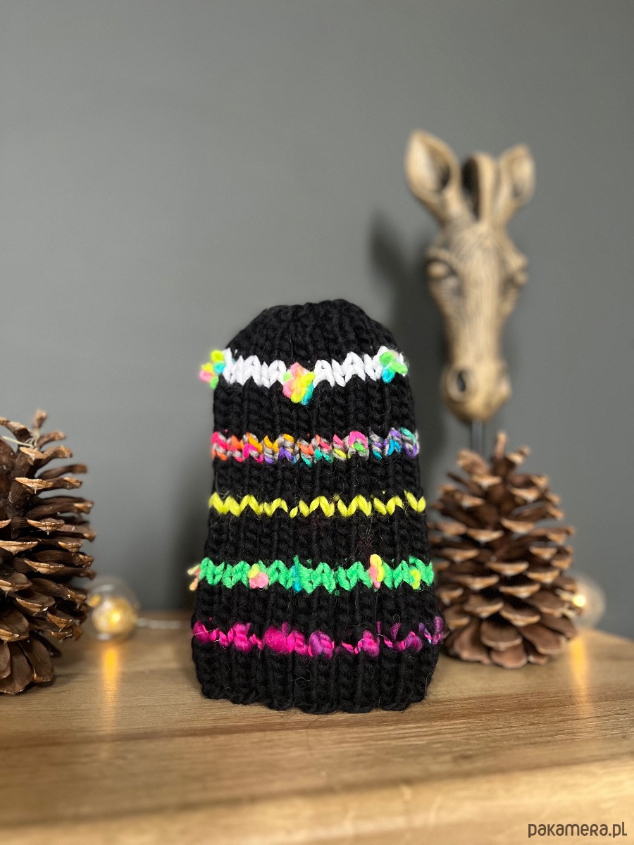 Czapka na bazie naturalnej włóczki 100% wełna z kolorowymi dodatkami o różnych składach (moher, wełna, akryl)