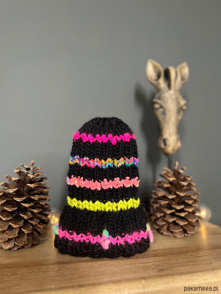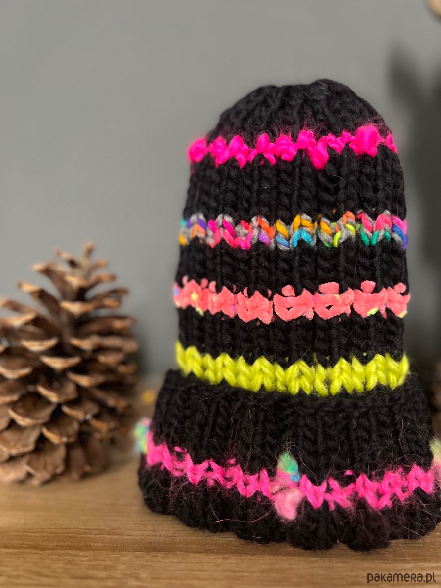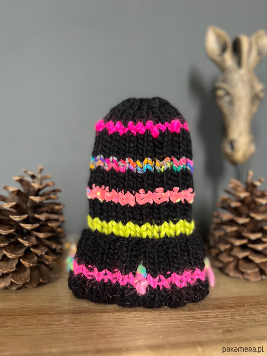 Czapka na bazie naturalnej włóczki 100% wełna z kolorowymi dodatkami o różnych składach (moher, wełna, akryl)