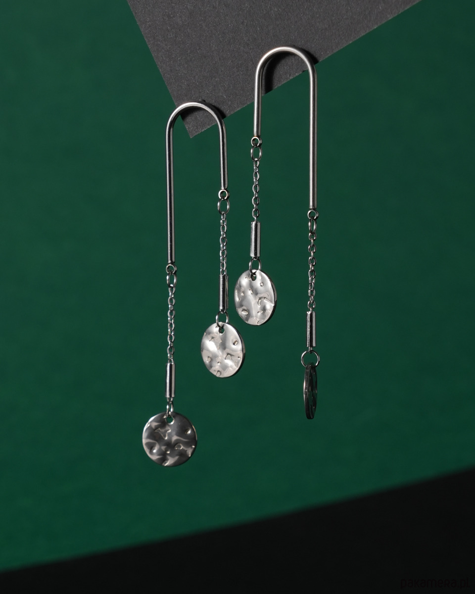 Nowoczesne i bardzo fantazyjne kolczyki w całości wykonane ze STALI SZLACHETNEJ. Okrągłe blaszki o nieregularnej powierzchni zawieszone na krótkich łańcuszkach, a całość zamontowana na okazałych biglach o oryginalnym, wygiętym kształcie. Kolczyki są unikatowe i na pewno będą przykuwać wzrok :)