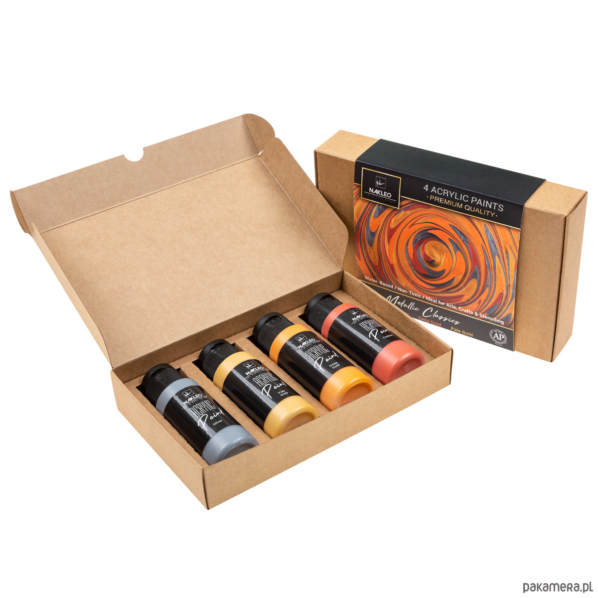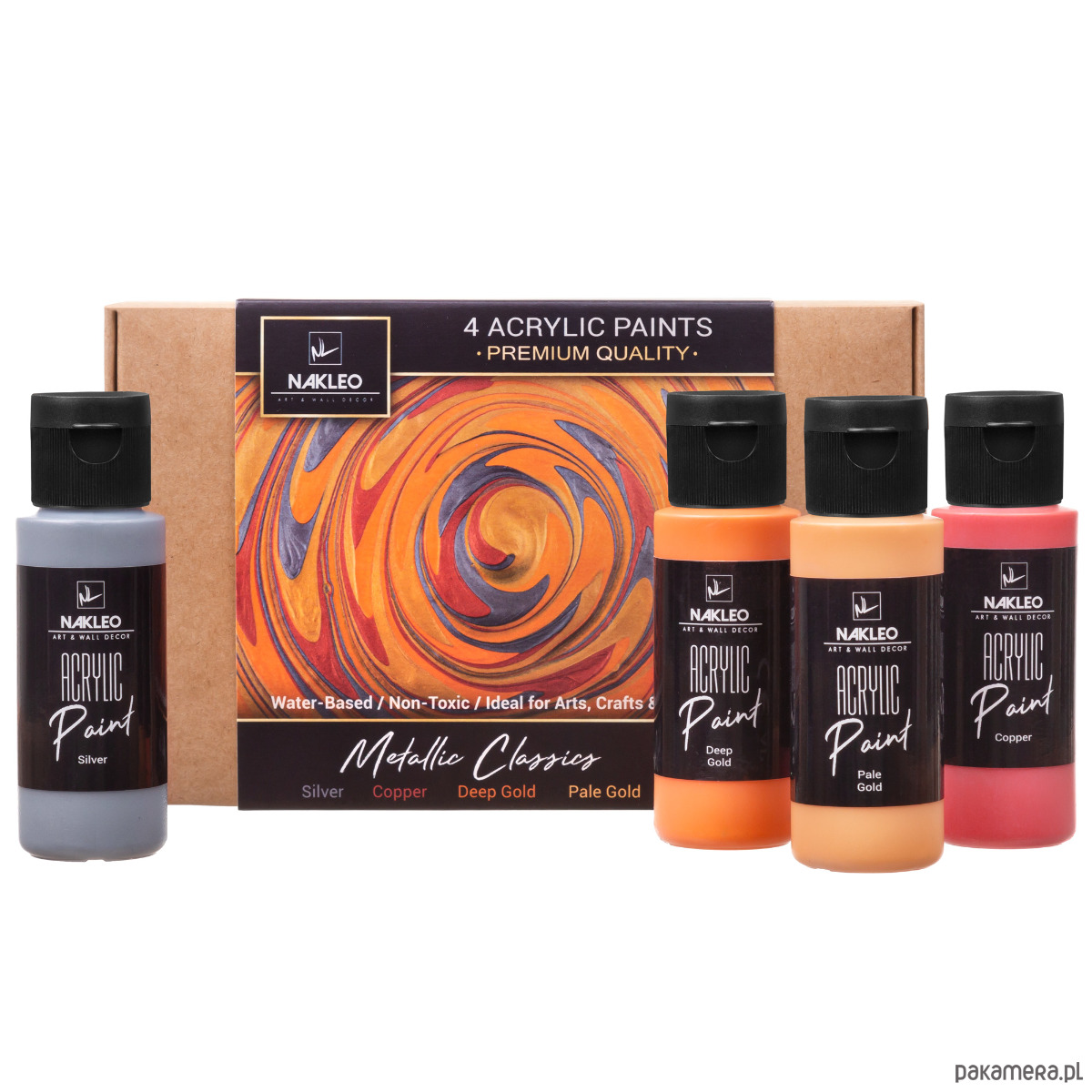 Do serii Nakleo Accessories dołączają farby akrylowe. Tropical Desire, Retro Chic, Deep Ocean, Vibrant Fun, Rococo Pastel, Metallic Classics to sześć zestawów po cztery kolory w każdym, które zostały starannie dopasowane do stworzenia unikalnych dekoracji. Każda tubka zawiera 60ml wysokiej jakości, trwałej farby wyprodukowanej na bazie wody, dzięki czemu skład jest ekologiczny i bezpieczny dla środowiska. Łatwość użycia i szeroki wachlarz barw sprawia, że każdy, nawet największy laik może poczuć się jak artysta.