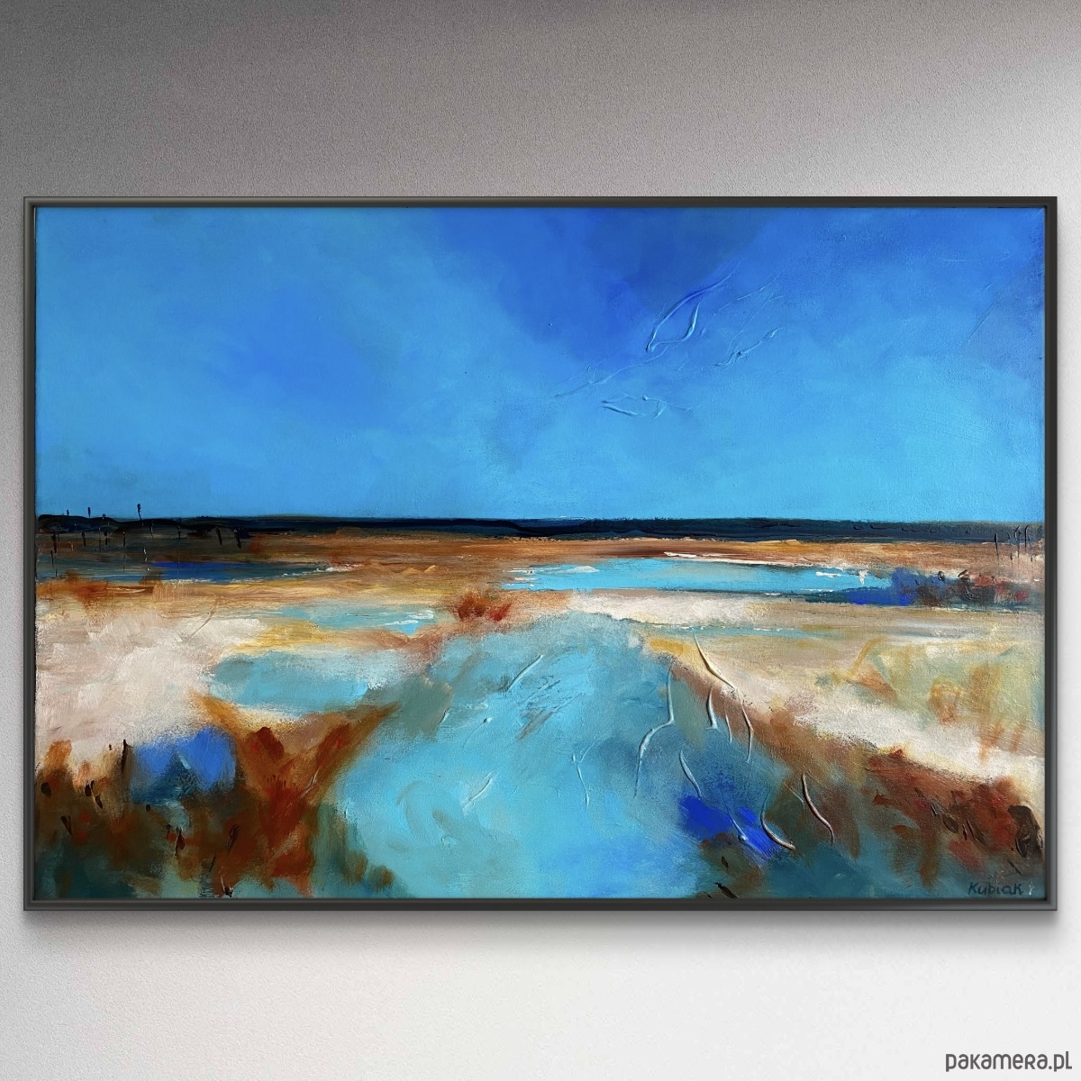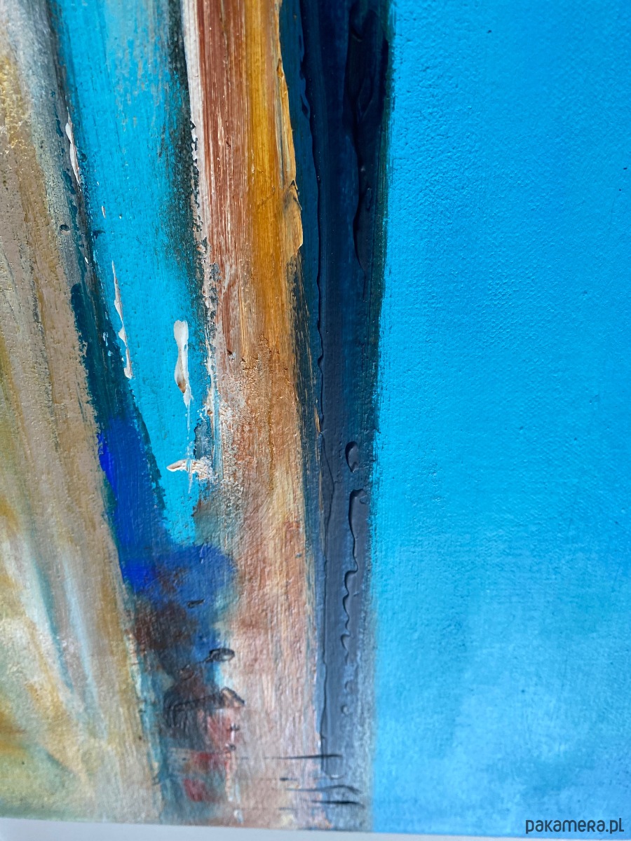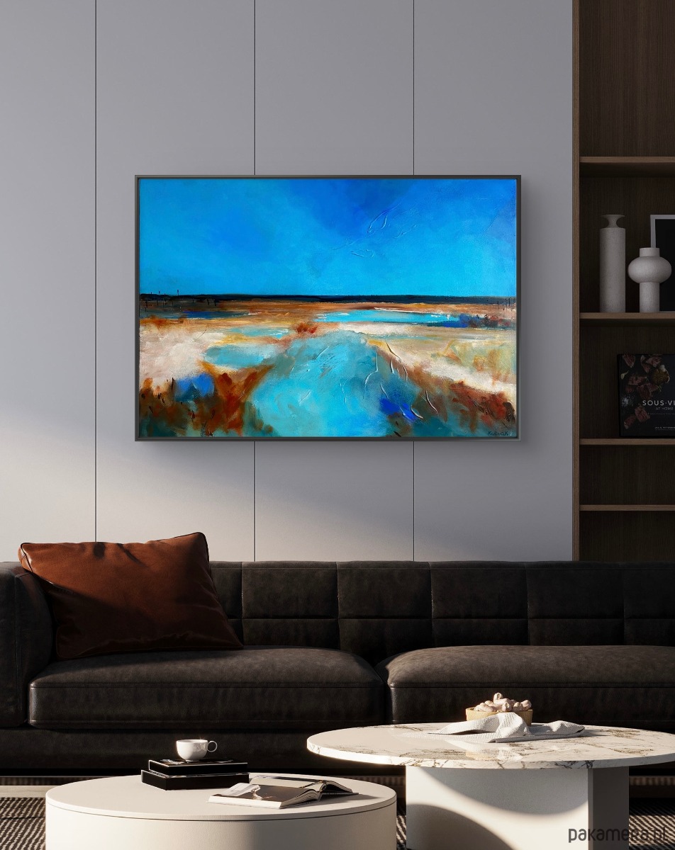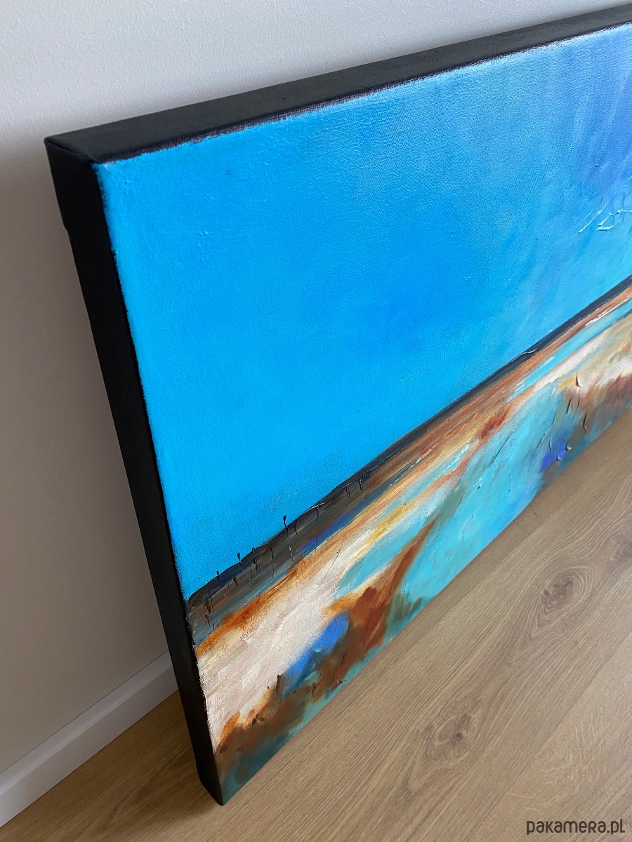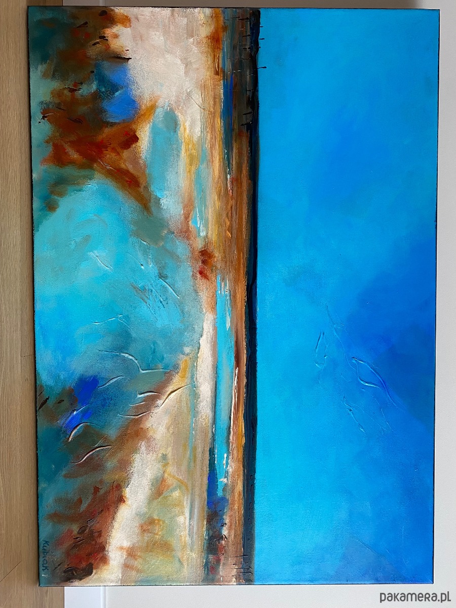 Obraz „FARO” autorstwa Magdy Kubiak to wyjątkowa, ekspresyjna kompozycja inspirowana pięknem natury. Przedstawia rozległą plażę i bezkres oceanu, gdzie dominują głębokie, lazurowe odcienie błękitu, przywodzące na myśl spokój, przestrzeń i świeżość morskiej bryzy. Dynamiczne pociągnięcia pędzla oraz technika impastu nadają dziełu wyrazistą fakturę i trójwymiarowość, dzięki czemu obraz ożywa w zależności od światła i perspektywy.