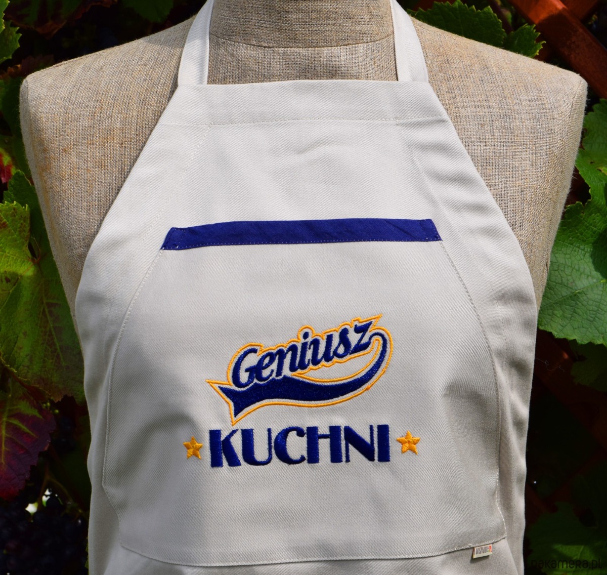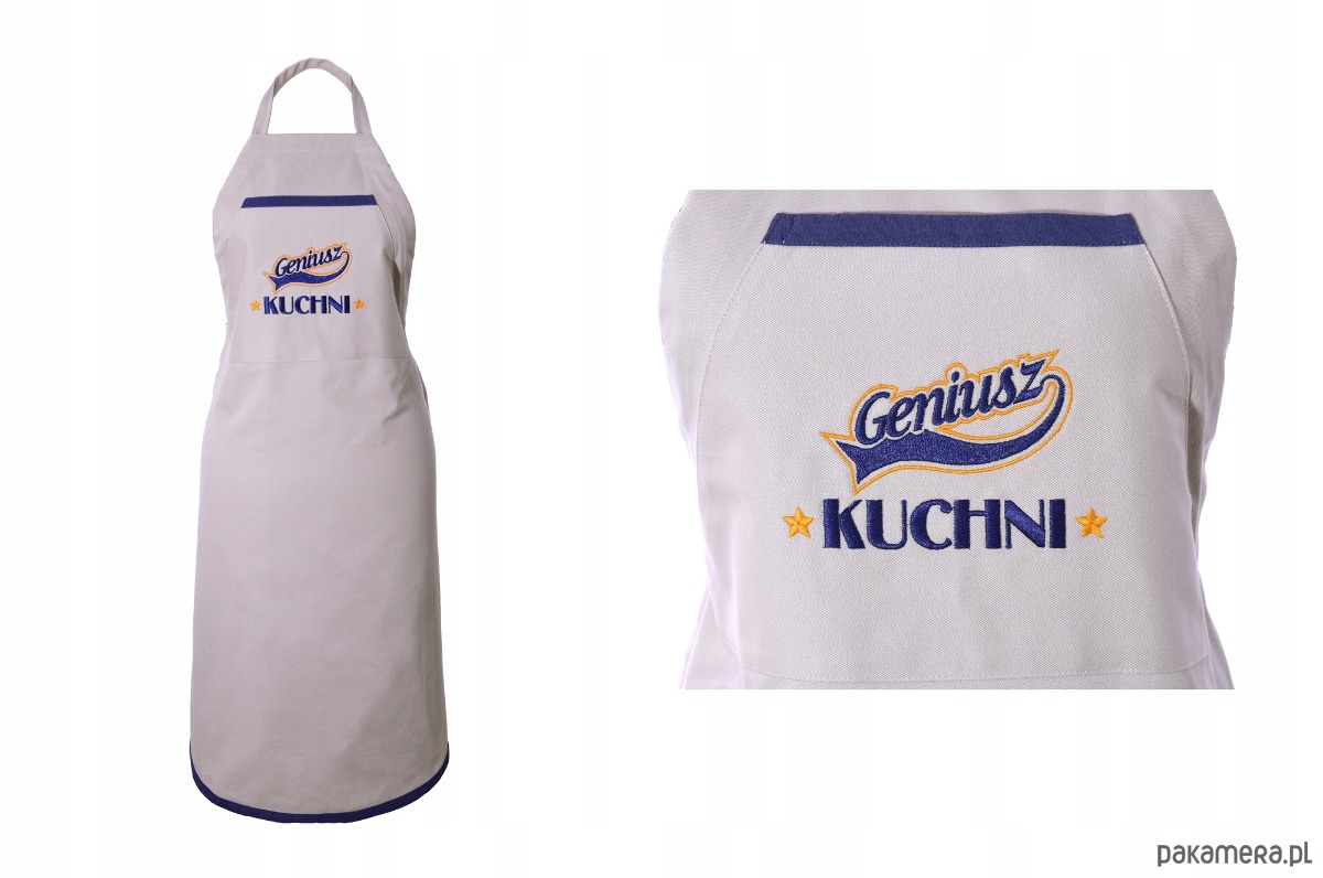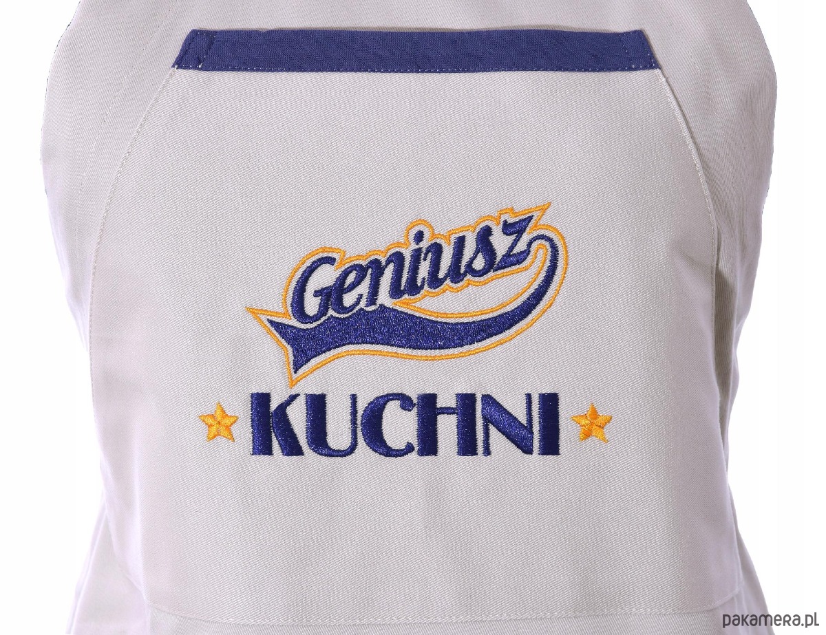 HAFTOWANY FARTUCH KUCHENNY - GENIUSZ KUCHNIFartuch „Geniusz Kuchni” – Profesjonalizm i StylPoczuj się jak prawdziwy wirtuoz smaku! Nasz beżowy fartuch kuchenny bawełniany to idealne połączenie elegancji i funkcjonalności. Wykonany z solidnej tkaniny o wysokiej gramaturze 300g/m2 (98% bawełna), zapewnia wyjątkowy komfort oraz skuteczną ochronę przed zabrudzeniami.Na froncie znajduje się praktyczna kieszeń z precyzyjnym haftem komputerowym. Dynamiczny napis „Geniusz KUCHNI” ozdobiony złotymi gwiazdkami nadaje całości profesjonalnego sznytu. Granatowa lamówka kieszeni oraz dopasowana kolorystyka nici tworzą stylowy kontrast z jasnym tłem. Dzięki regulowanej szelce, fartuch doskonale pasuje na każdą sylwetkę.Dlaczego warto?Polska jakość: Produkt marki Wyszywane, stworzony z najwyższą dbałością o detale.
