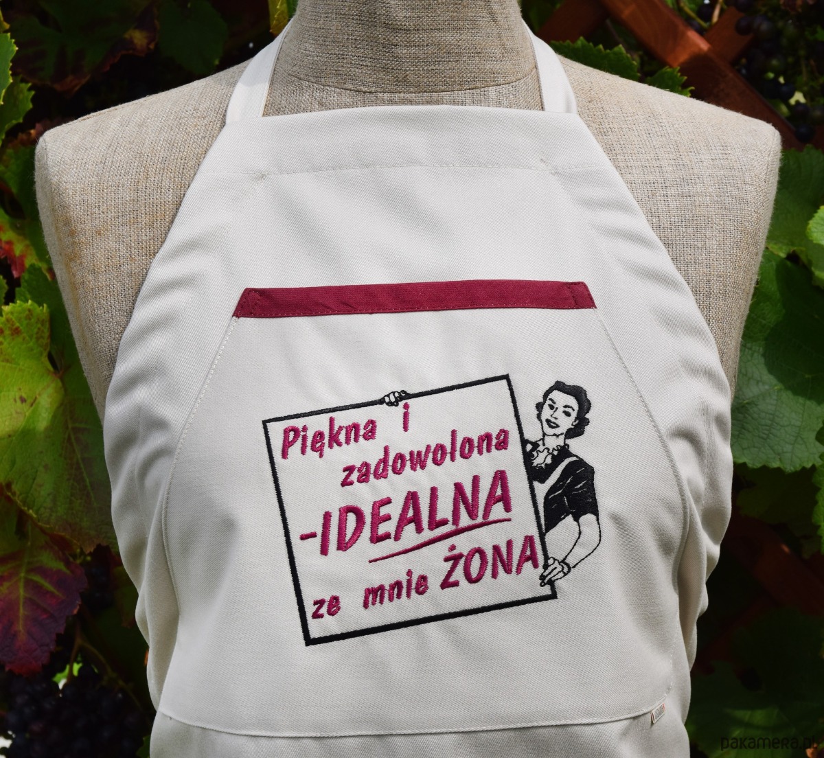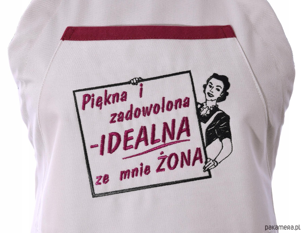 HAFTOWANY FARTUCH KUCHENNY - IDEALNA ŻONAFartuch „Idealna Żona” – Klasyka i Styl w Twojej KuchniPodkreśl domową harmonię w wyjątkowym stylu! Nasz beżowy fartuch kuchenny bawełniany to idealny wybór dla kobiet, które rządzą w kuchni z uśmiechem. Wykonany z solidnej tkaniny o gramaturze 300g/m2 (98% bawełna), zapewnia najwyższy komfort oraz trwałość. Gruby materiał skutecznie chroni ubranie, a naturalny skład pozwala skórze oddychać.Na froncie znajduje się praktyczna kieszeń z misternym haftem komputerowym. Napis „Piękna i zadowolona – IDEALNA żona ze mnie” wraz z grafiką w stylu retro tworzy uroczy i zabawny design. Bordowa lamówka kieszeni oraz dopasowany kolor nici haftu nadają całości elegancki, spójny wygląd.Dlaczego warto?Polska produkcja: Marka Wyszywane to gwarancja precyzji i jakości.