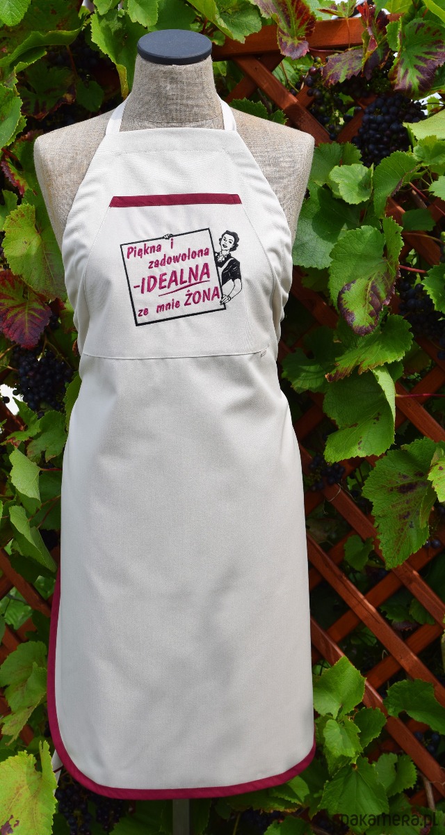 Fartuch Kuchenny bawełniany beżowy haftowany Idealna żona EXTRA PREZENT::