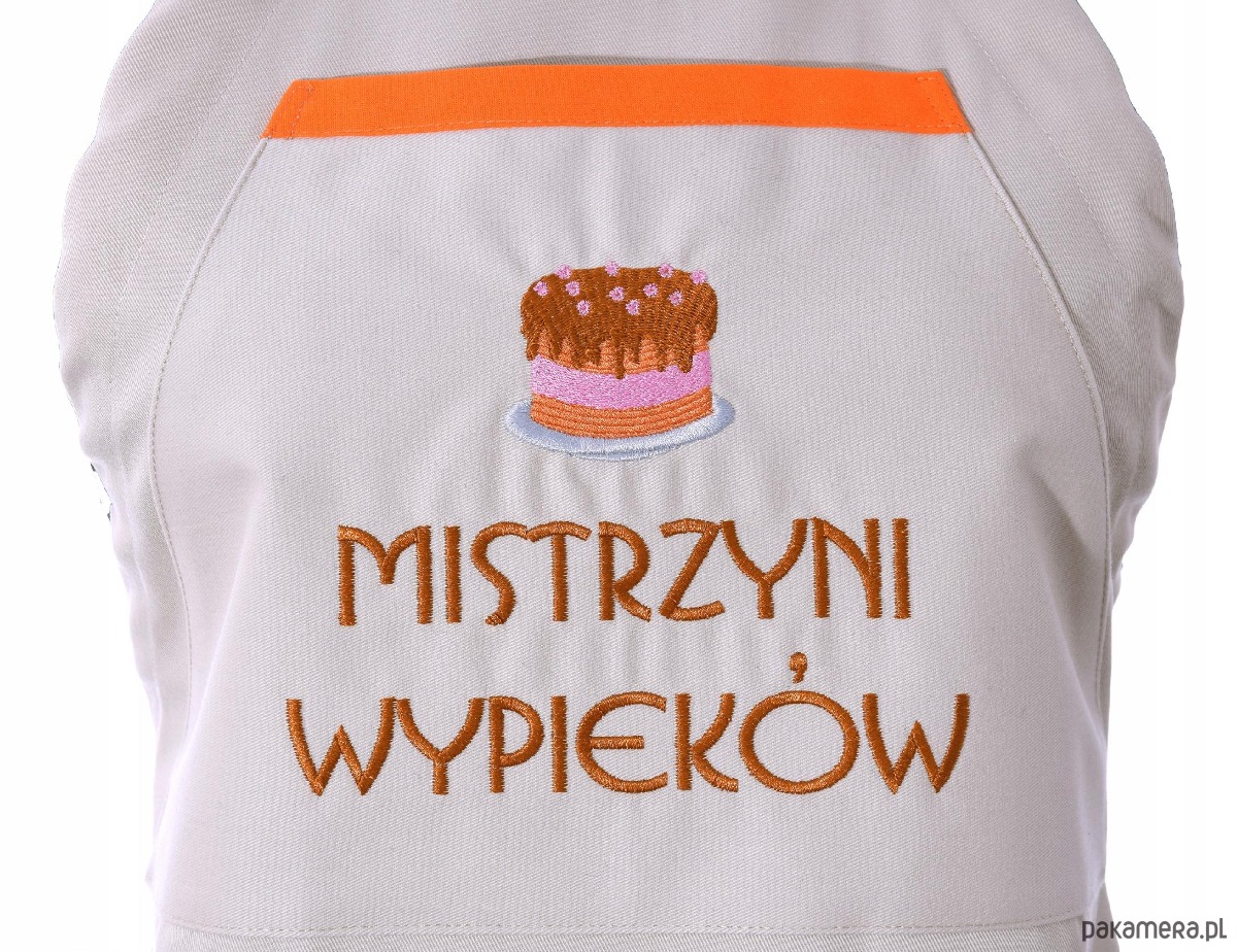 Na froncie znajduje się praktyczna kieszeń z precyzyjnym haftem komputerowym. Napis „Mistrzyni WYPIEKÓW” wraz z grafiką wałka i gwiazdek nadaje produktowi unikalnego charakteru. Brązowa lamówka kieszeni idealnie współgra z jasnym tłem i kolorem haftu. Dzięki regulowanej szelce fartuch doskonale dopasowuje się do każdej sylwetki.