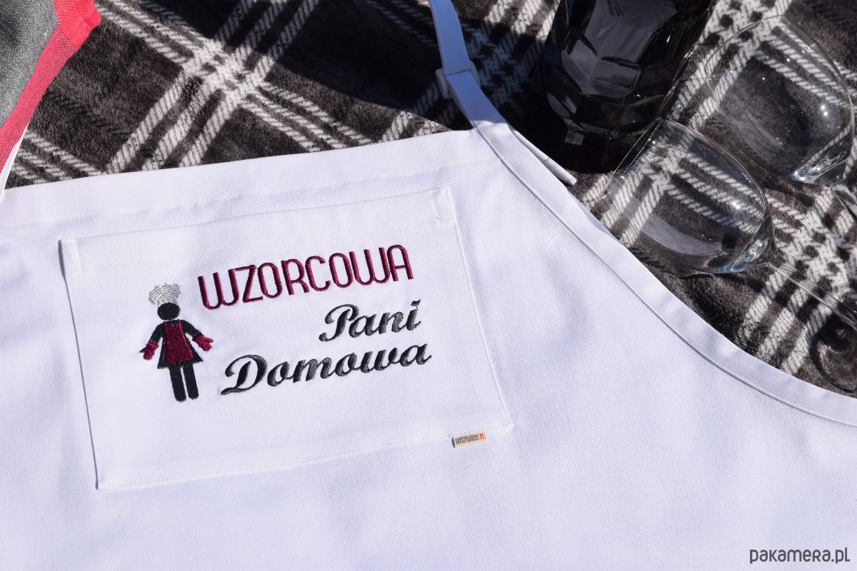 HAFTOWANY FARTUCH KUCHENNY - WZORCOWA PANI DOMOWAFartuch „Wzorcowa Pani Domowa” – Klasa i Styl w Twojej KuchniPoczuj się jak prawdziwa królowa domowych posiłków! Nasz biały fartuch kuchenny bawełniany to idealne połączenie klasycznej elegancji z najwyższą funkcjonalnością. Wykonany z solidnej tkaniny o wysokiej gramaturze 300g/m² (98% bawełna), zapewnia wyjątkowy komfort noszenia oraz doskonałą ochronę ubrań podczas kulinarnych wyzwań. Naturalny materiał jest przewiewny, wytrzymały i niezwykle przyjemny w dotyku.Głównym atutem jest duża kieszeń z precyzyjnym haftem komputerowym. Napis „WZORCOWA Pani Domowa” wraz z grafiką gospodyni w czapce kucharskiej nadaje produktowi unikalny, profesjonalny charakter. Różowe i szare detale haftu pięknie kontrastują z czystą bielą materiału. Dzięki regulowanej szelce, fartuch doskonale dopasowuje się do każdej sylwetki.Dlaczego warto?Polska produkcja: Gwarancja staranności i trwałości od marki Wyszywane.