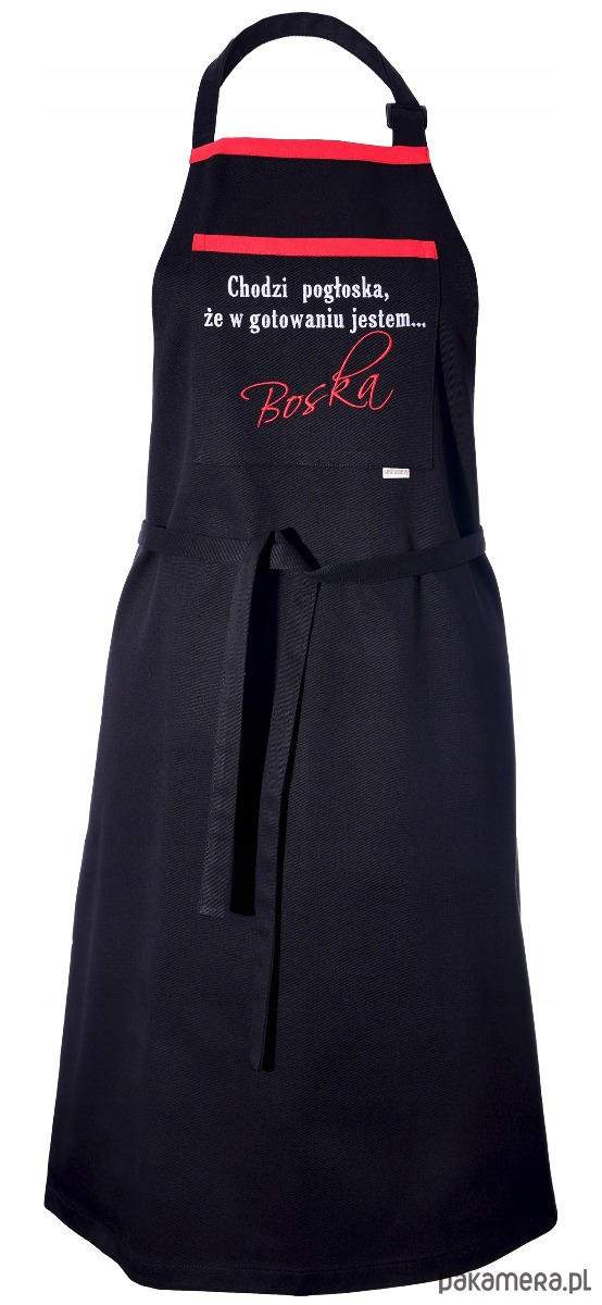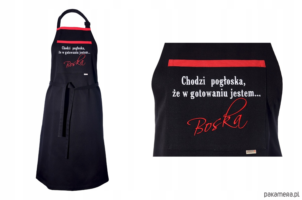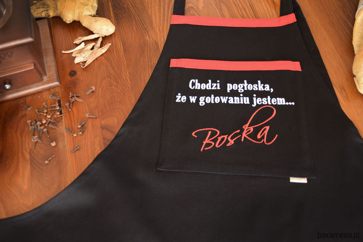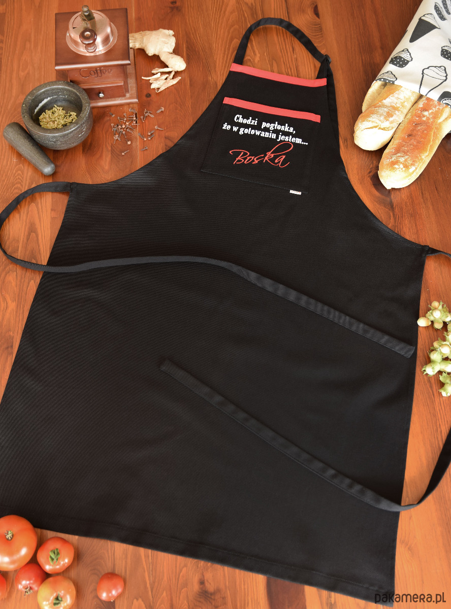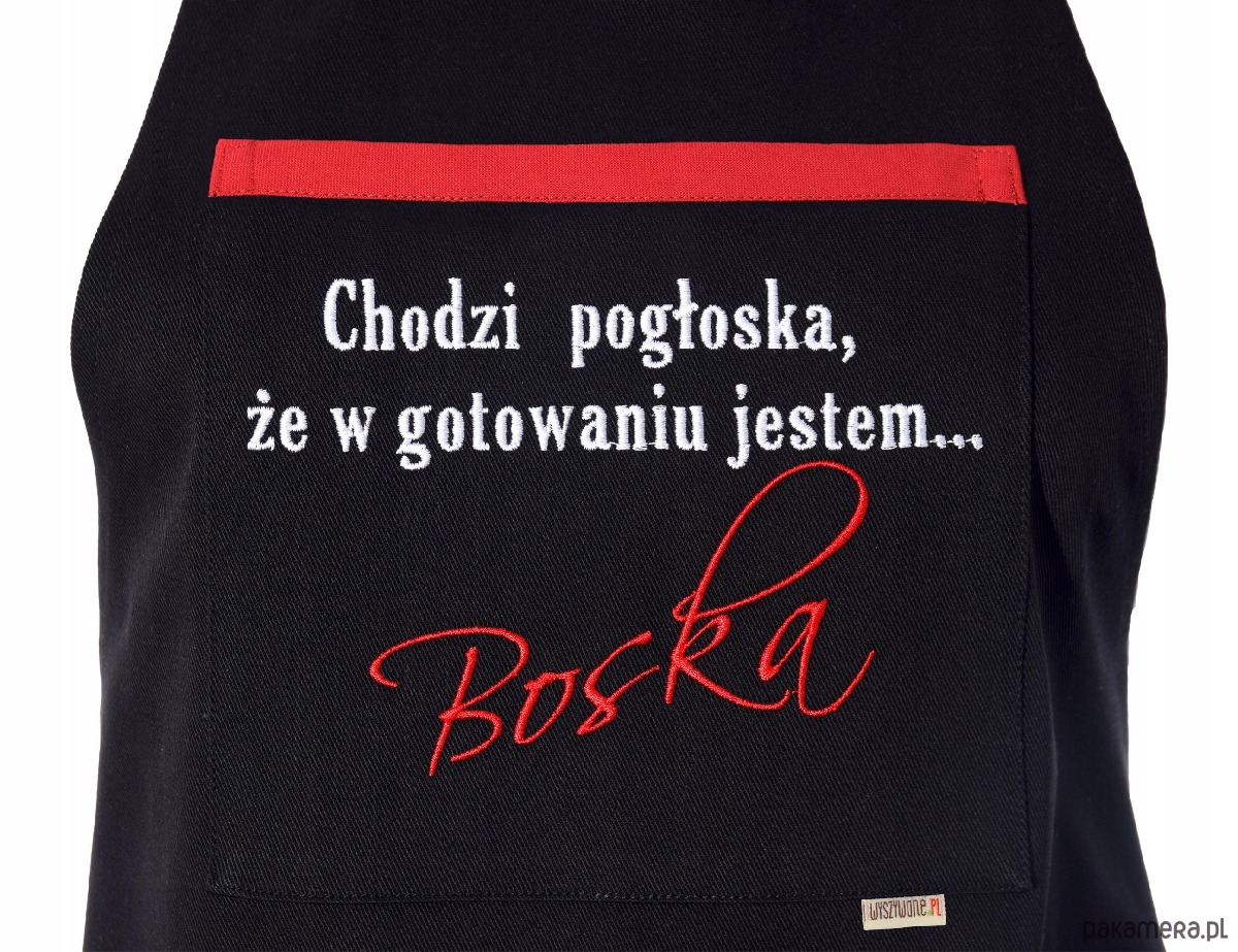 Największym atutem jest umieszczona w górnej części kieszeń z precyzyjnym haftem komputerowym. Napis „Chodzi pogłoska, że w gotowaniu jestem… Boska” wykonano białą i czerwoną nicią, co tworzy stylowy kontrast z głęboką czernią materiału. To nie tylko praktyczny element odzieży, ale i pewność siebie serwowana przy każdym posiłku!