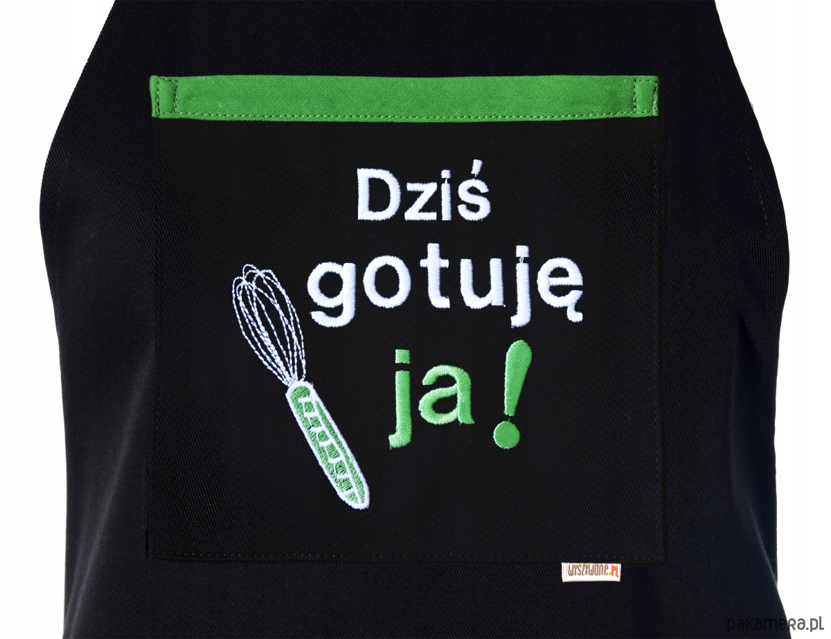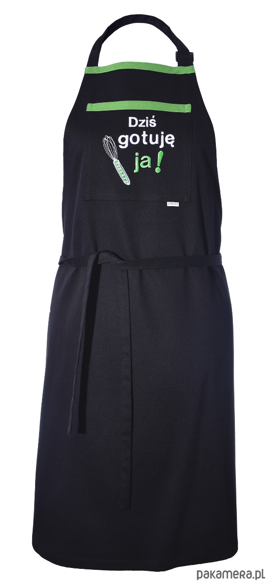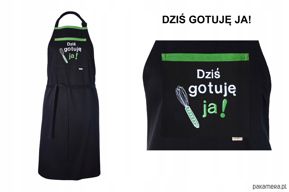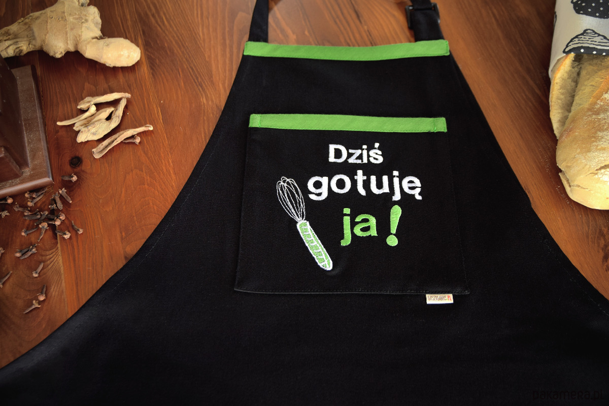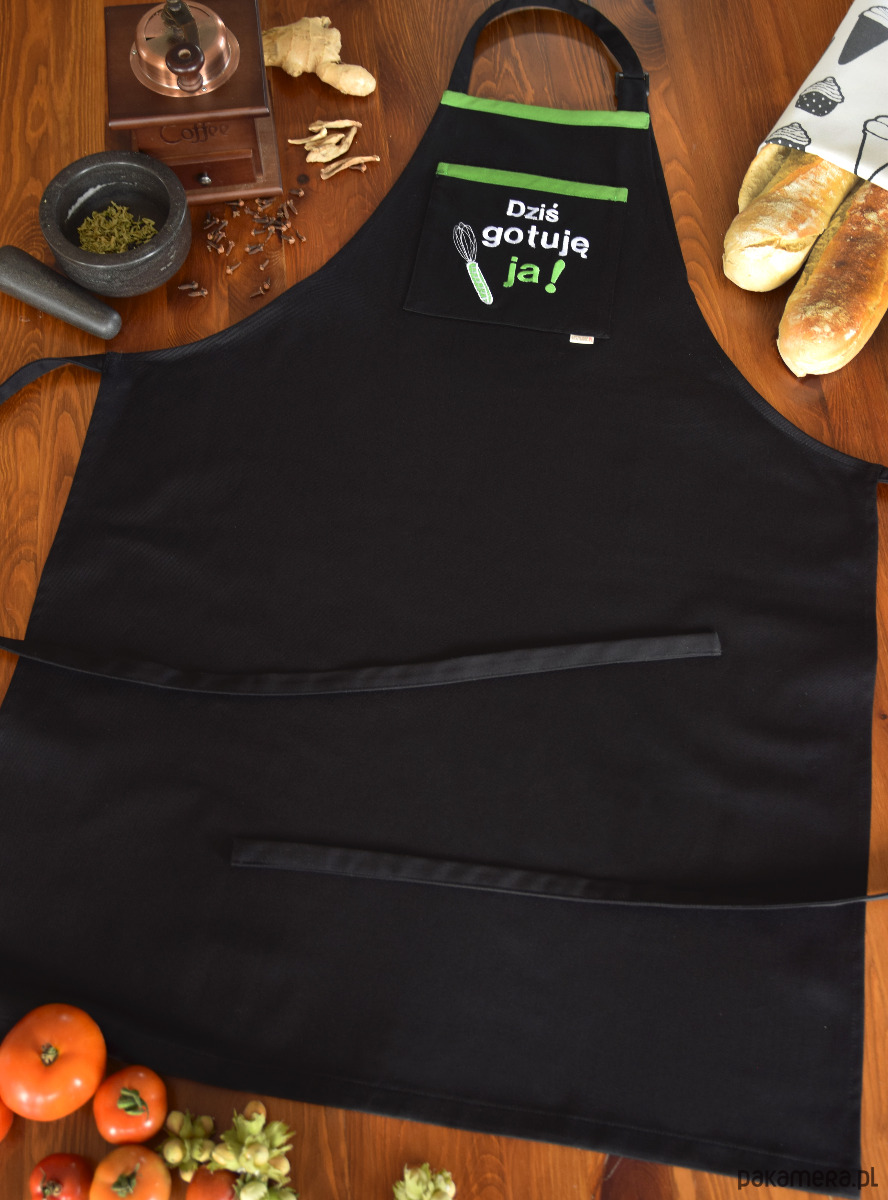 Centralnym punktem fartucha jest praktyczna kieszeń z wysokiej jakości haftem komputerowym. Napis „Dziś gotuję ja!” w towarzystwie haftowanej trzepaczki w soczystym, zielonym kolorze, jasno komunikuje, kto tu rządzi. Zielona lamówka przy kieszeni dodaje całości nowoczesnego, energetycznego charakteru.