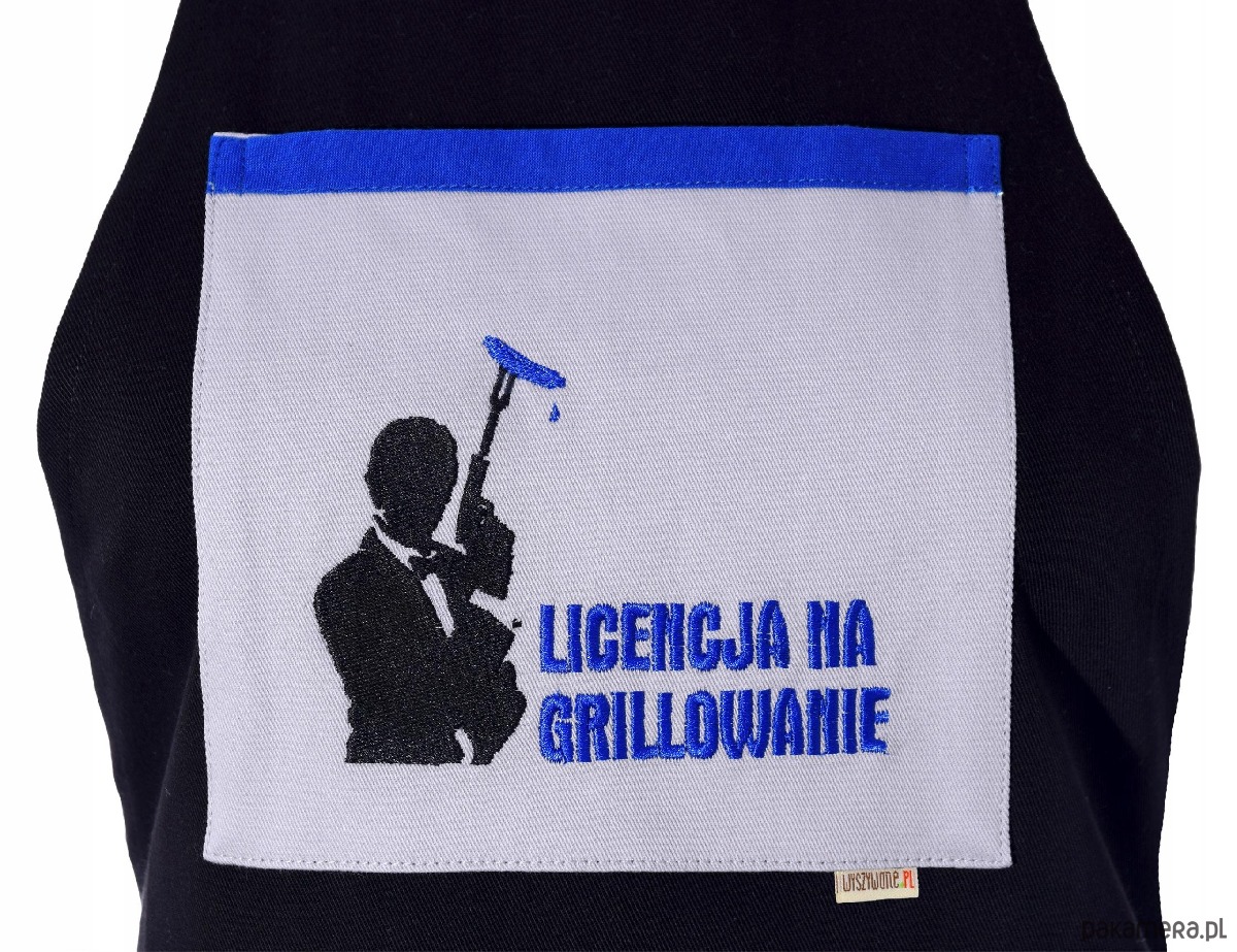 Na froncie znajduje się praktyczna kieszeń z precyzyjnym haftem. Napis „LICENCJA NA GRILLOWANIE” wraz z grafiką akcesoriów grillowych nadaje mu profesjonalny charakter. Brązowa lamówka kieszeni idealnie dopełnia stylistykę haftu. Dzięki regulowanej szelce i uniwersalnemu rozmiarowi, fartuch świetnie leży na każdej sylwetce.