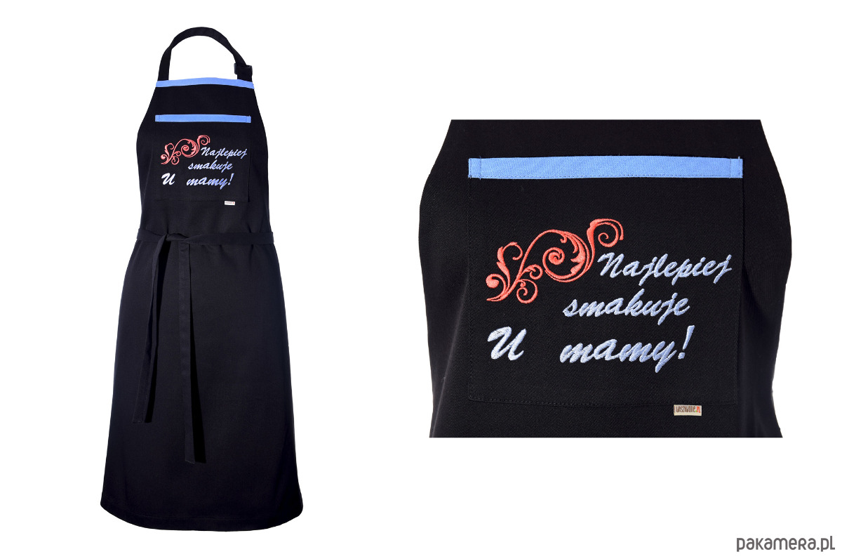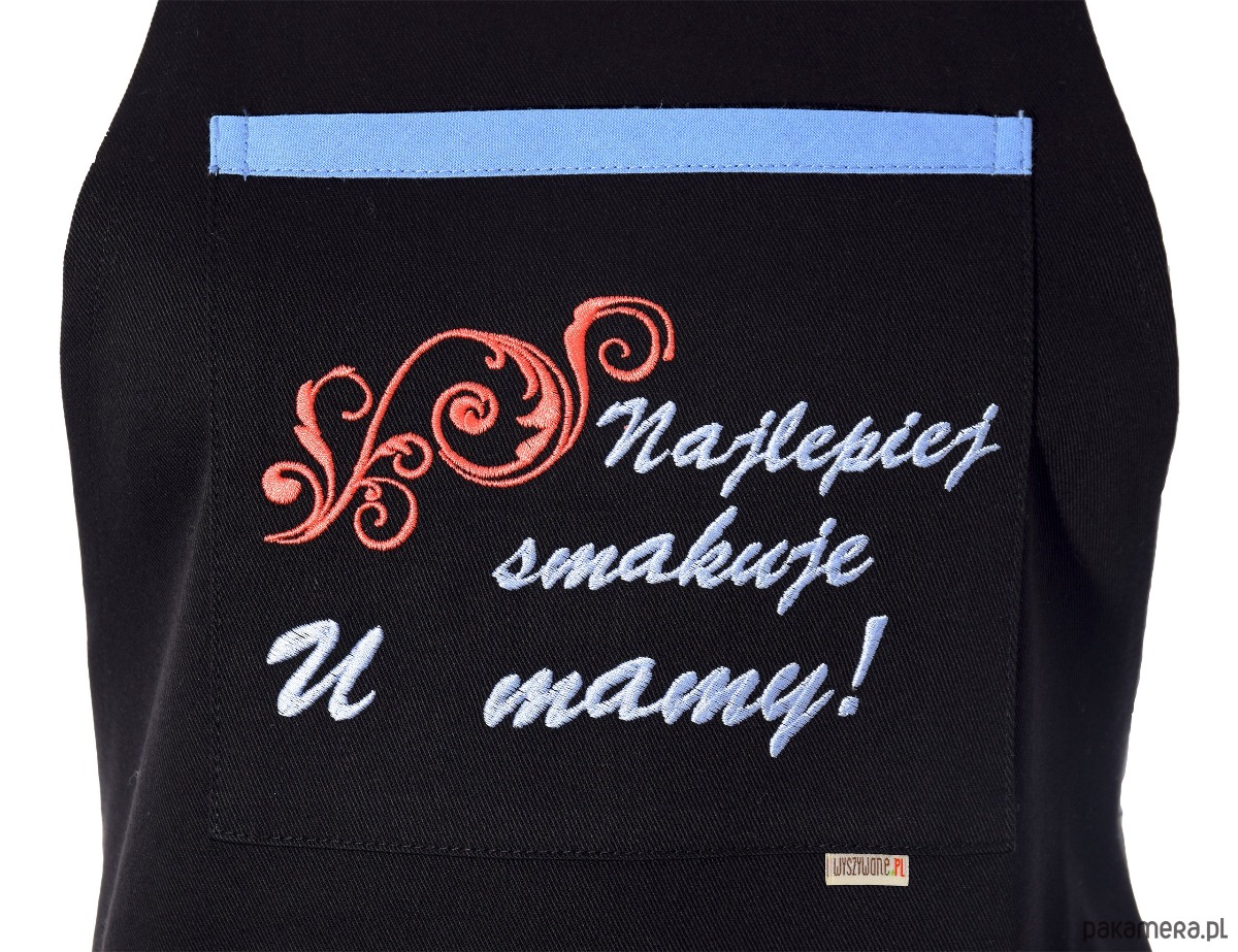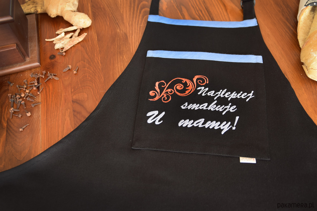 To, co wyróżnia ten model, to ozdobna kieszeń z bogatym haftem komputerowym. Napis „Najlepiej smakuje u mamy!” wraz z subtelnym ornamentem w odcieniach błękitu i koralu tworzy harmonijną całość z błękitną lamówką. Haft jest trwały, nie blaknie i nadaje produktowi ekskluzywnego charakteru.