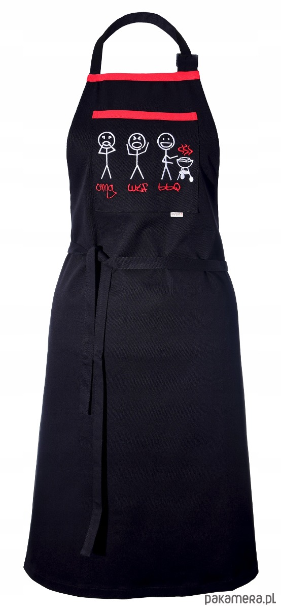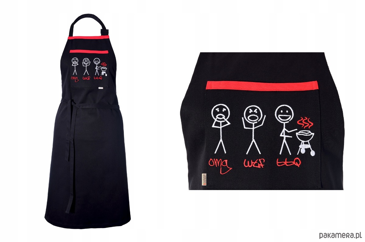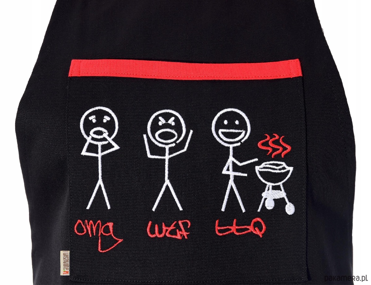 To, co wyróżnia ten model, to komiksowa kieszeń z unikalnym haftem komputerowym. Seria zabawnych postaci obrazujących emocje (OMG, WTF) oraz radość z grillowania (BBQ) przyciągnie wzrok każdego gościa. Wyrazisty czerwony haft i dopasowana lamówka na czarnym tle nadają całości nowoczesnego, nieco "zadziornego" charakteru.