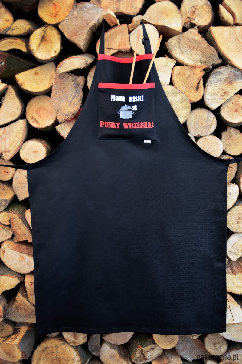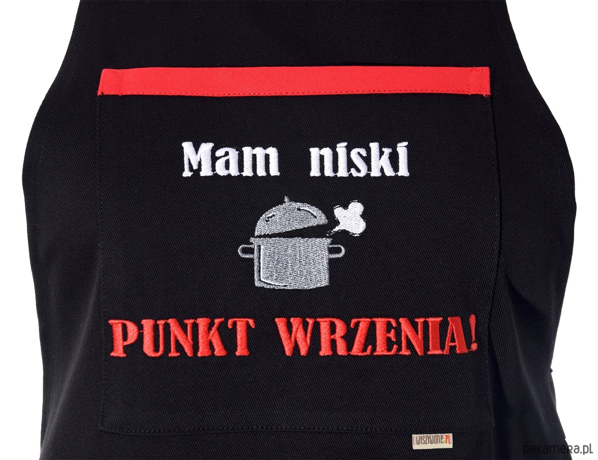 W centralnej części znajduje się praktyczna kieszeń z wyrazistym haftem komputerowym. Napis „Mam niski PUNKT WRZENIA!” wraz z grafiką dymiącego garnka to dekoracja, która nie spiera się i zachowuje intensywne kolory przez lata. Czerwona lamówka i czerwone elementy haftu świetnie kontrastują z czarnym tłem.